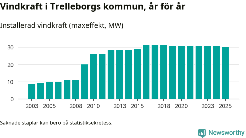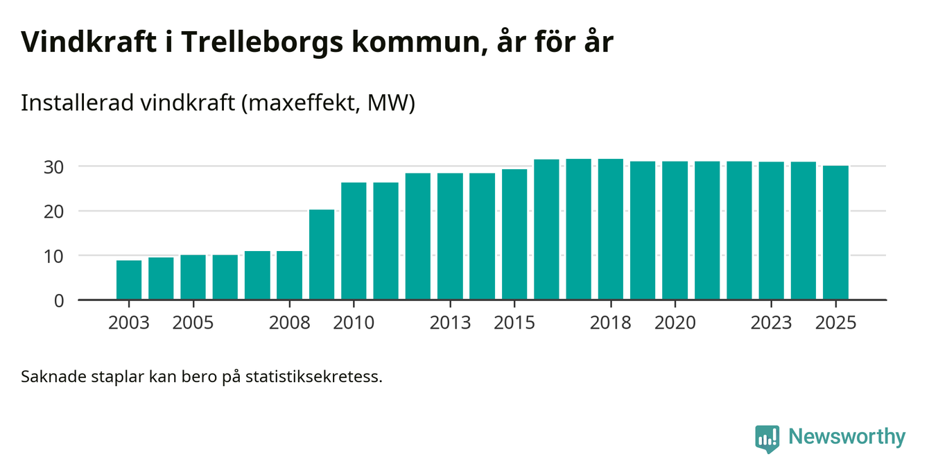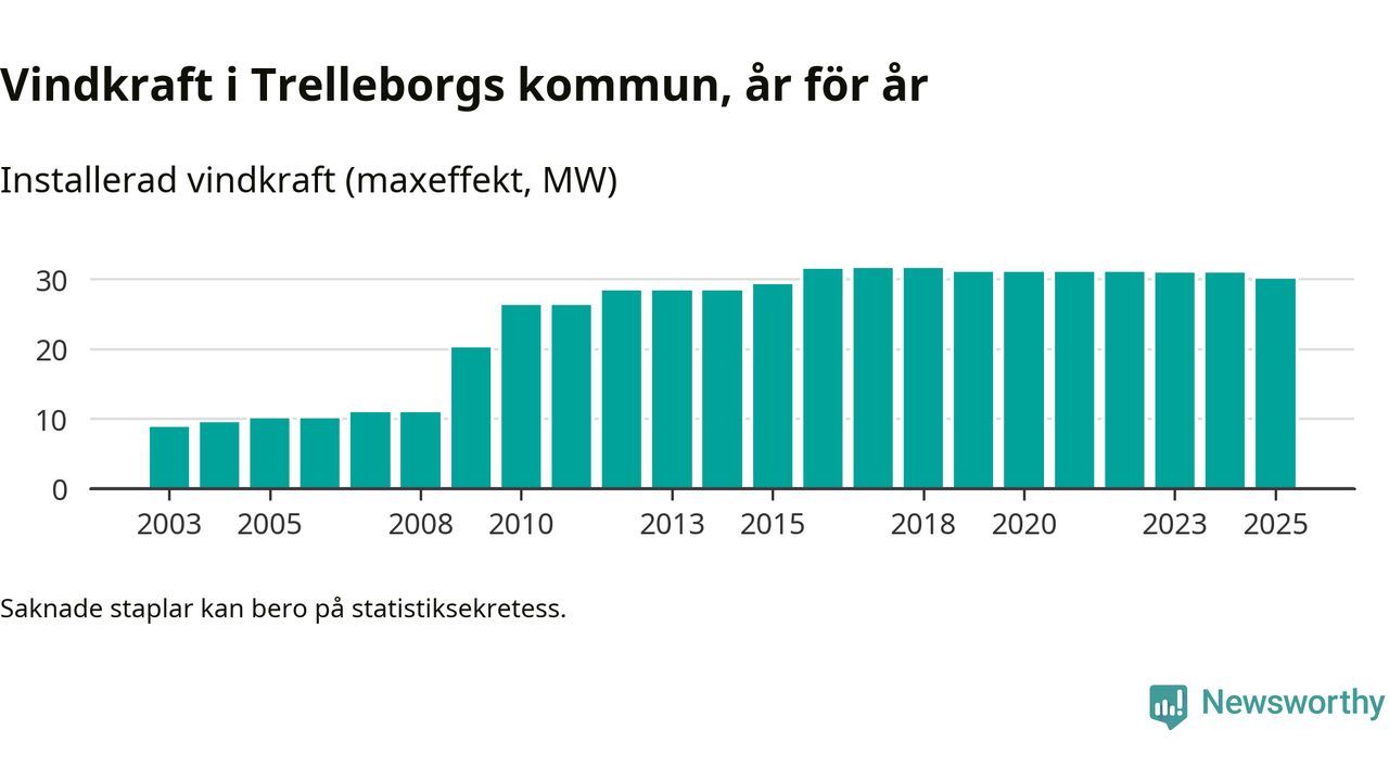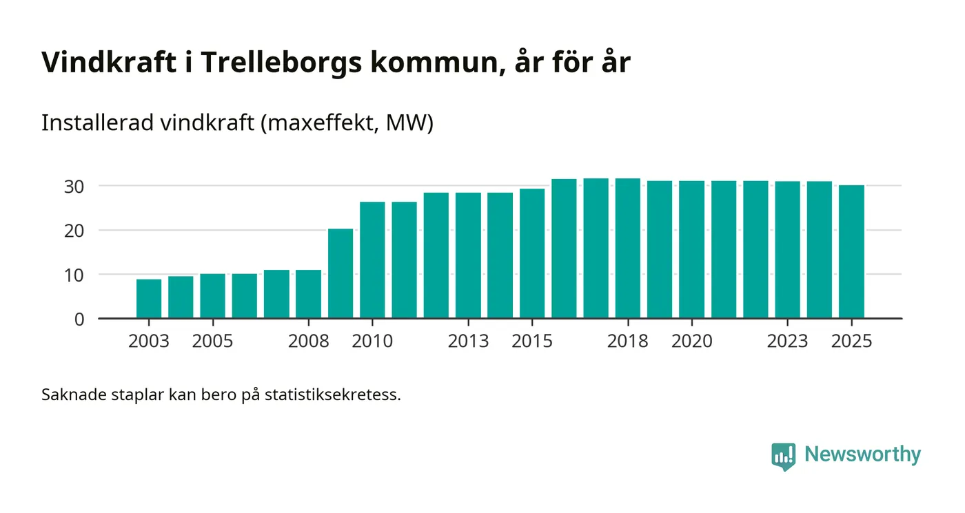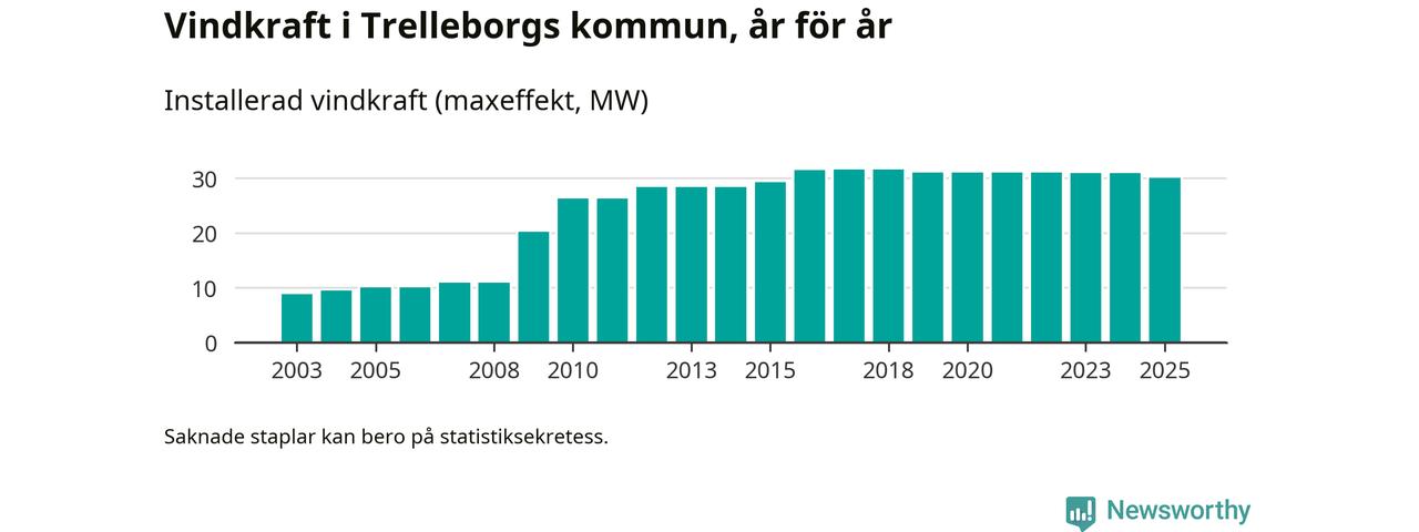 Totalt fanns i slutet av förra året 27 vindkraftverk i Trelleborgs kommun, med en sammanlagd maxeffekt på 30 megawatt. Det är en minskning med 0,9 megawatt 1, jämfört med året innan. Det visar nya siffror från Energimyndigheten.
