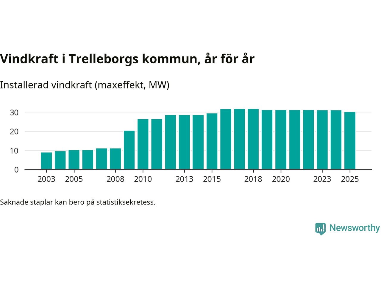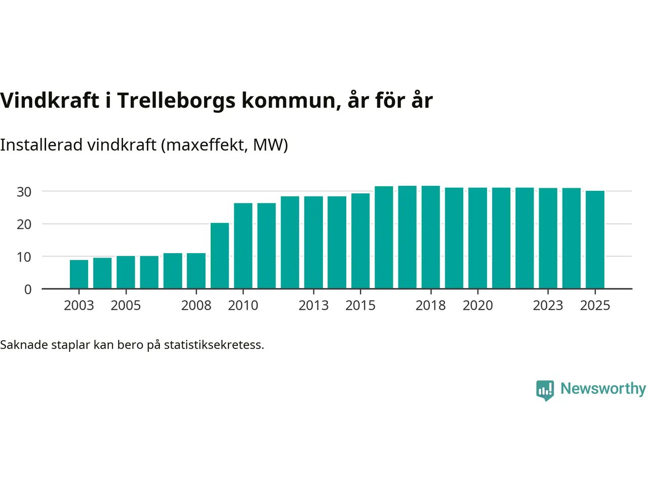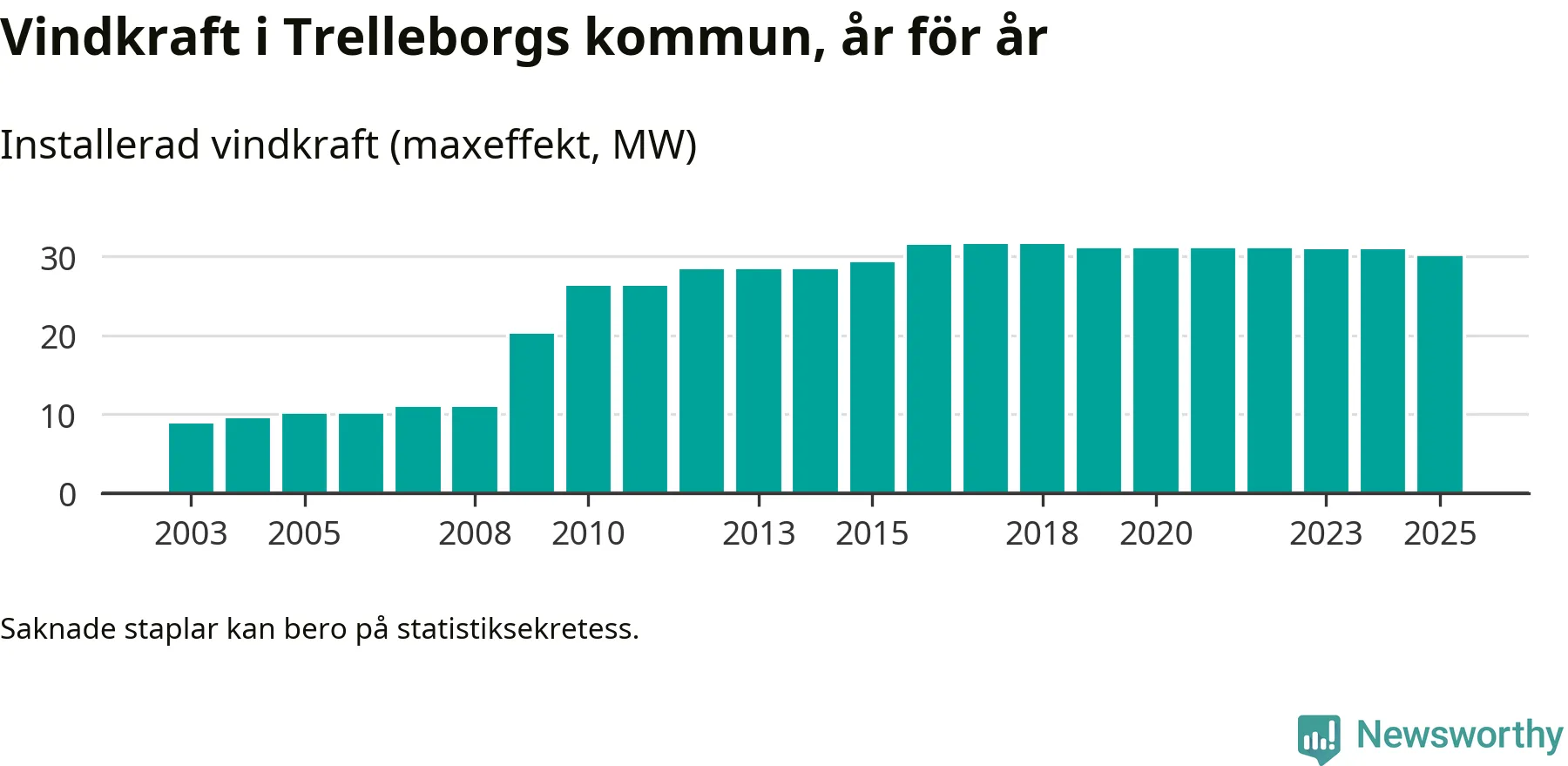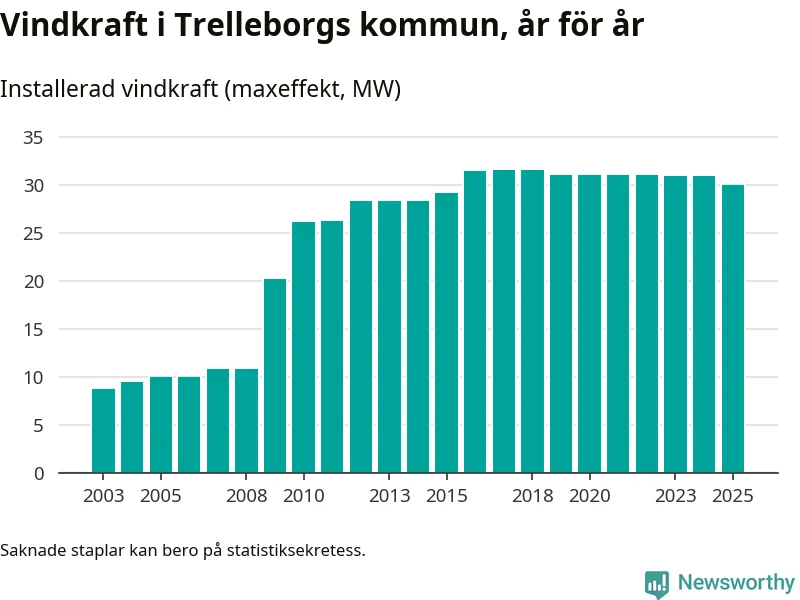 Totalt fanns i slutet av förra året 27 vindkraftverk i Trelleborgs kommun, med en sammanlagd maxeffekt på 30 megawatt. Det är en minskning med 0,9 megawatt 1, jämfört med året innan. Det visar nya siffror från Energimyndigheten.