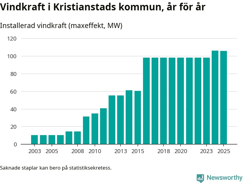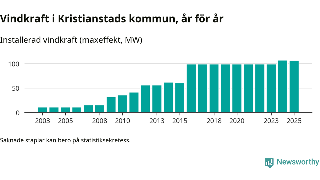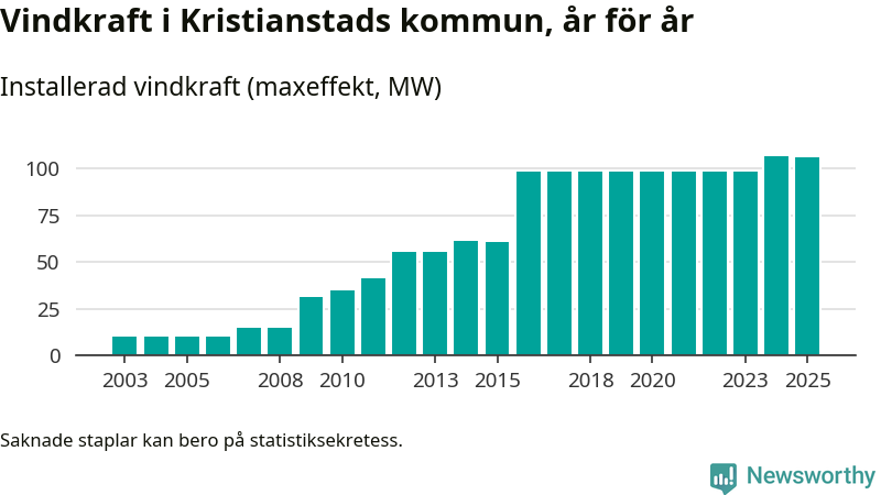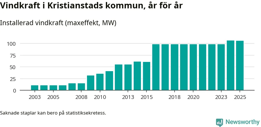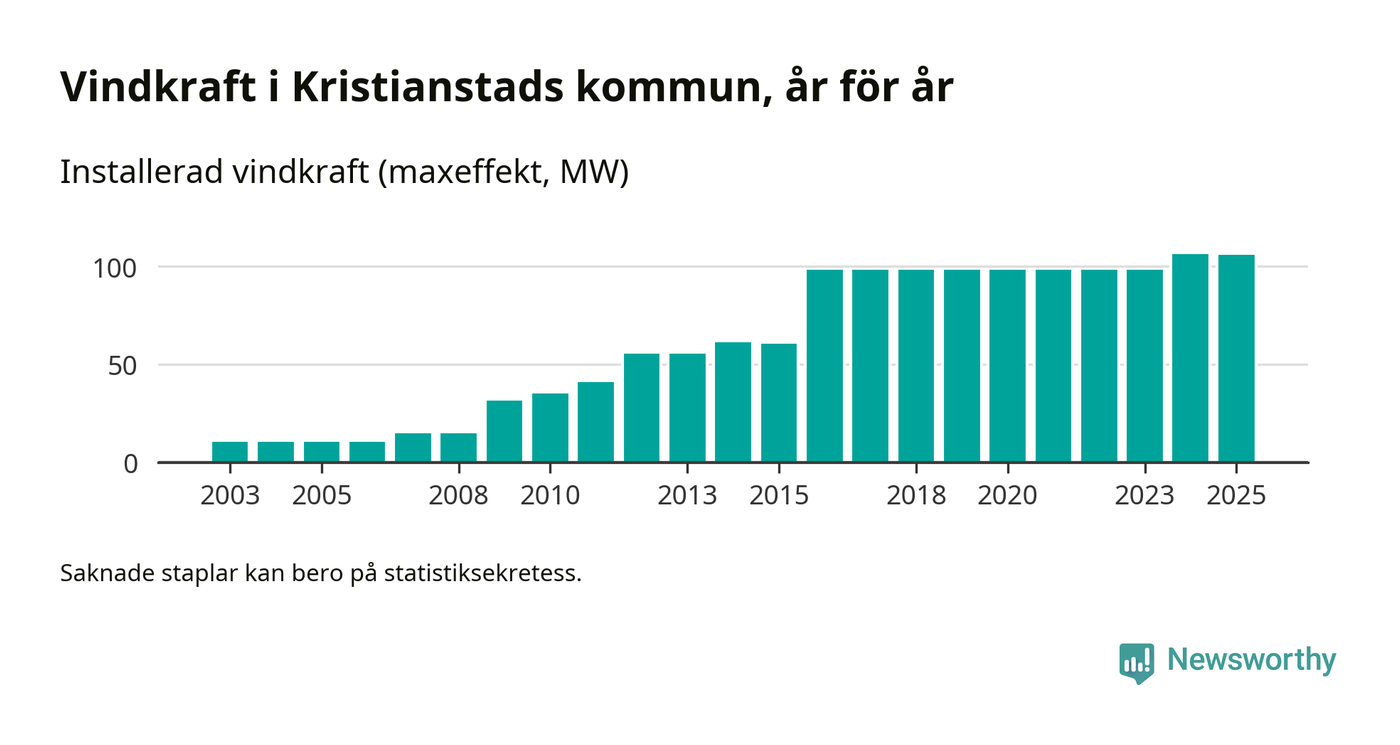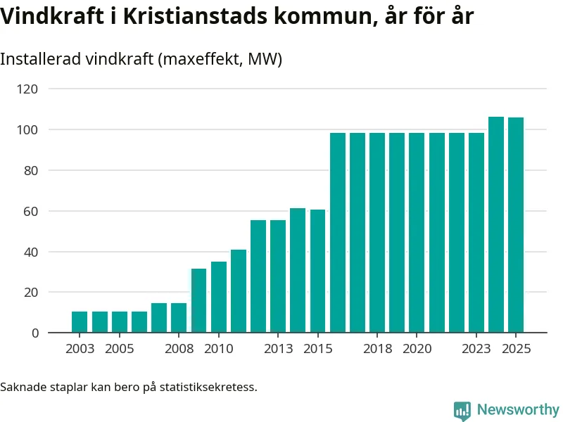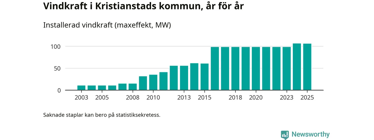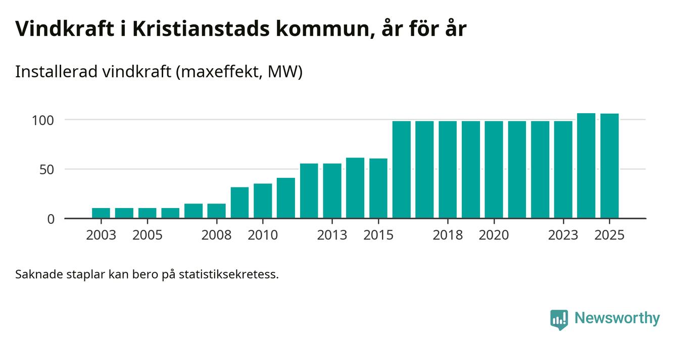 Totalt fanns i slutet av förra året 61 vindkraftverk i Kristianstads kommun, med en sammanlagd maxeffekt på 106 megawatt. Det visar nya siffror från Energimyndigheten.