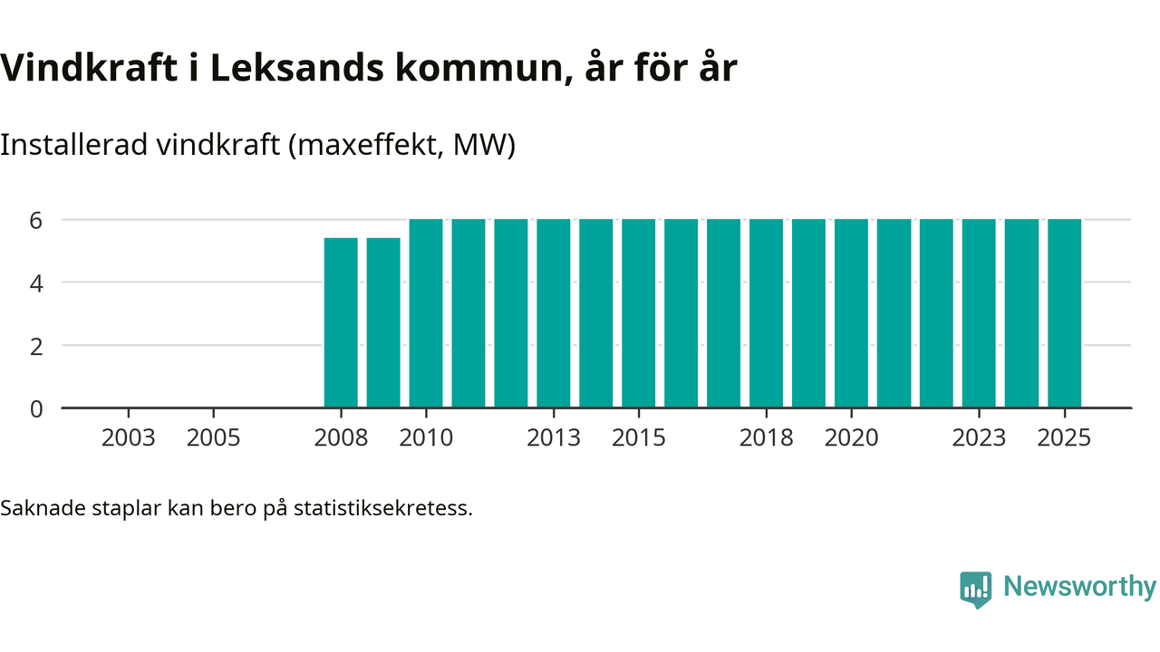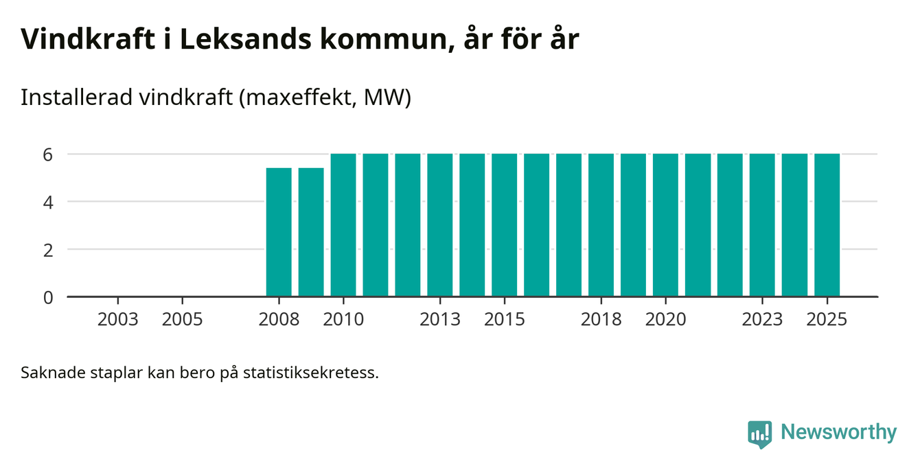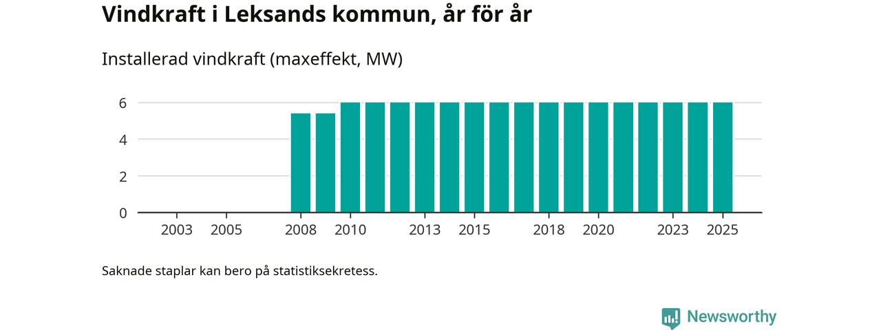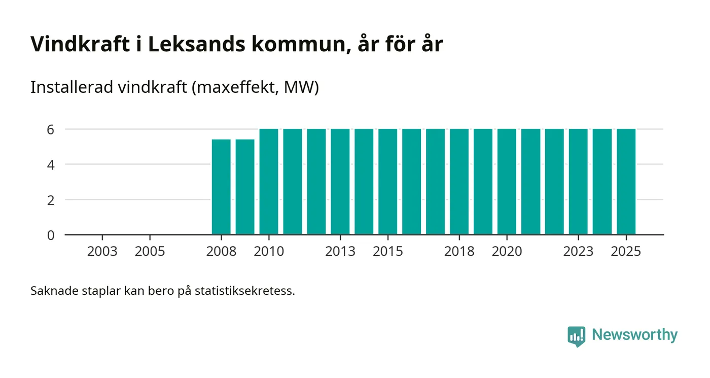 Totalt fanns i slutet av förra året tre vindkraftverk i Leksands kommun, med en sammanlagd maxeffekt på 6 megawatt. Det är, för 15:e året i rad, oförändrade siffror jämfört med året innan. Det visar nya siffror från Energimyndigheten.