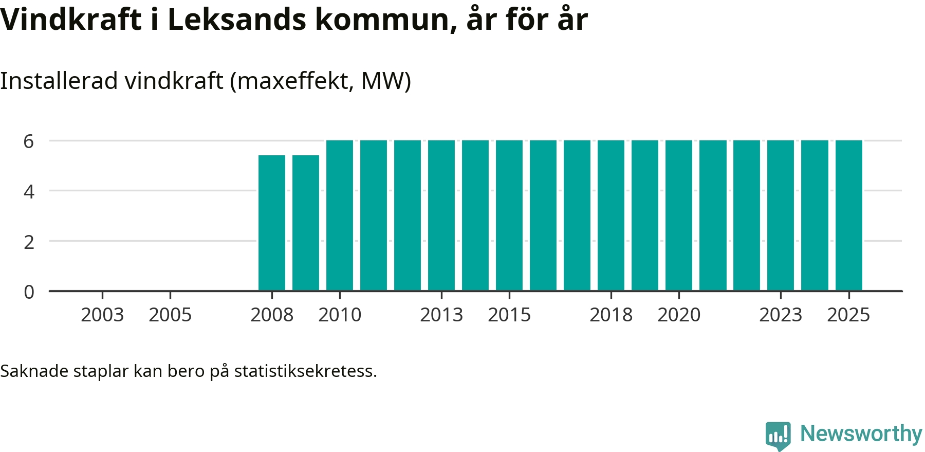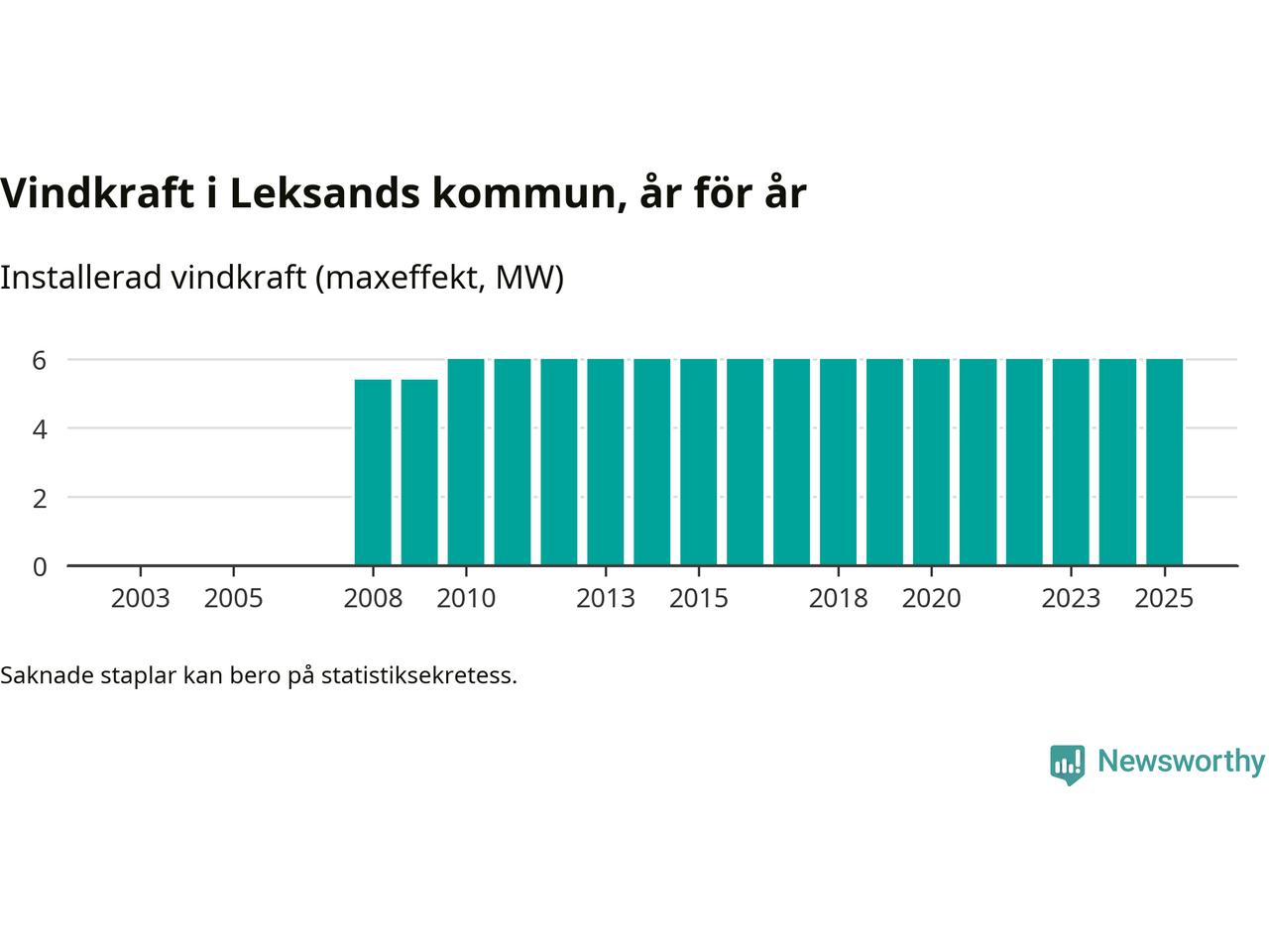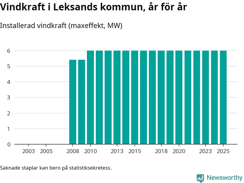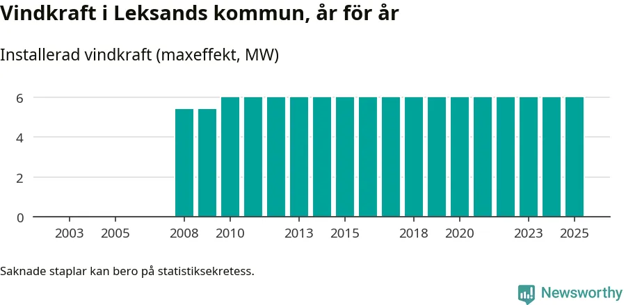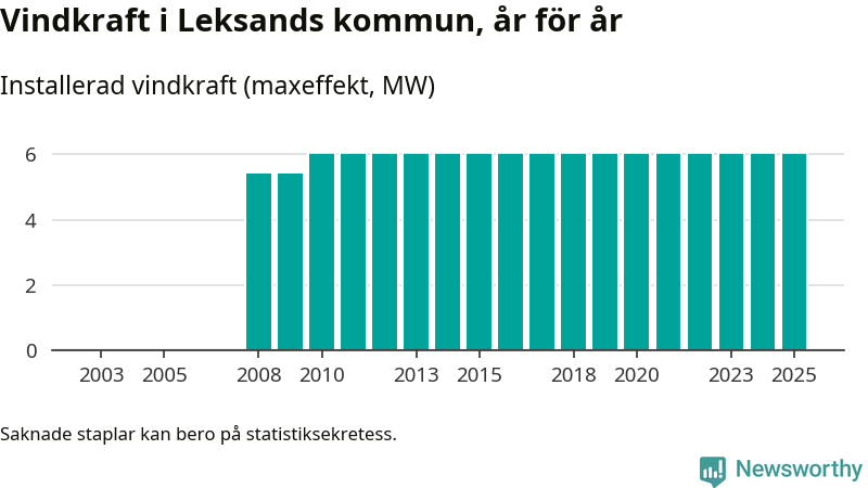 Totalt fanns i slutet av förra året tre vindkraftverk i Leksands kommun, med en sammanlagd maxeffekt på 6 megawatt. Det är, för 15:e året i rad, oförändrade siffror jämfört med året innan. Det visar nya siffror från Energimyndigheten.