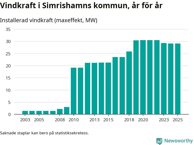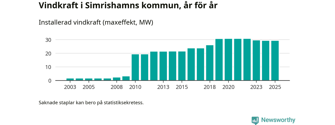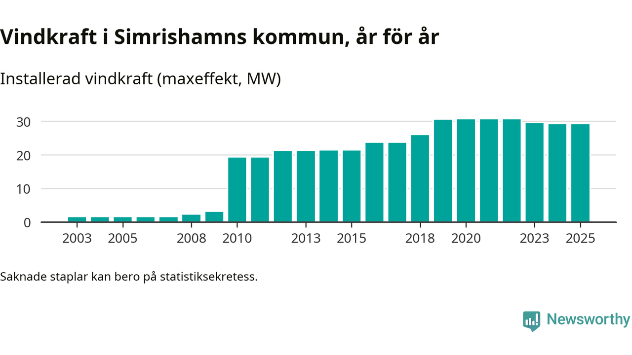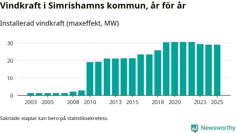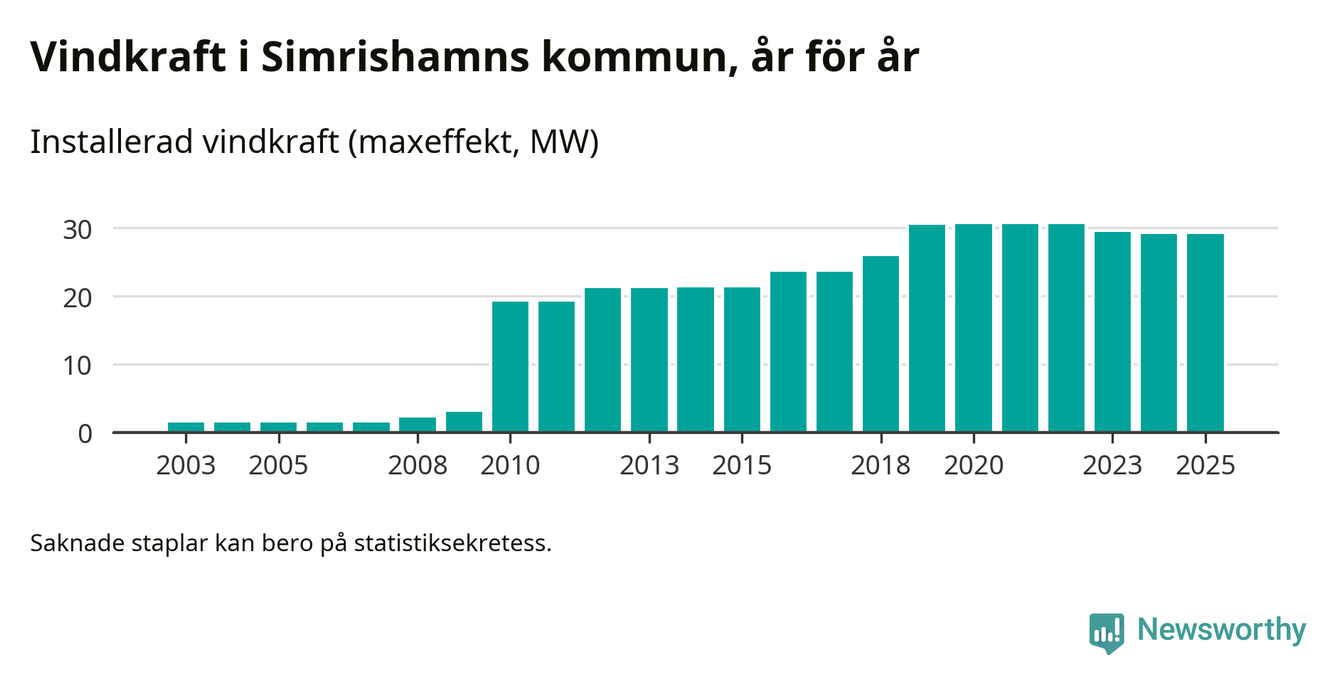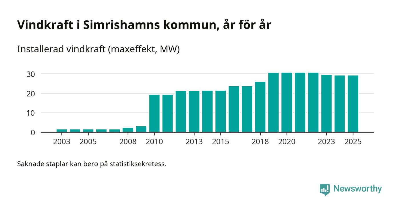 Totalt fanns i slutet av förra året 23 vindkraftverk i Simrishamns kommun, med en sammanlagd maxeffekt på 29 megawatt. Det är oförändrade siffror jämfört med året innan. Det visar nya siffror från Energimyndigheten.