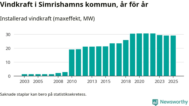 Det är bara ett femtontal kommuner i landet där vindkraftskapaciten rapporterats öka under 2025. Under hela den innevarande mandatperioden har ett 30-tal kommuner ökat den installerade effekten med totalt tre gigawatt, samtidigt som små minskningar skett i ett 20-tal kommuner. Totalt var utbyggnaden omkring 20 procent lägre under 2023–2025, än under motsvarande period förra mandatperioden.