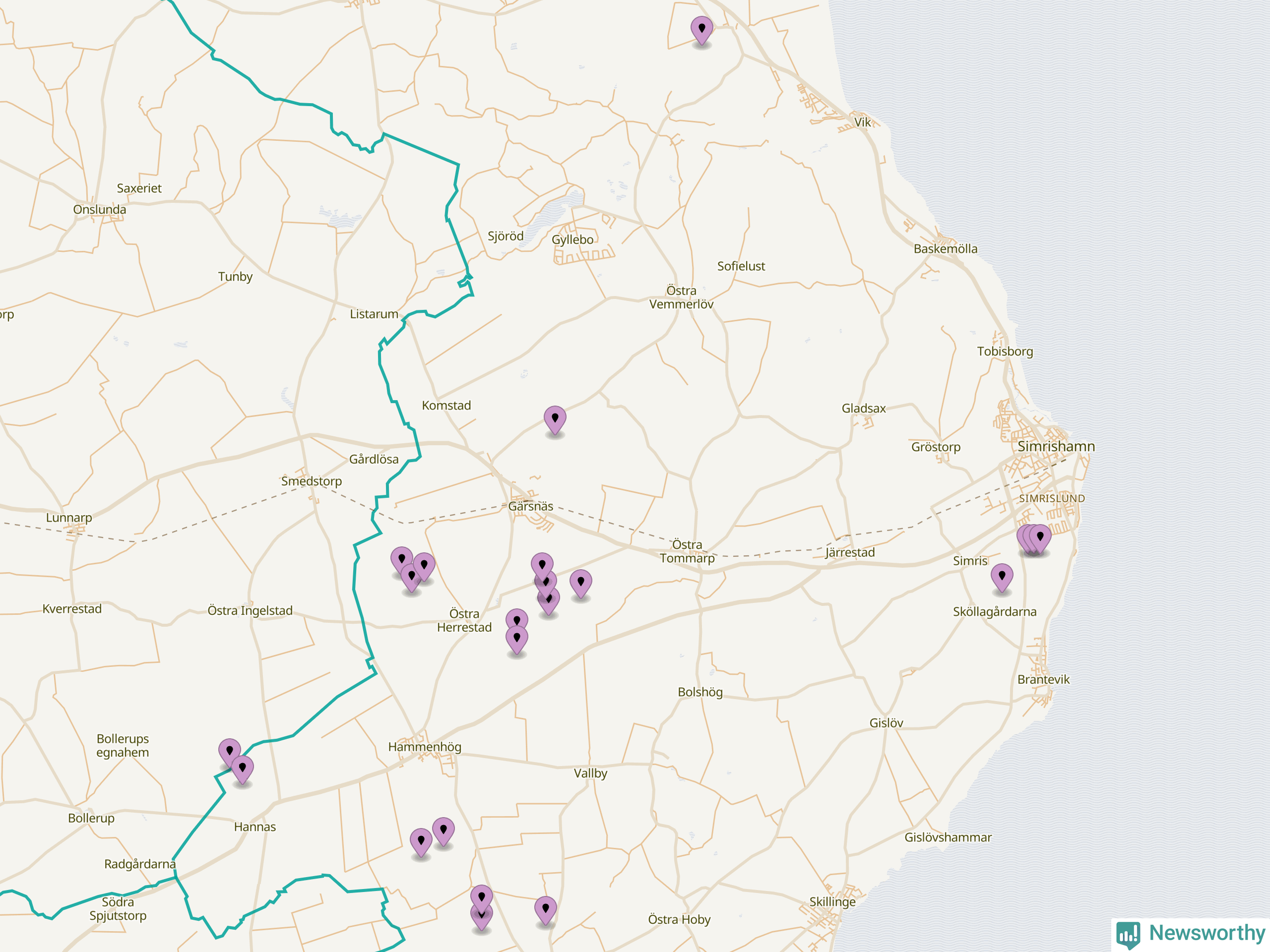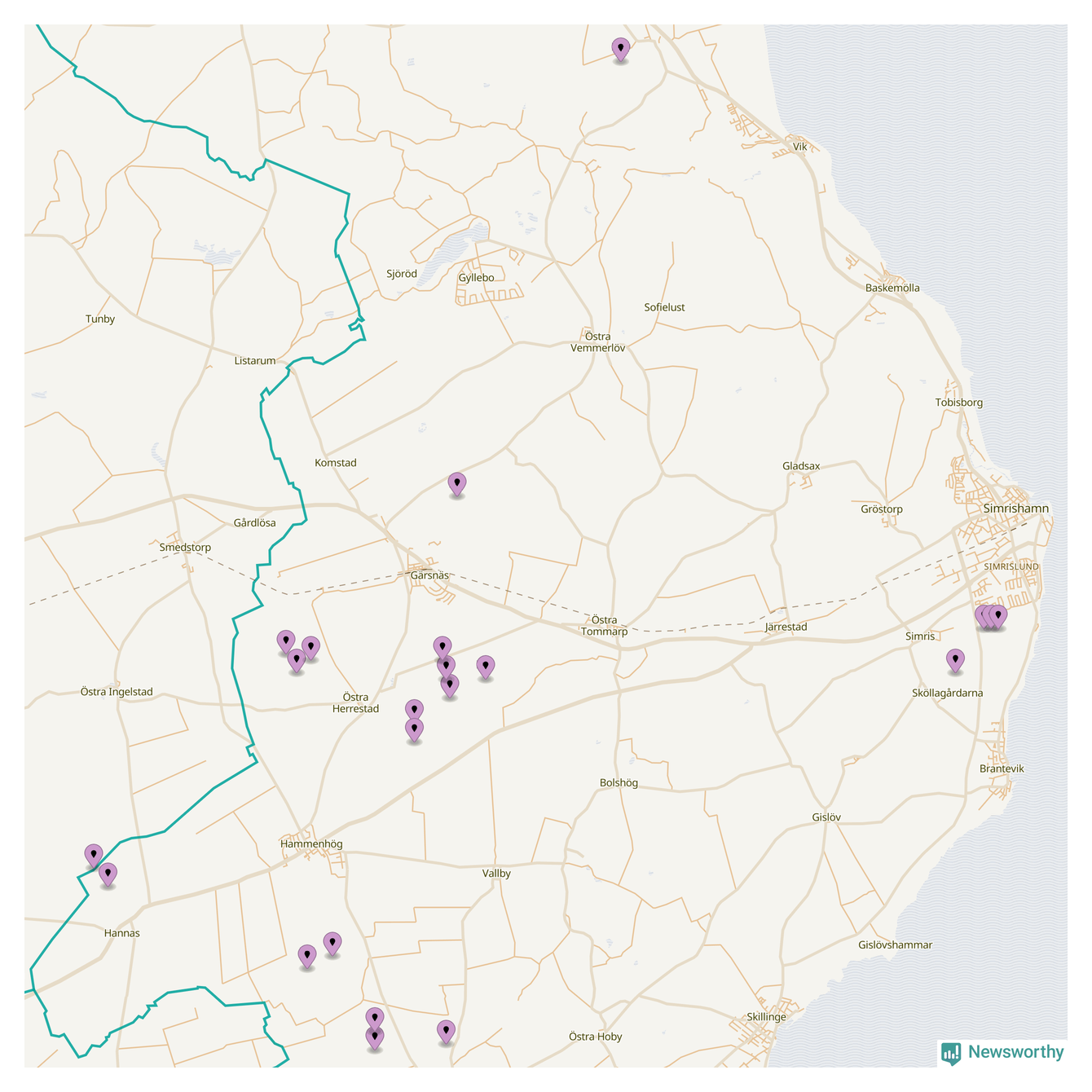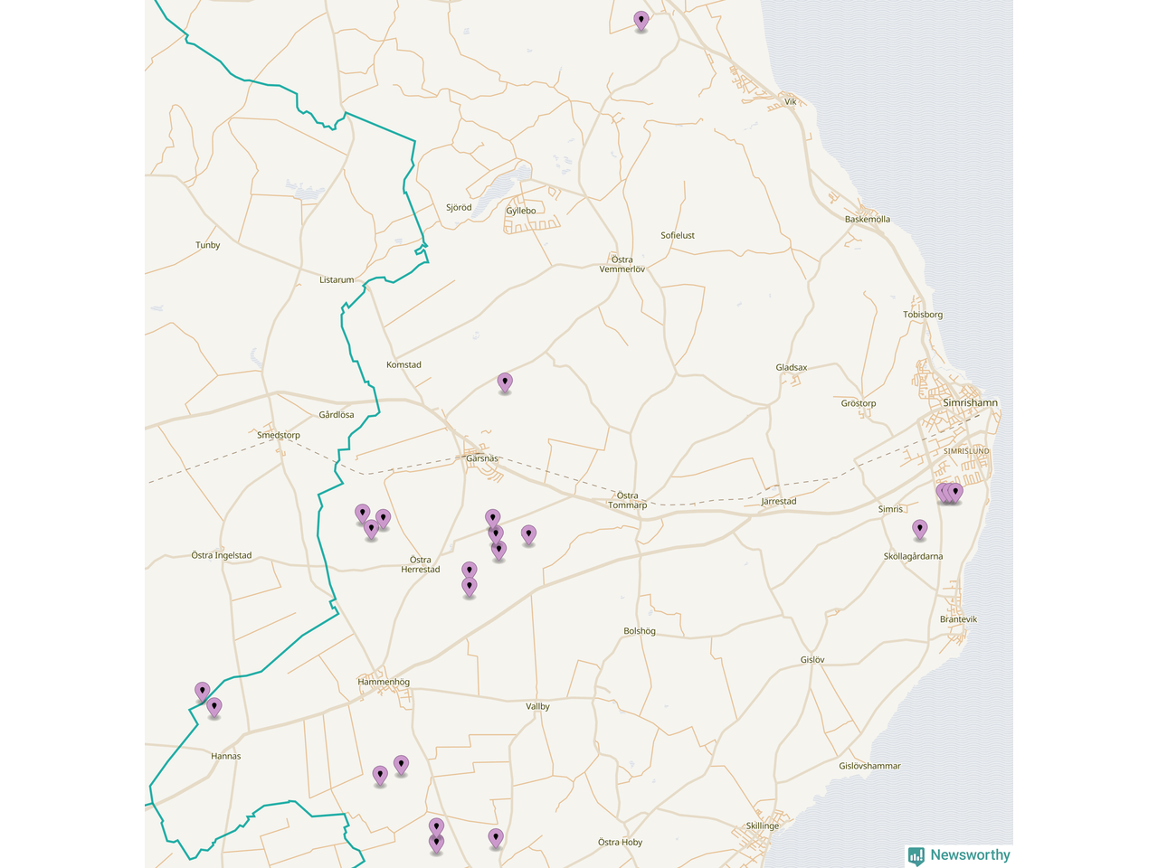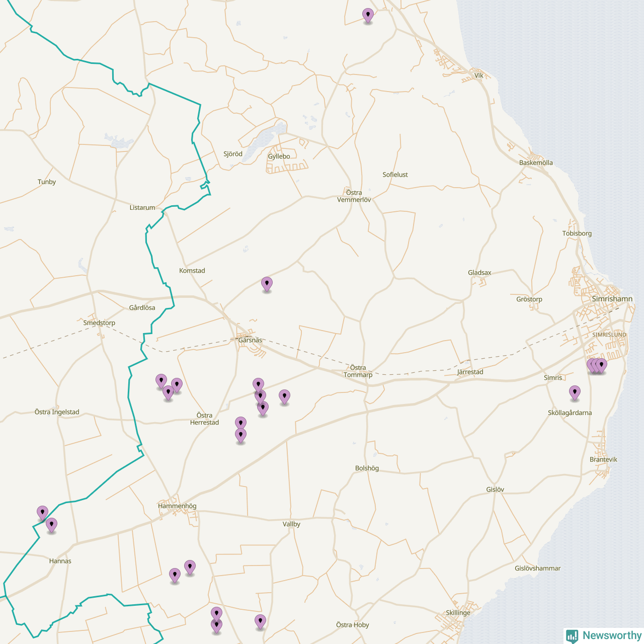 Karta över vindkraftverk i Simrishamns kommun