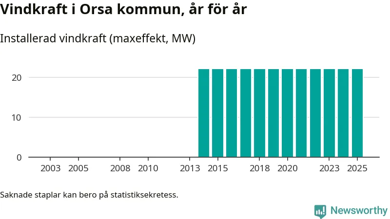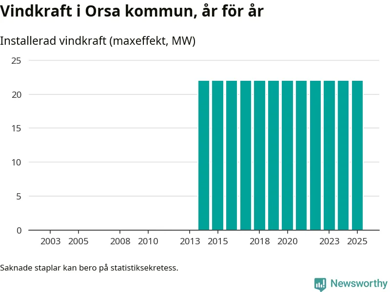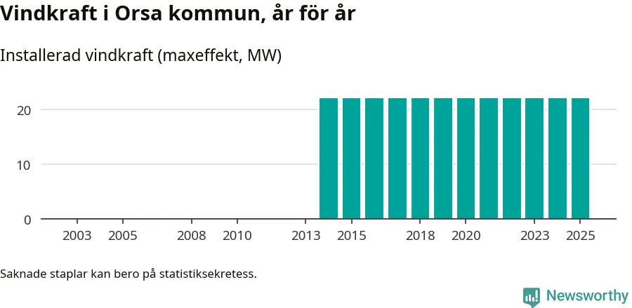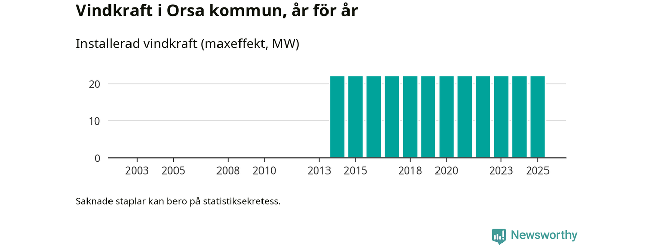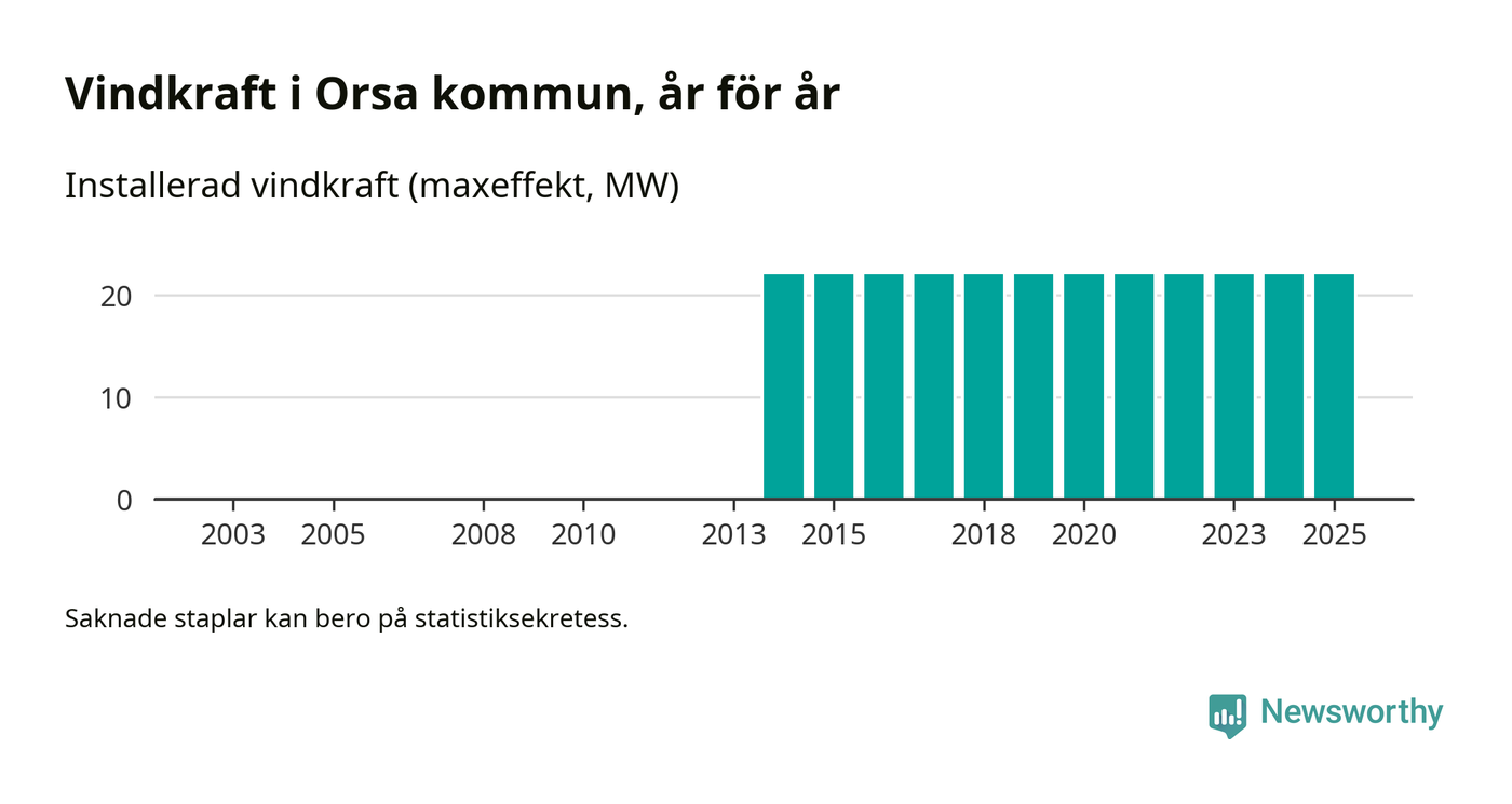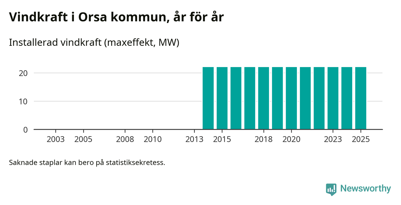 Totalt fanns i slutet av förra året elva vindkraftverk i Orsa kommun, med en sammanlagd maxeffekt på 22 megawatt. Det är, för elfte året i rad, oförändrade siffror jämfört med året innan. Det visar nya siffror från Energimyndigheten.