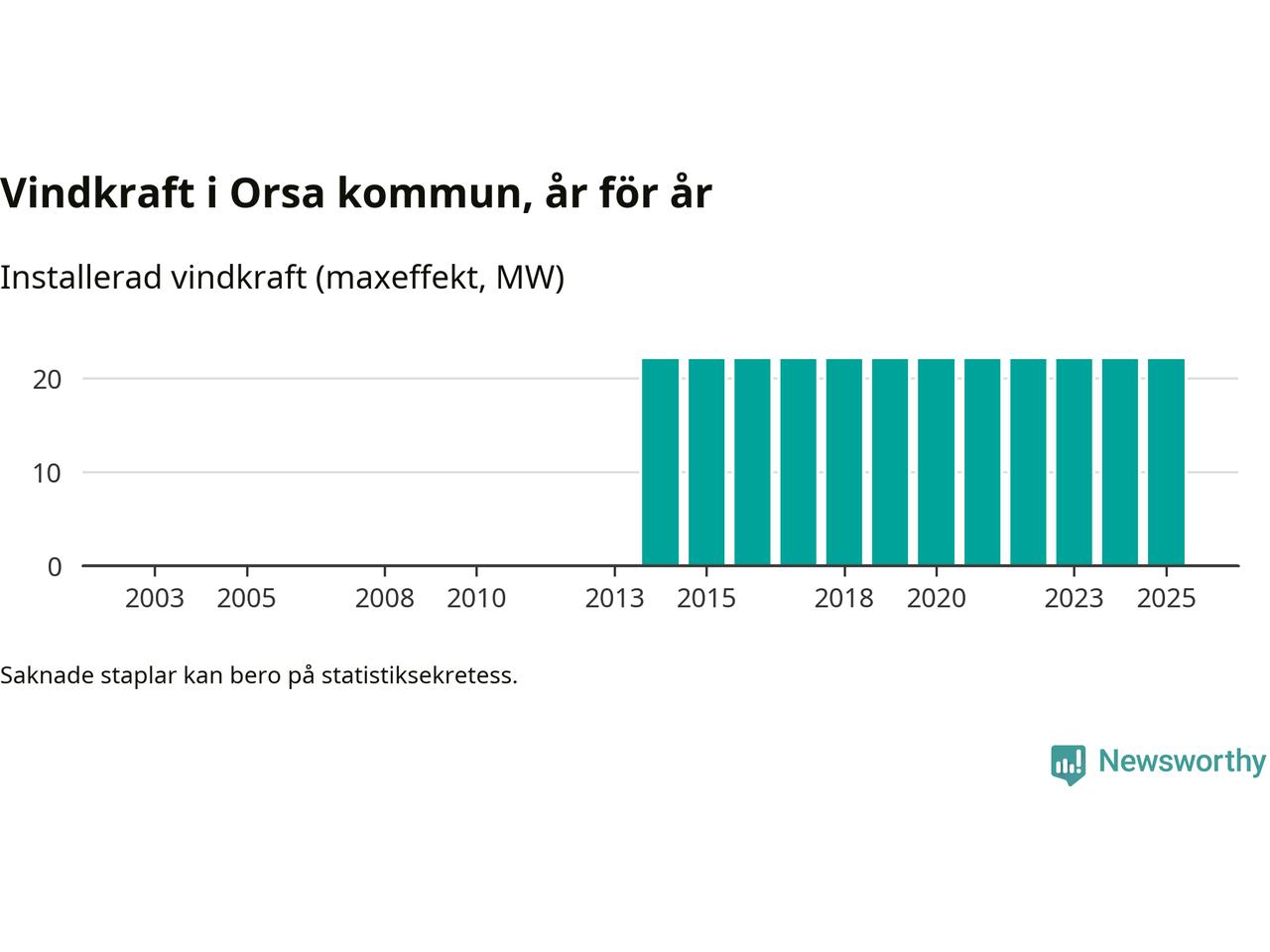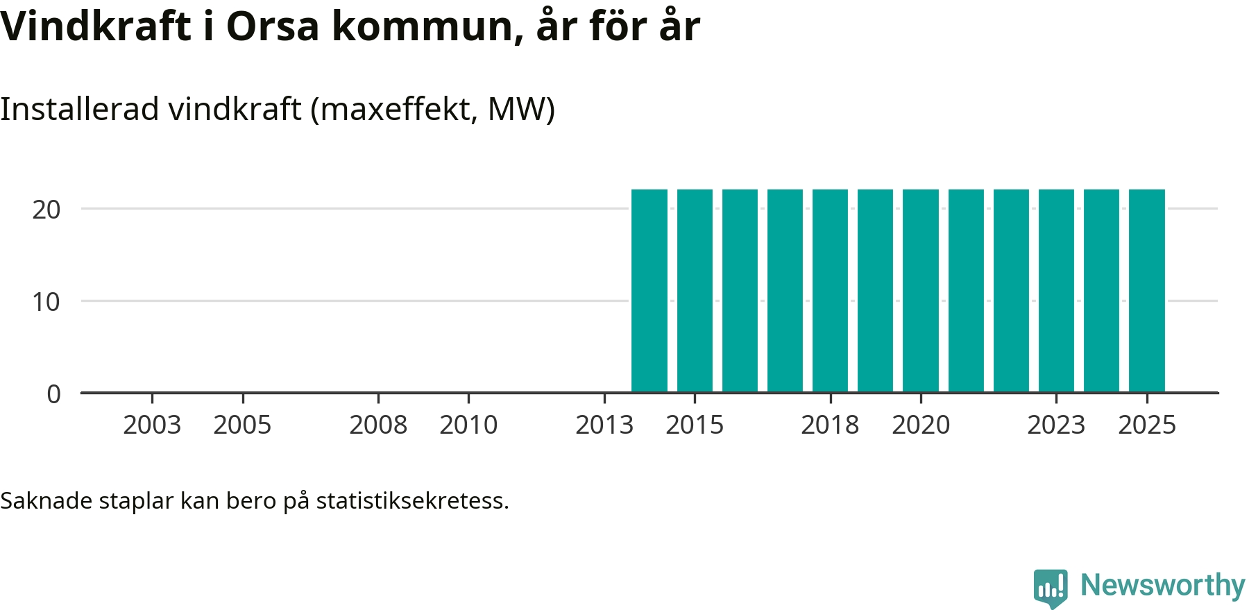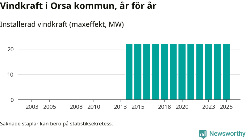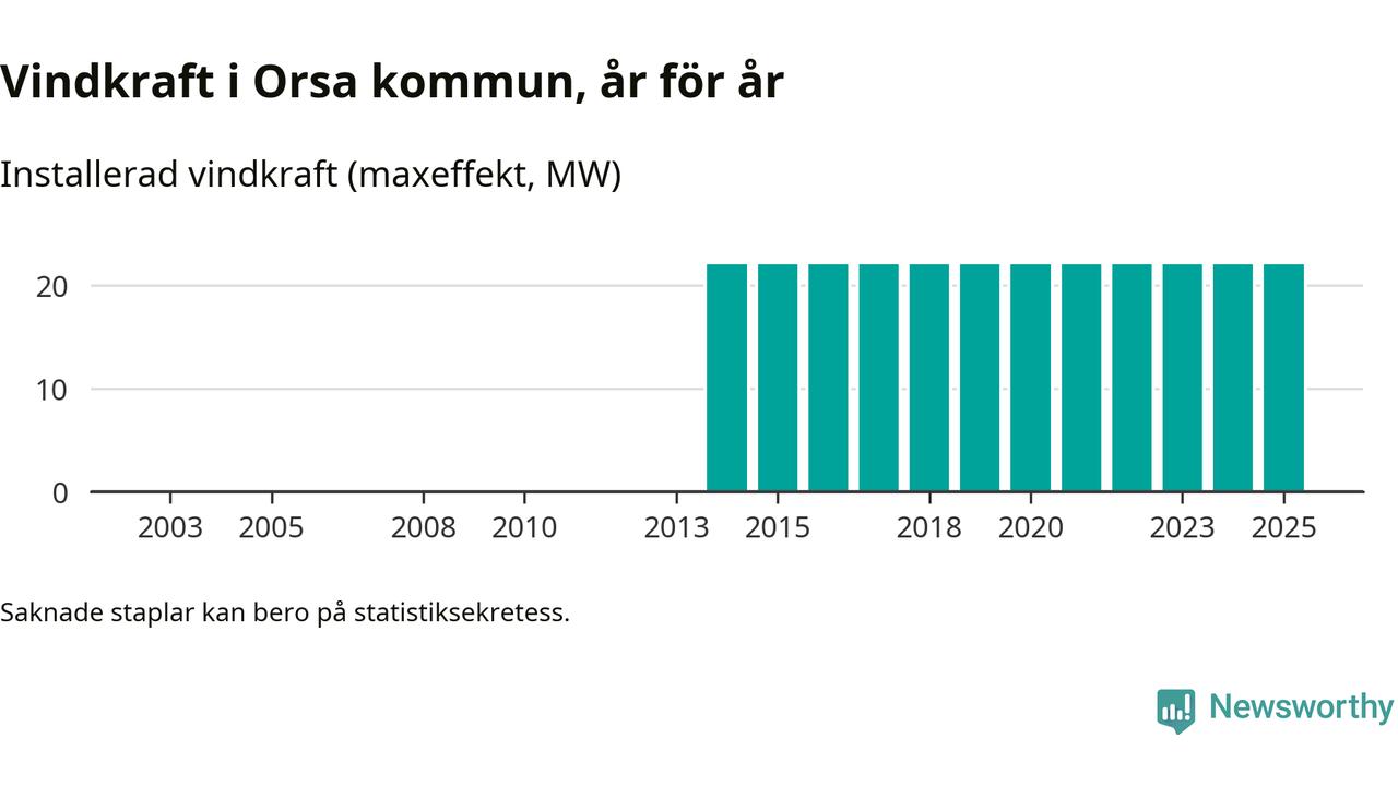 Totalt fanns i slutet av förra året elva vindkraftverk i Orsa kommun, med en sammanlagd maxeffekt på 22 megawatt. Det är, för elfte året i rad, oförändrade siffror jämfört med året innan. Det visar nya siffror från Energimyndigheten.