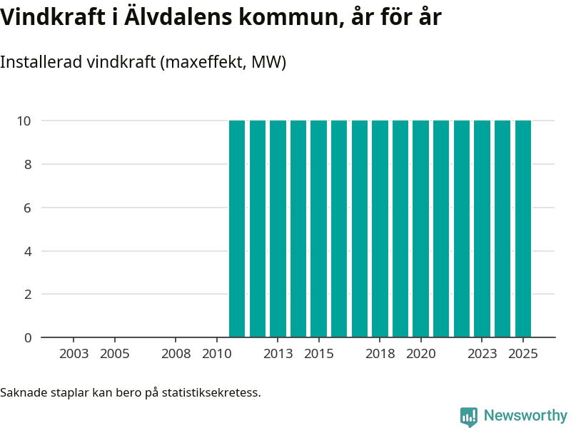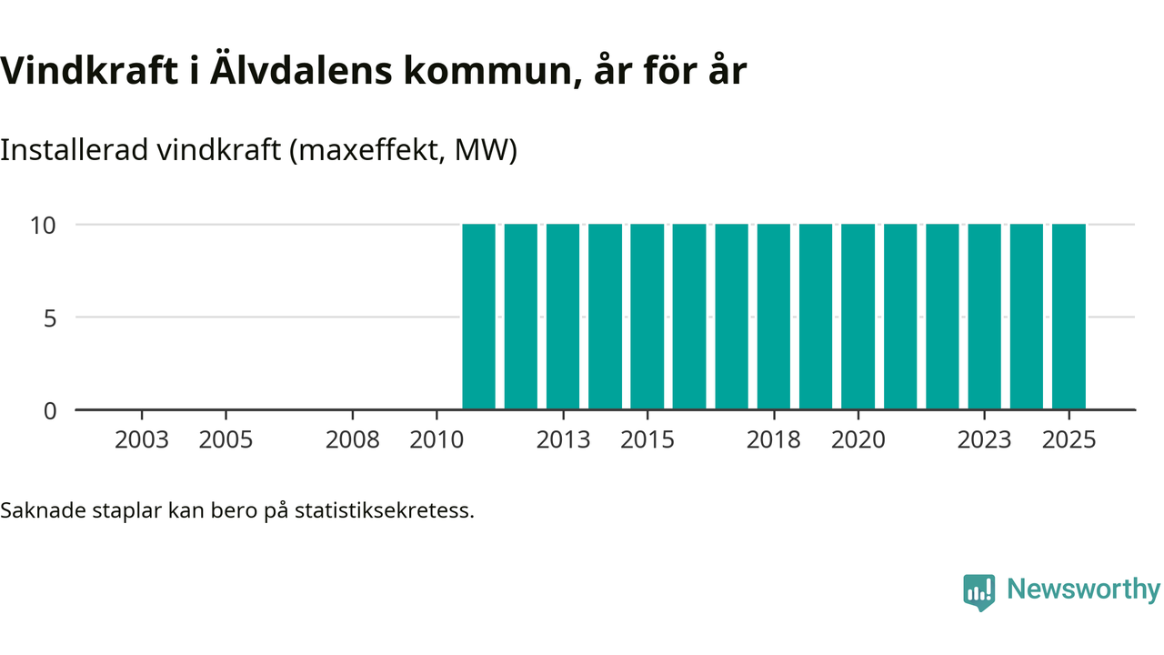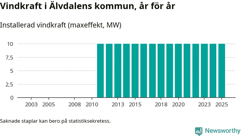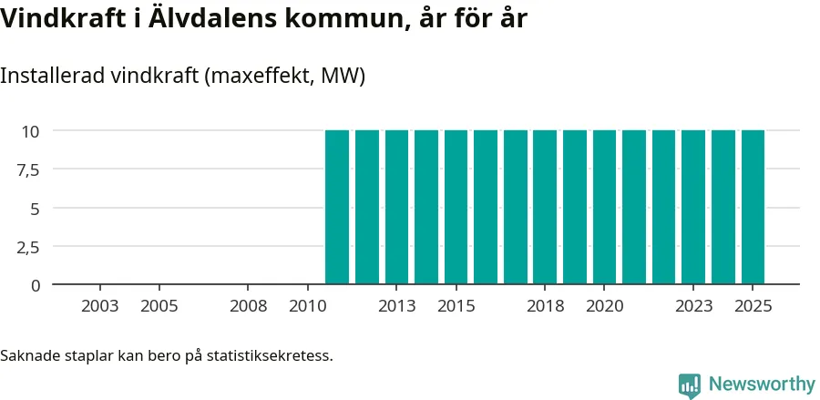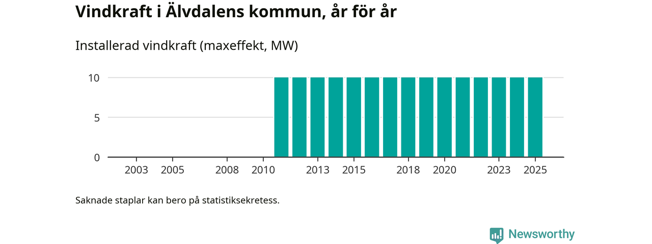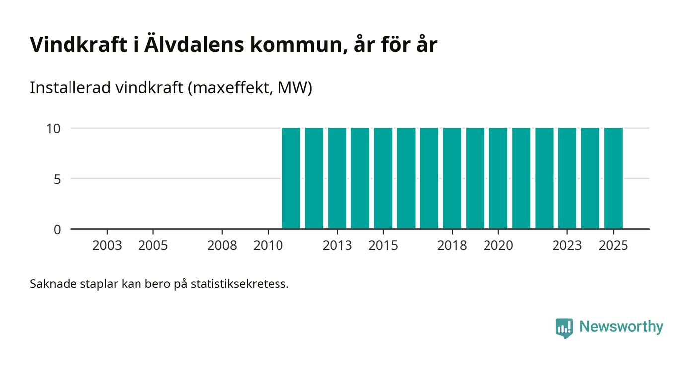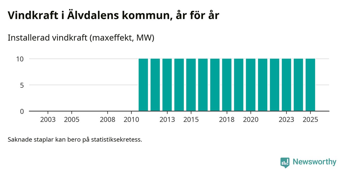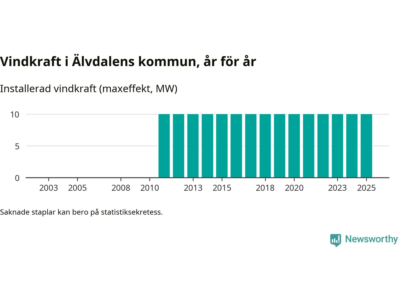 Totalt fanns i slutet av förra året fem vindkraftverk i Älvdalens kommun, med en sammanlagd maxeffekt på 10 megawatt. Det är, för 14:e året i rad, oförändrade siffror jämfört med året innan. Det visar nya siffror från Energimyndigheten.