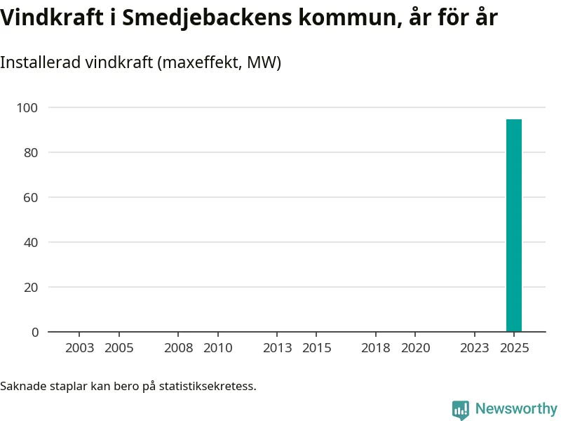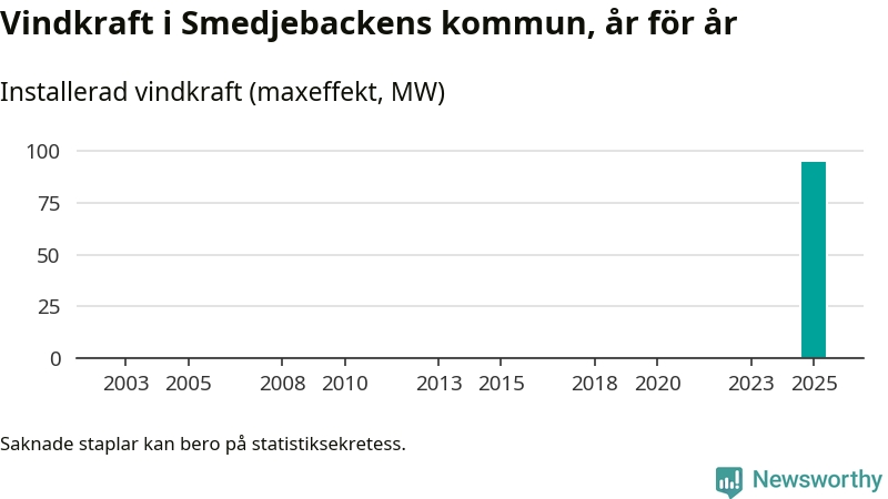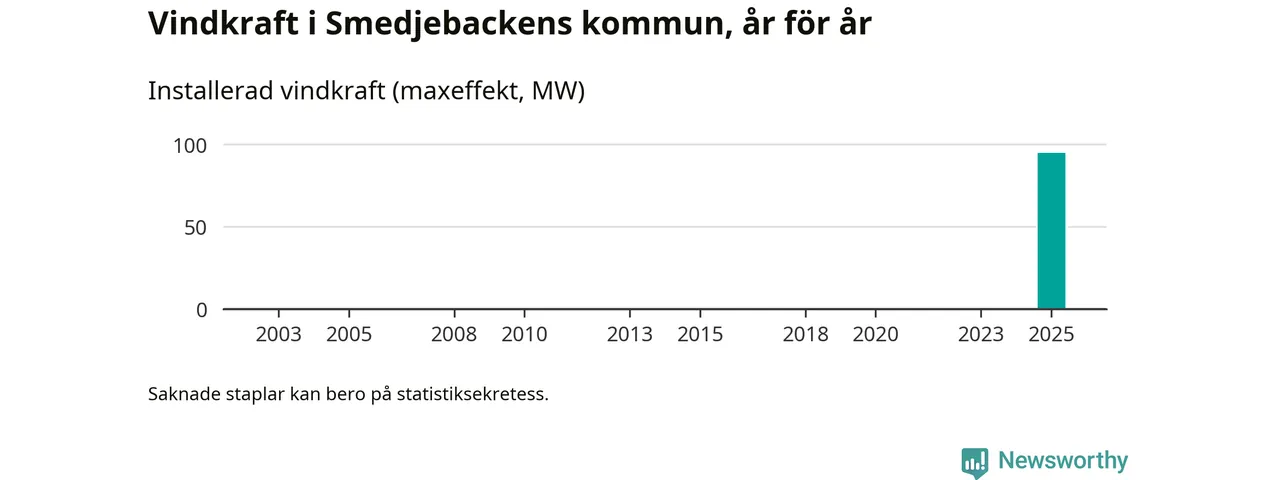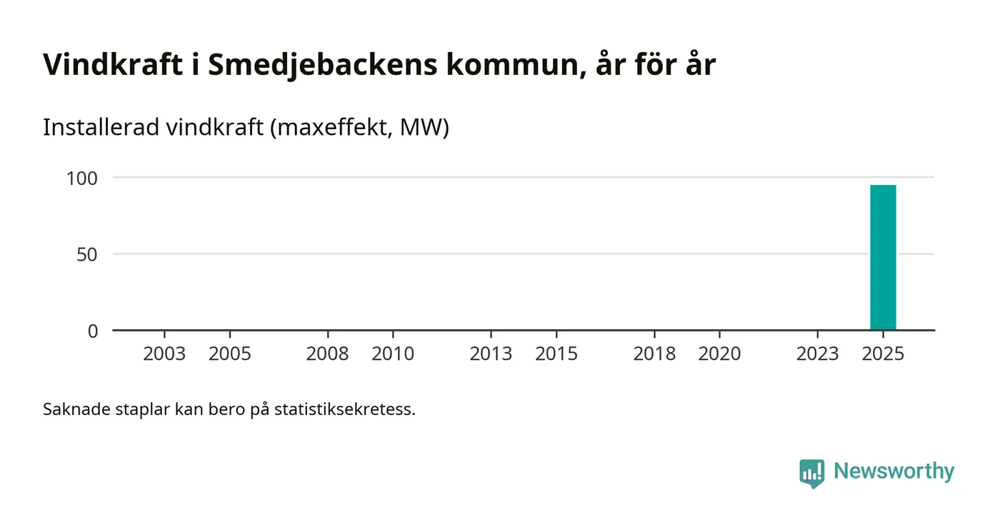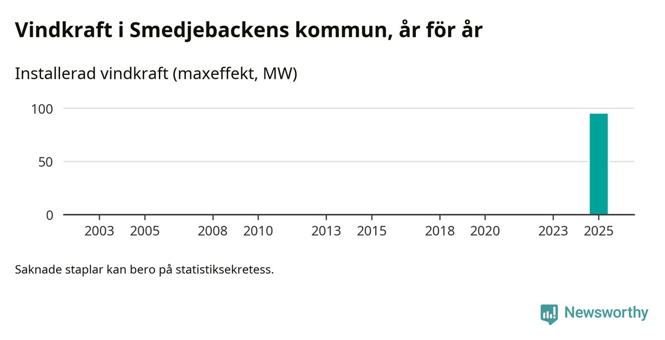 Totalt fanns i slutet av förra året 17 vindkraftverk i Smedjebackens kommun, med en sammanlagd maxeffekt på 95 megawatt. Det är helt ny vindkraft för året, och första gången (sedan åtminstone 2003) som kommunen har någon registrerad vindkraft i statistiken. Det visar nya siffror från Energimyndigheten.