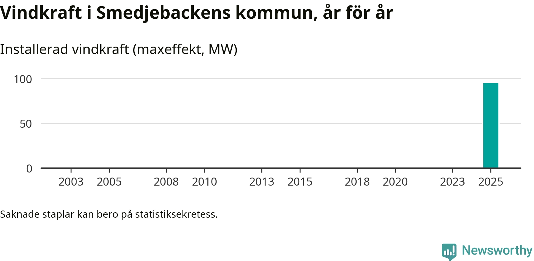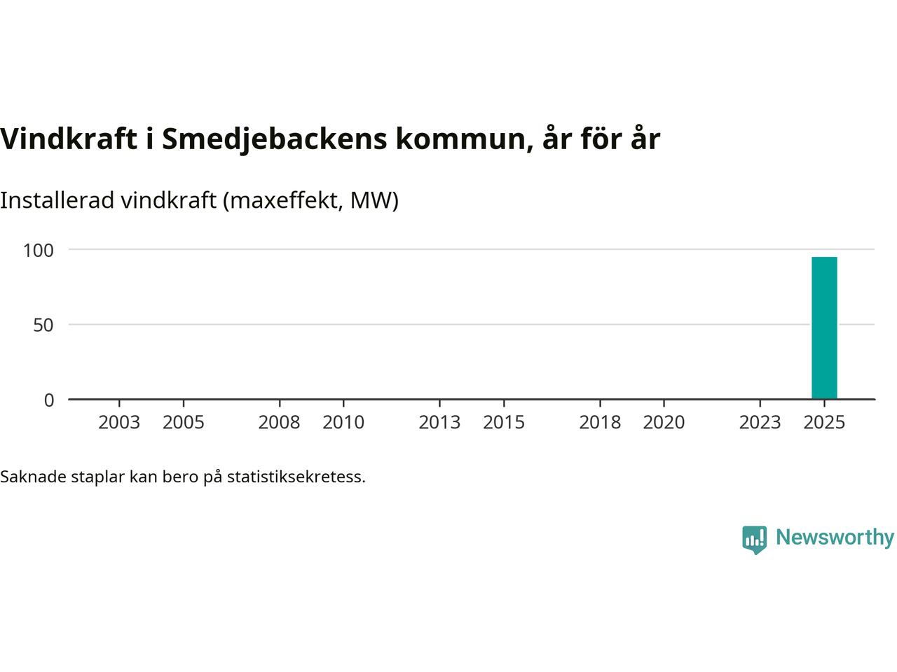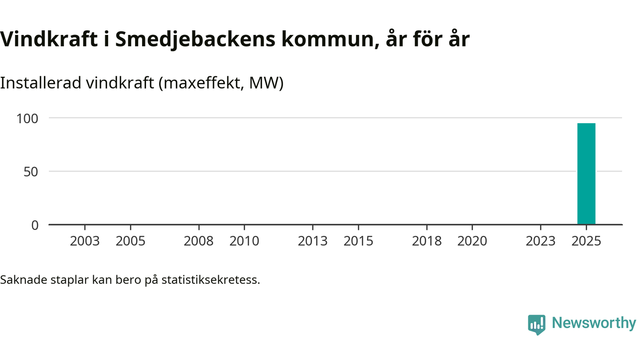 Totalt fanns i slutet av förra året 17 vindkraftverk i Smedjebackens kommun, med en sammanlagd maxeffekt på 95 megawatt. Det är helt ny vindkraft för året, och första gången (sedan åtminstone 2003) som kommunen har någon registrerad vindkraft i statistiken. Det visar nya siffror från Energimyndigheten.