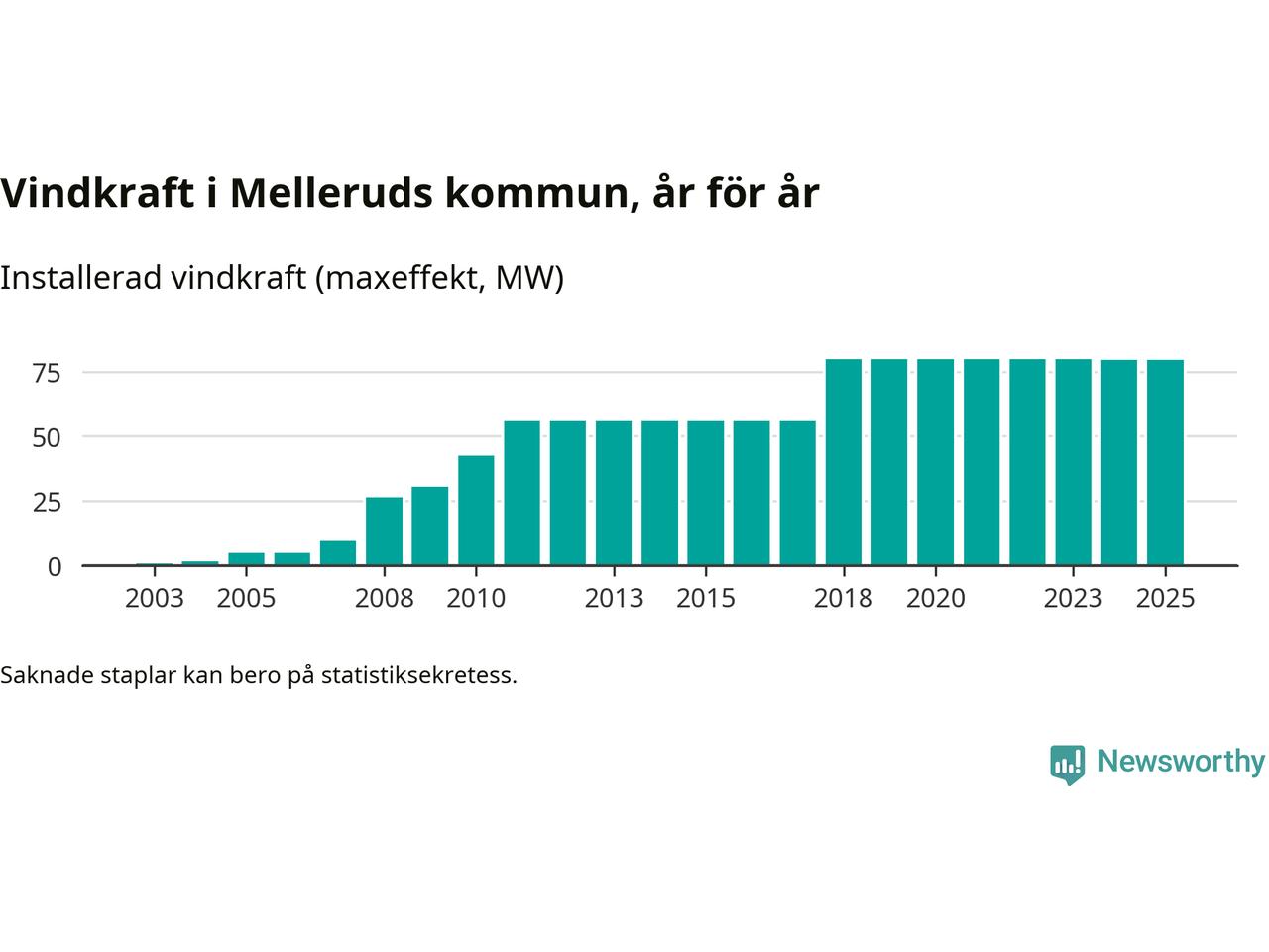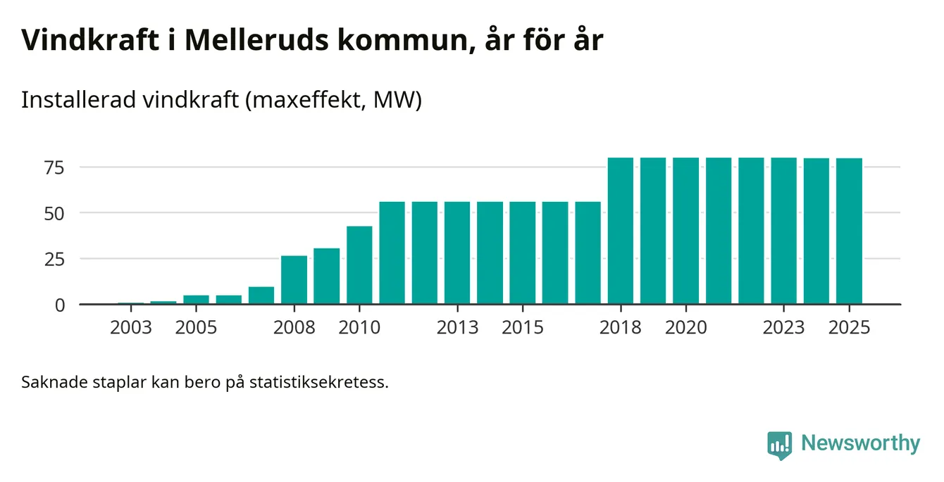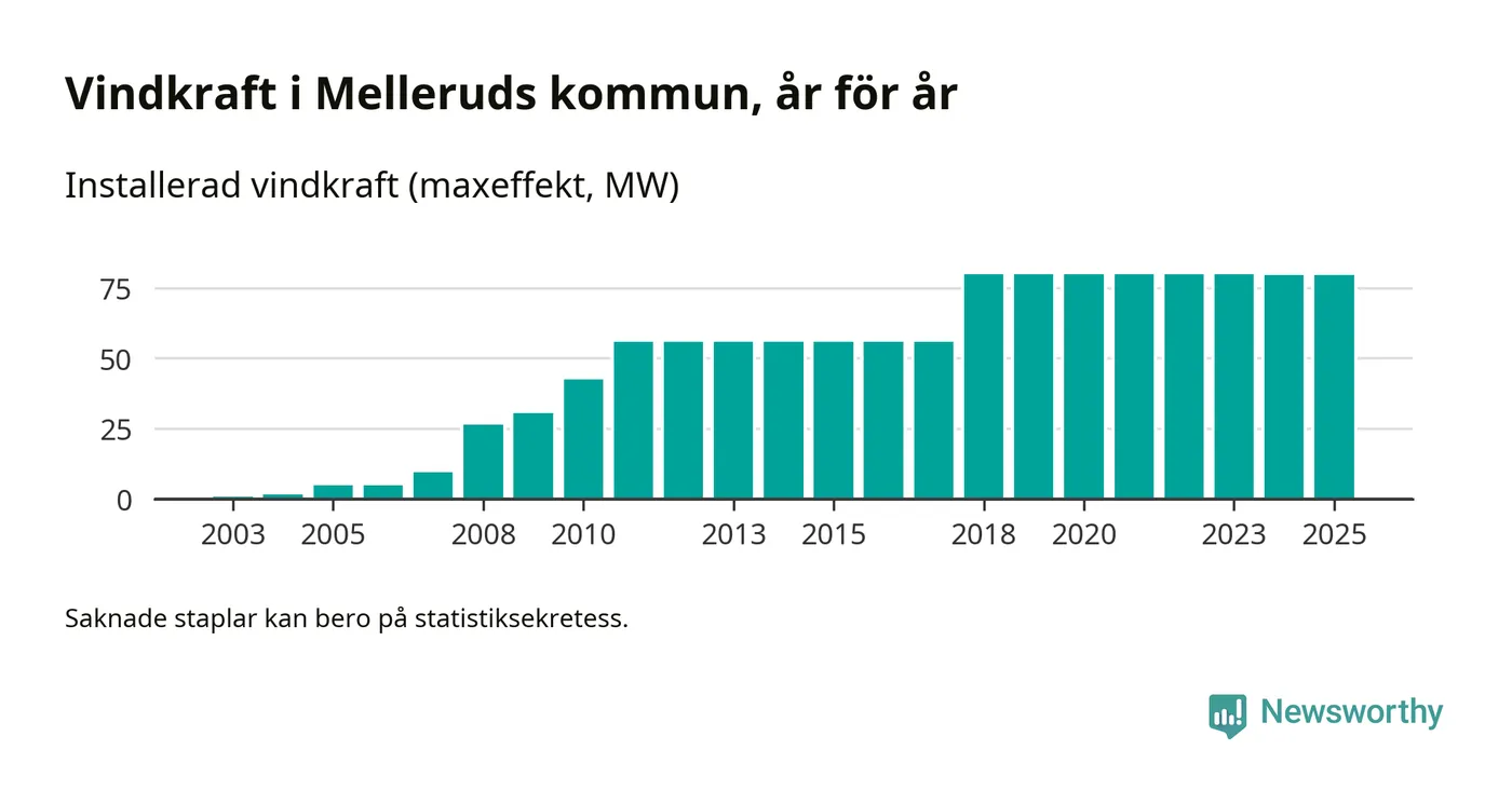 Totalt fanns i slutet av förra året 44 vindkraftverk i Melleruds kommun, med en sammanlagd maxeffekt på 80 megawatt. Det är oförändrade siffror jämfört med året innan. Det visar nya siffror från Energimyndigheten.