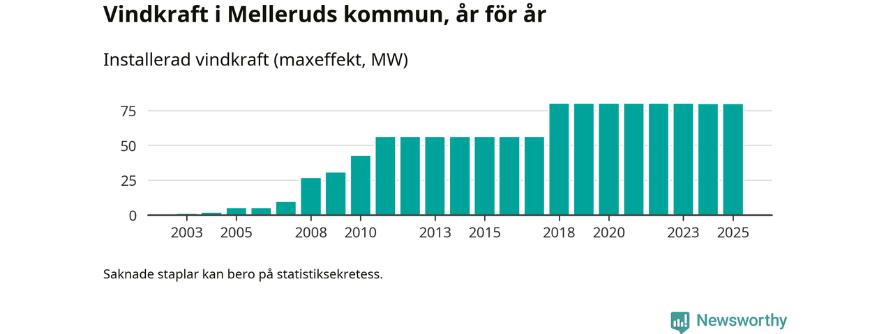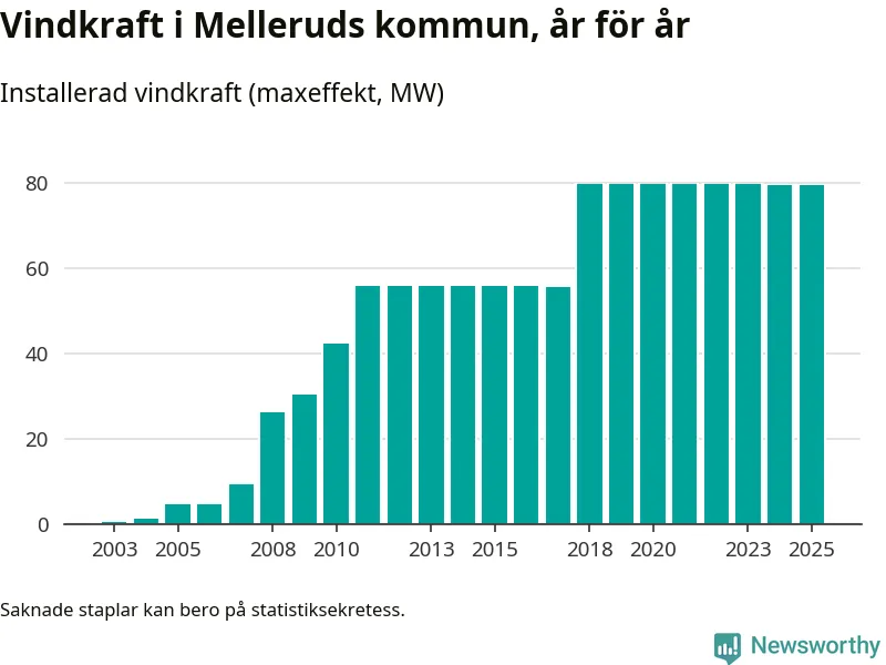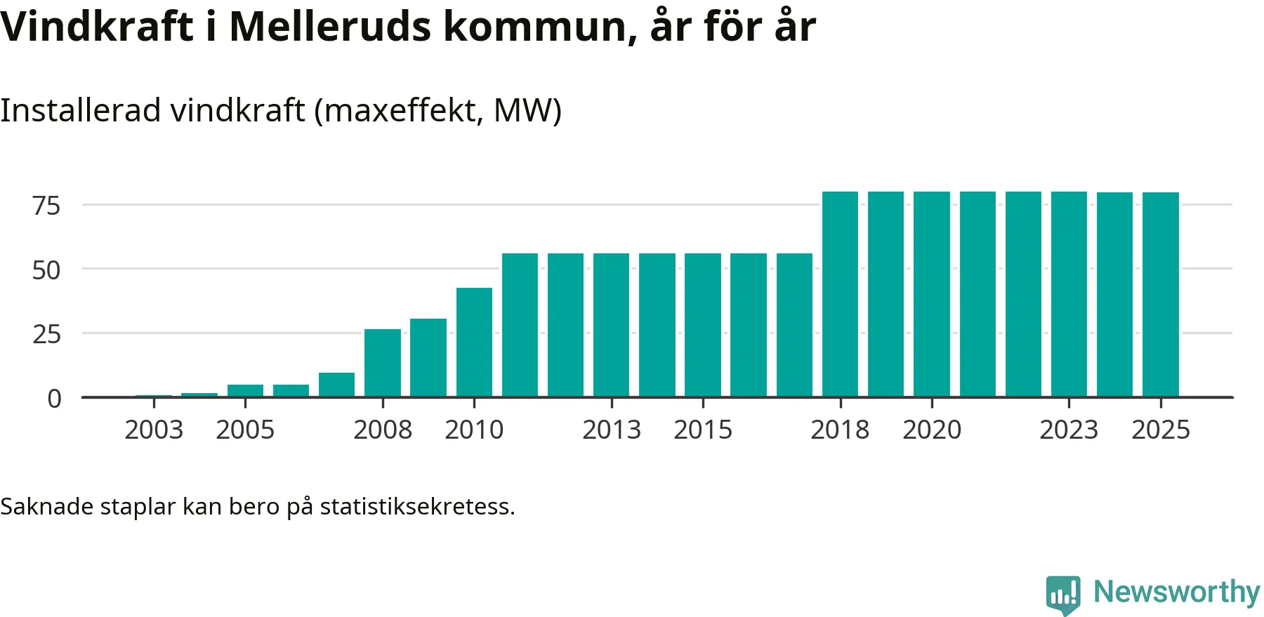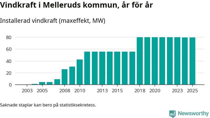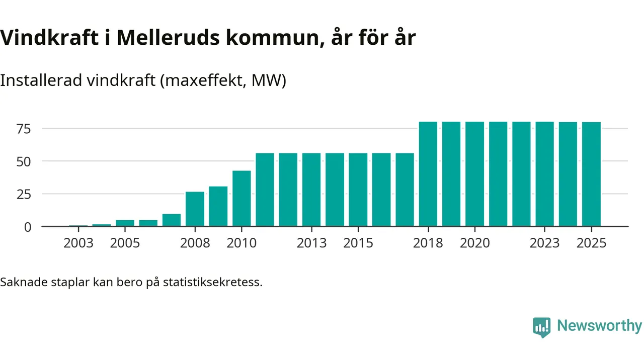 Totalt fanns i slutet av förra året 44 vindkraftverk i Melleruds kommun, med en sammanlagd maxeffekt på 80 megawatt. Det är oförändrade siffror jämfört med året innan. Det visar nya siffror från Energimyndigheten.