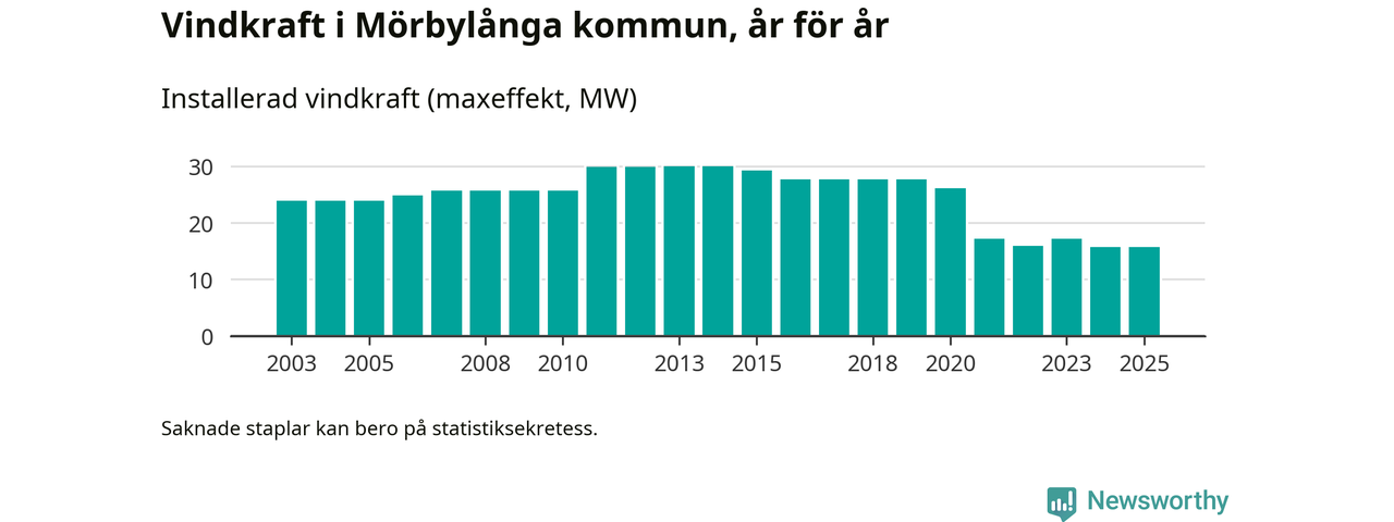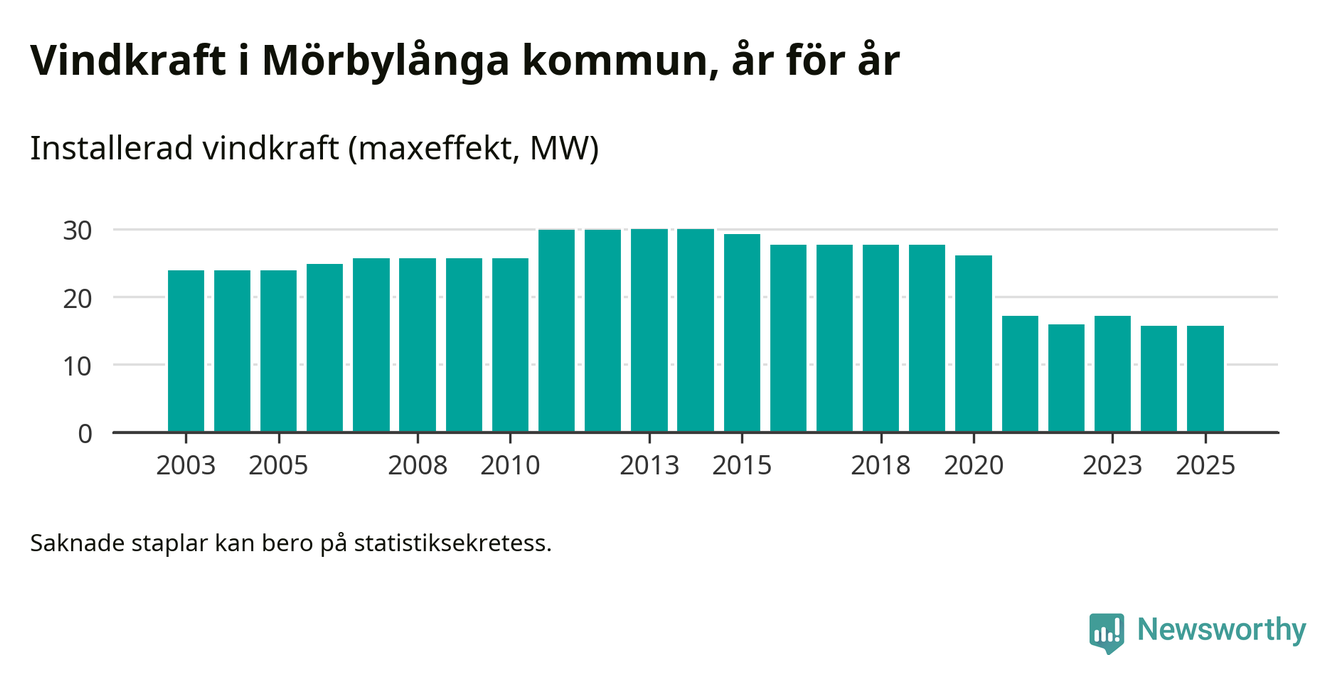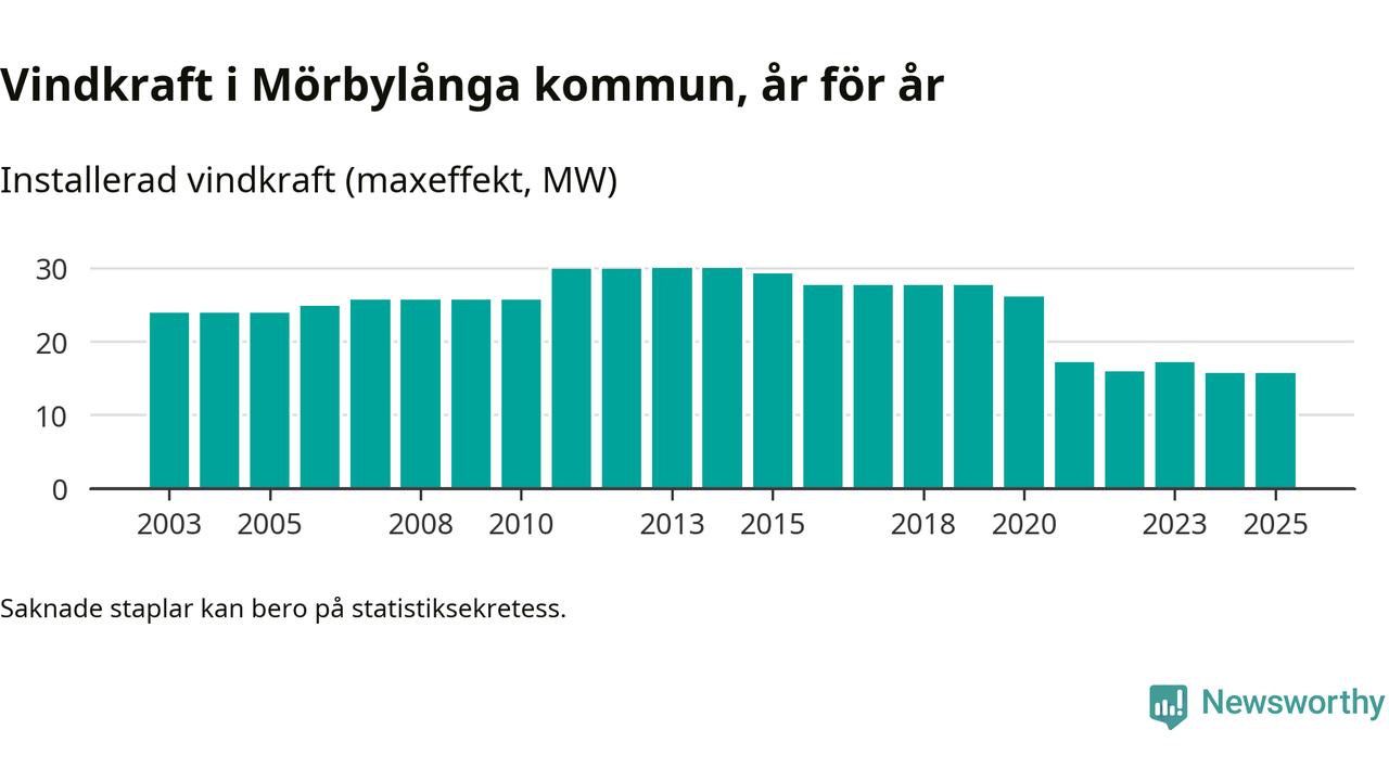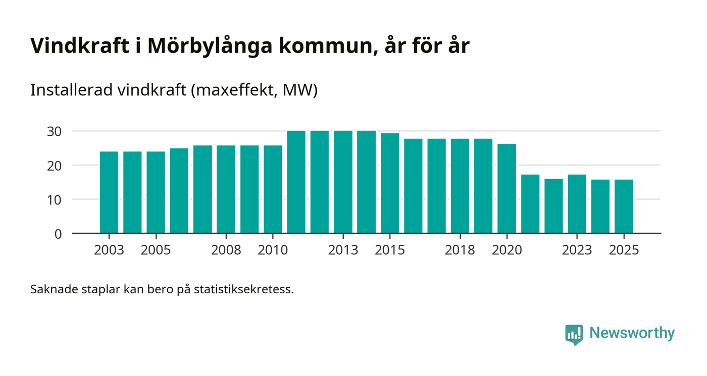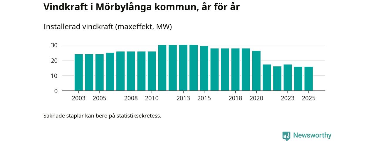 Totalt fanns i slutet av förra året 20 vindkraftverk i Mörbylånga kommun, med en sammanlagd maxeffekt på 16 megawatt. Det är oförändrade siffror jämfört med året innan. Det visar nya siffror från Energimyndigheten.