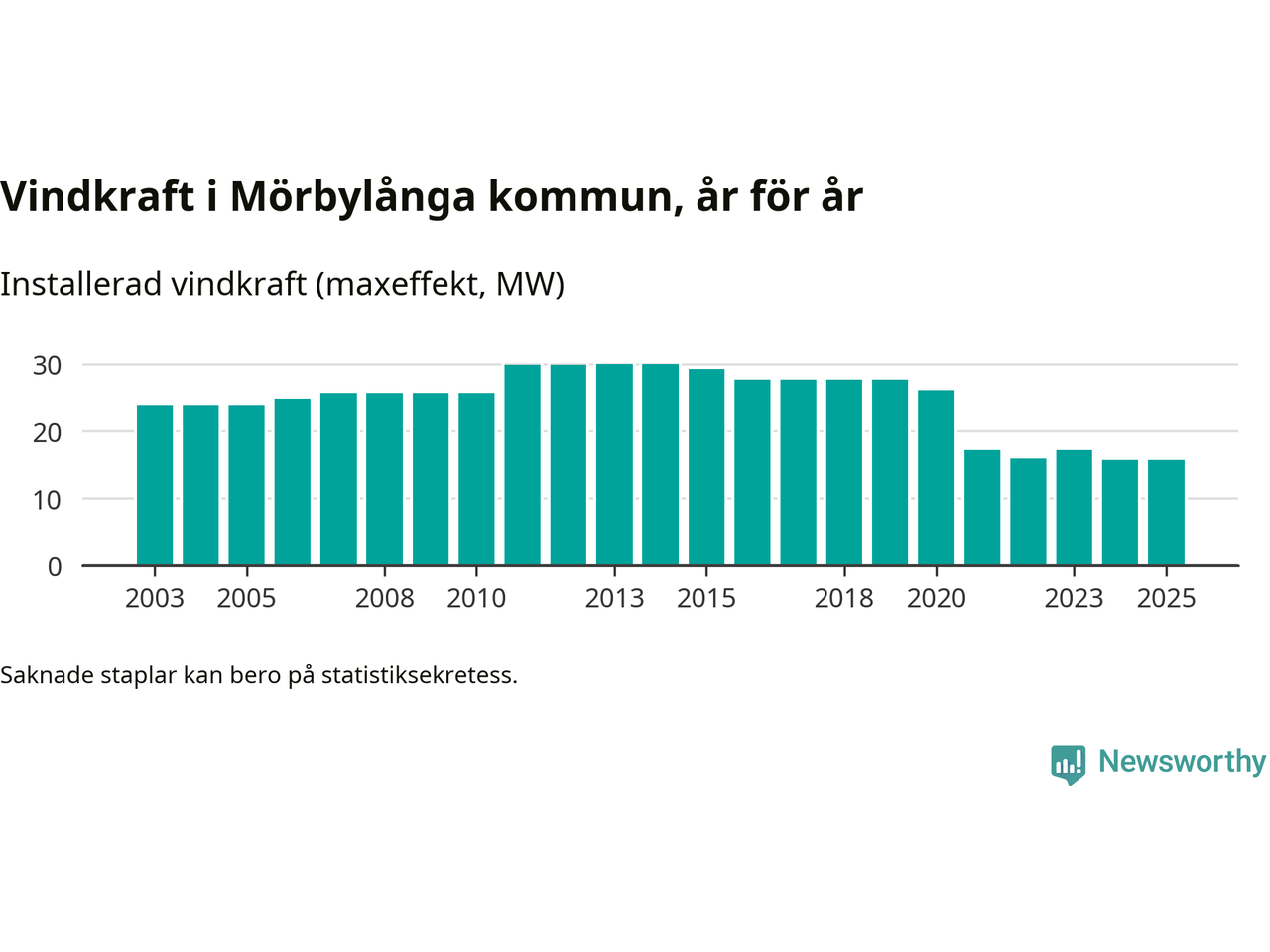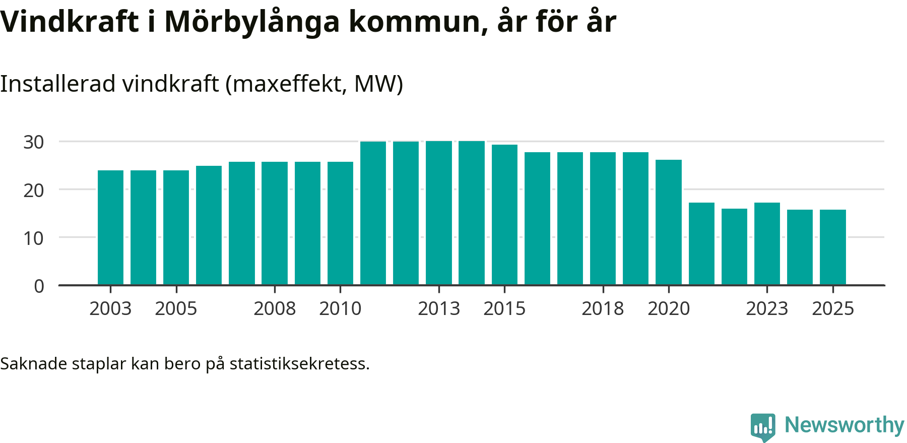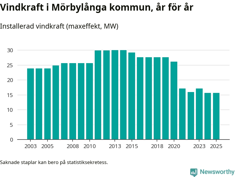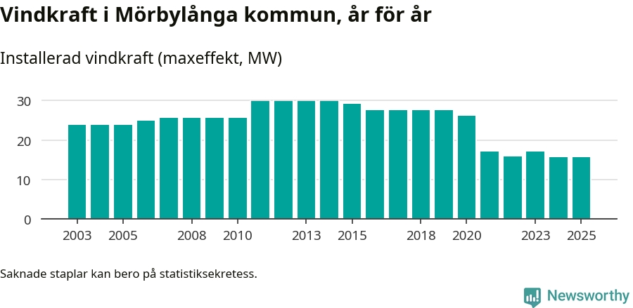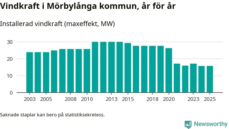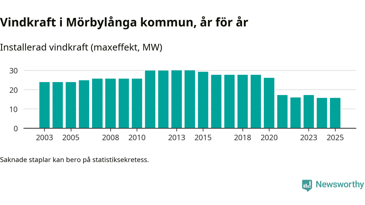 Totalt fanns i slutet av förra året 20 vindkraftverk i Mörbylånga kommun, med en sammanlagd maxeffekt på 16 megawatt. Det är oförändrade siffror jämfört med året innan. Det visar nya siffror från Energimyndigheten.
