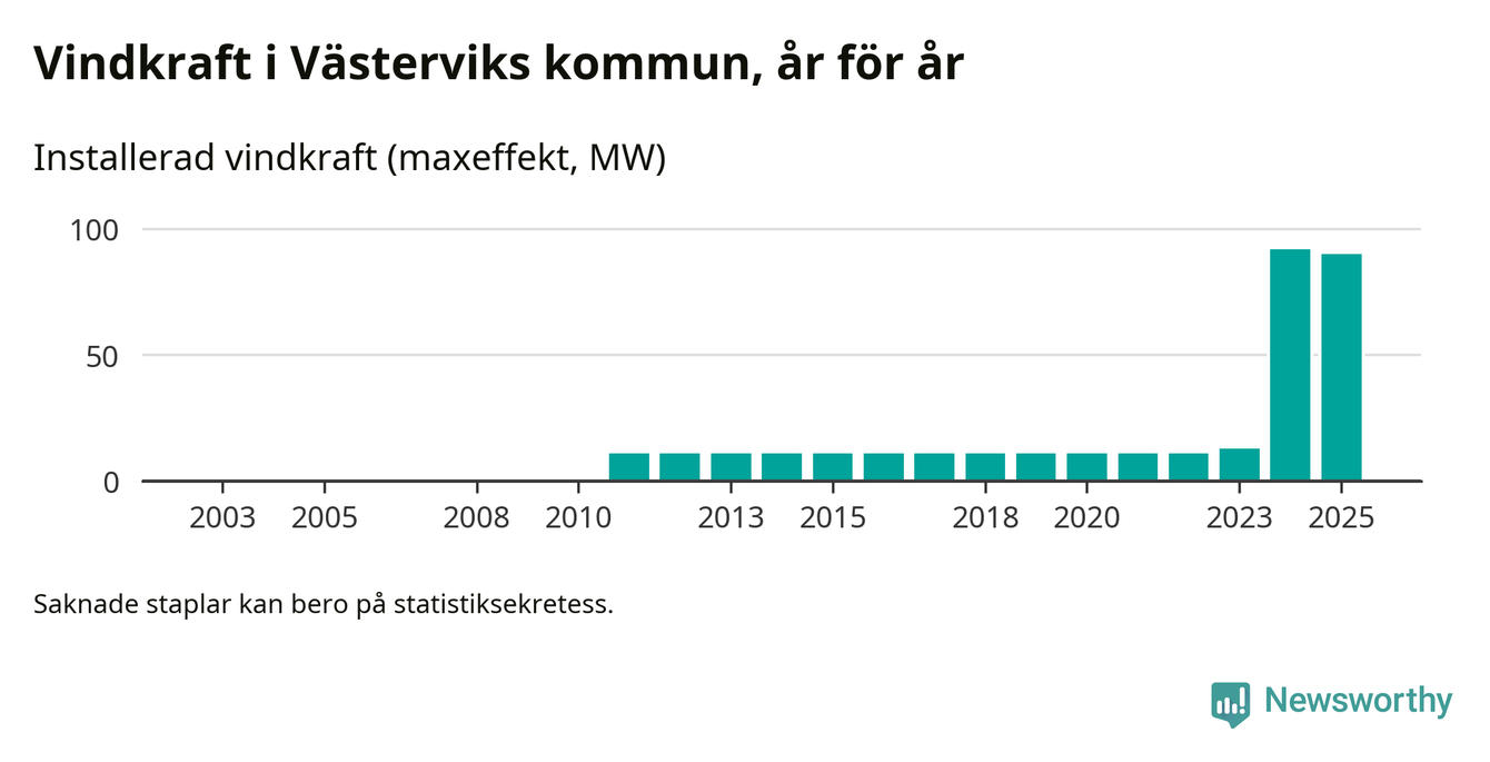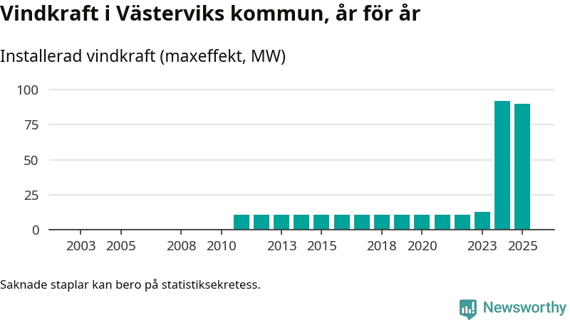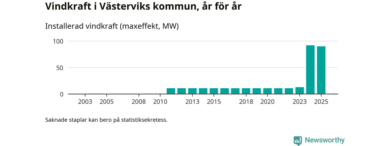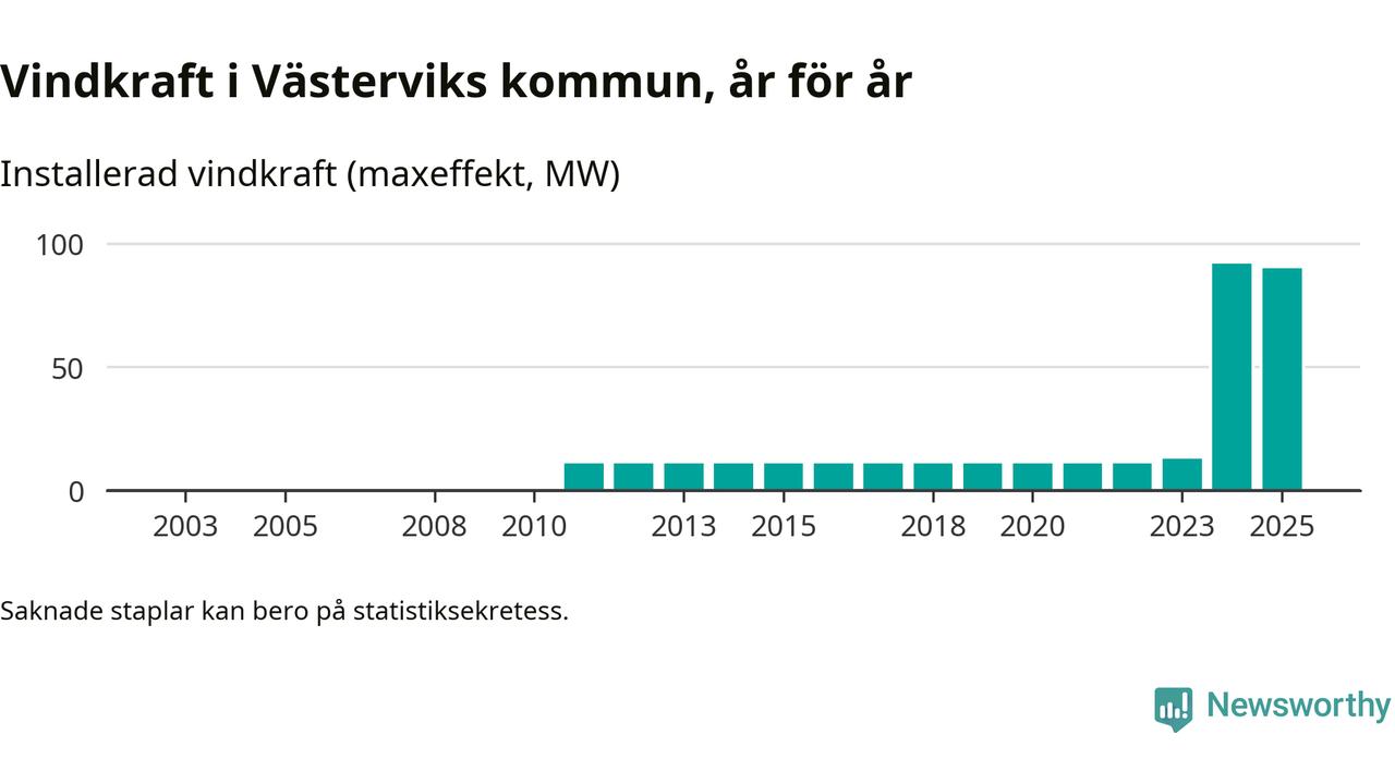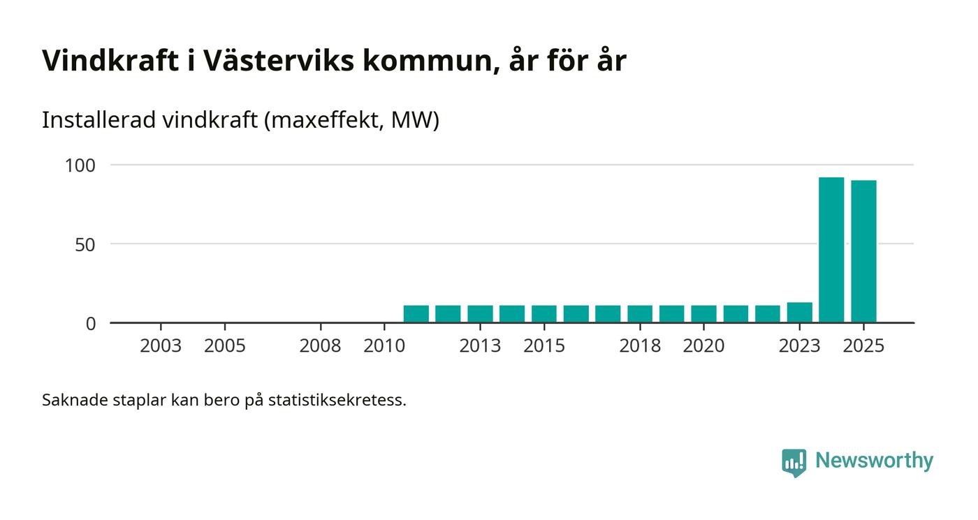 Totalt fanns i slutet av förra året 14 vindkraftverk i Västerviks kommun, med en sammanlagd maxeffekt på 90 megawatt. Det är en minskning med 1,8 megawatt 1, jämfört med året innan. Det visar nya siffror från Energimyndigheten.