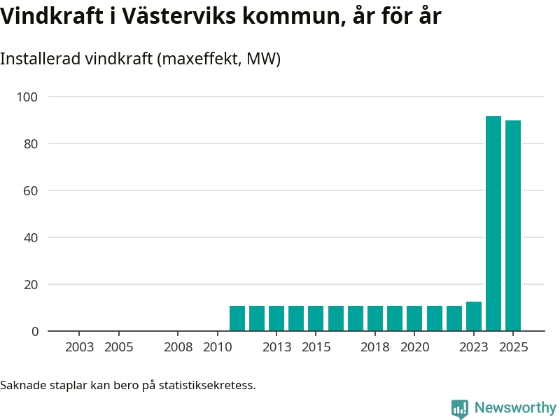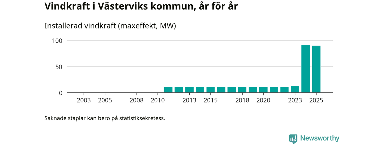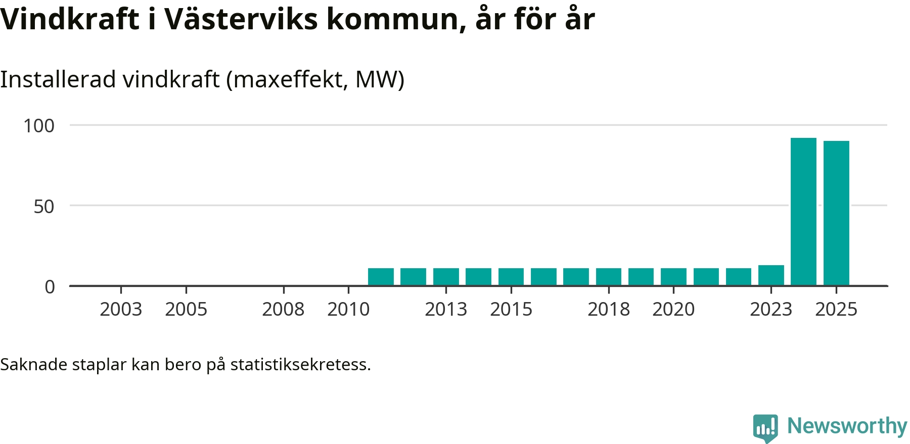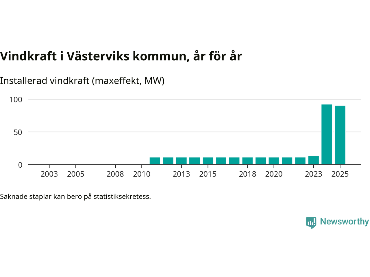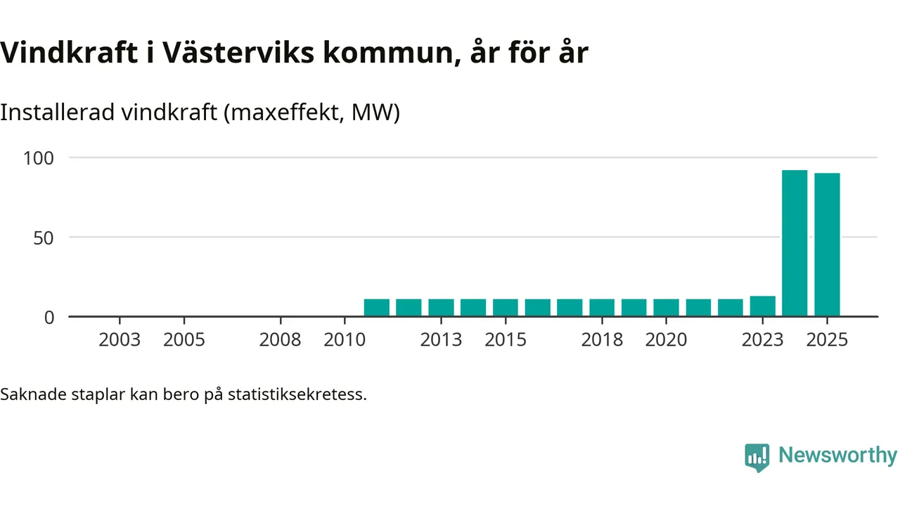 Totalt fanns i slutet av förra året 14 vindkraftverk i Västerviks kommun, med en sammanlagd maxeffekt på 90 megawatt. Det är en minskning med 1,8 megawatt 1, jämfört med året innan. Det visar nya siffror från Energimyndigheten.