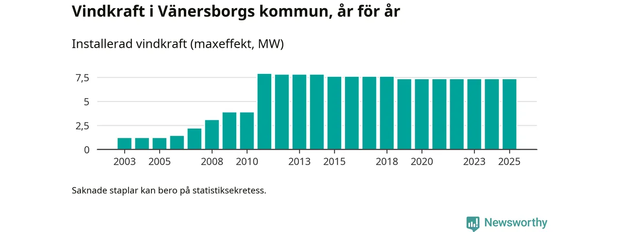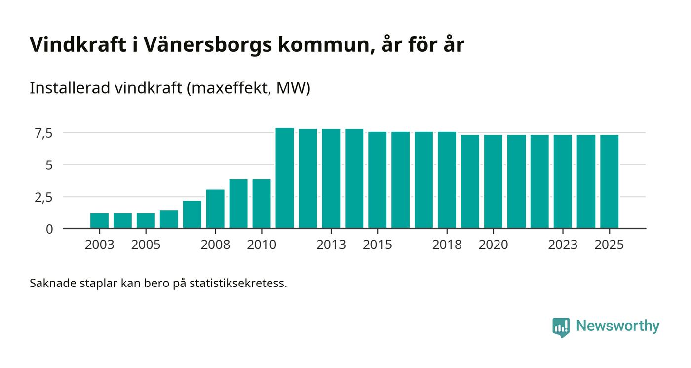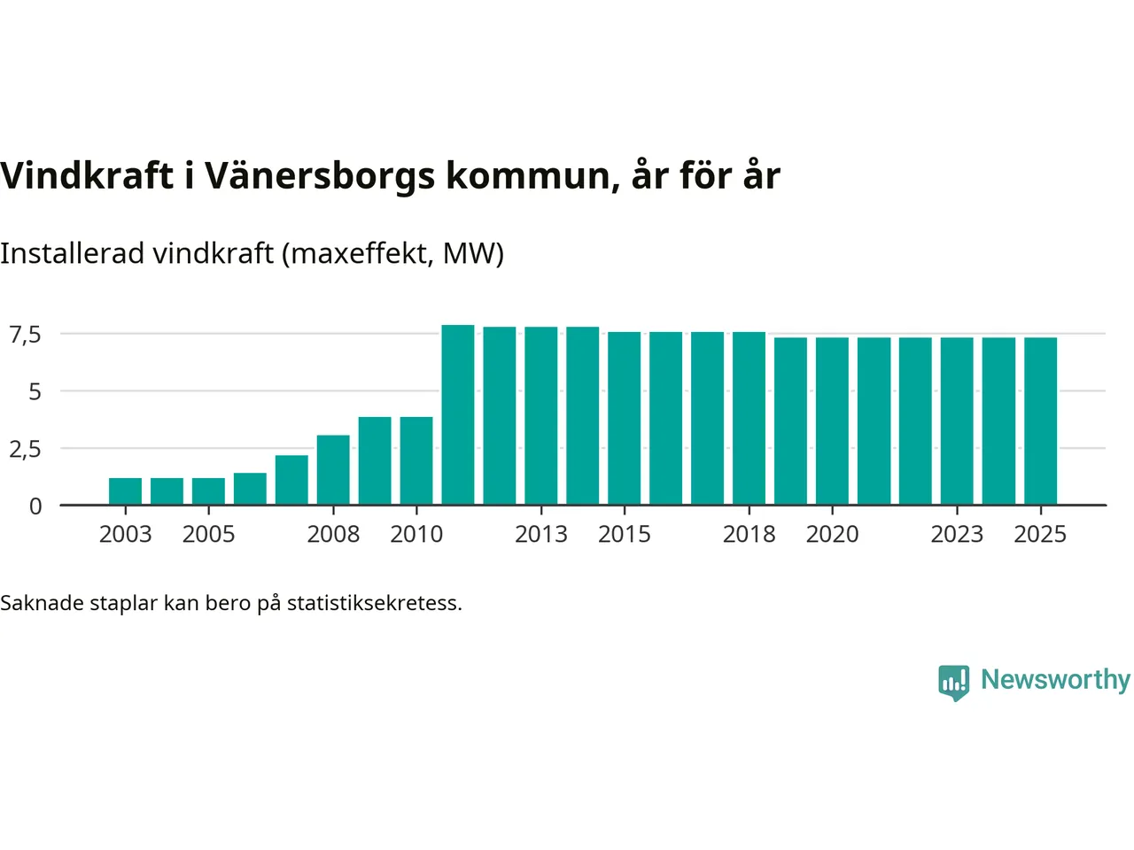 Totalt fanns i slutet av förra året sex vindkraftverk i Vänersborgs kommun, med en sammanlagd maxeffekt på 7 megawatt. Det är, för sjätte året i rad, oförändrade siffror jämfört med året innan. Det visar nya siffror från Energimyndigheten.