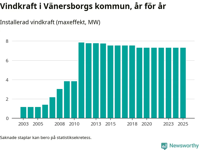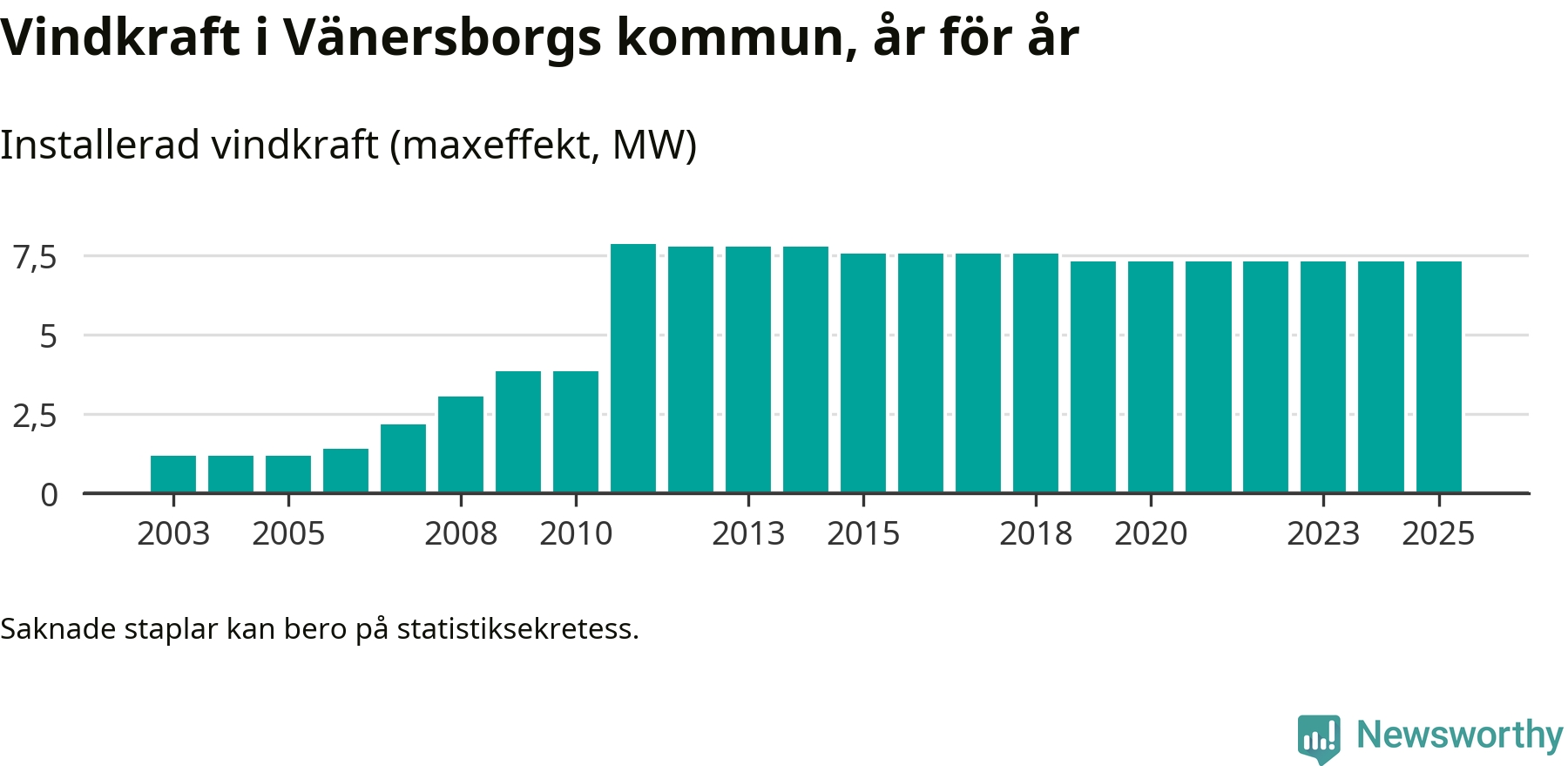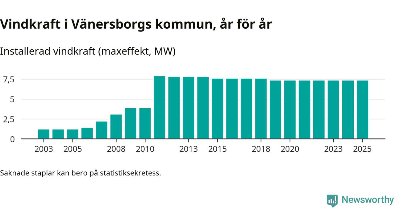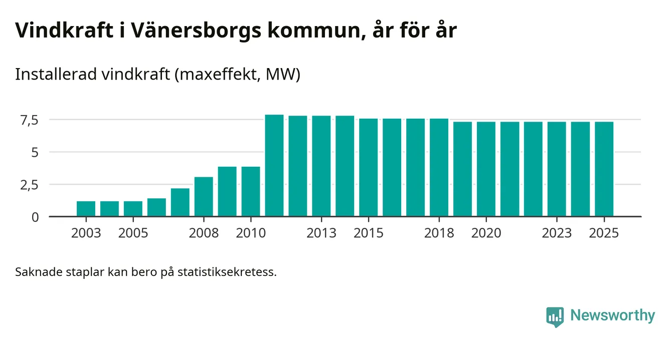 Totalt fanns i slutet av förra året sex vindkraftverk i Vänersborgs kommun, med en sammanlagd maxeffekt på 7 megawatt. Det är, för sjätte året i rad, oförändrade siffror jämfört med året innan. Det visar nya siffror från Energimyndigheten.