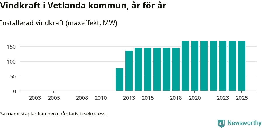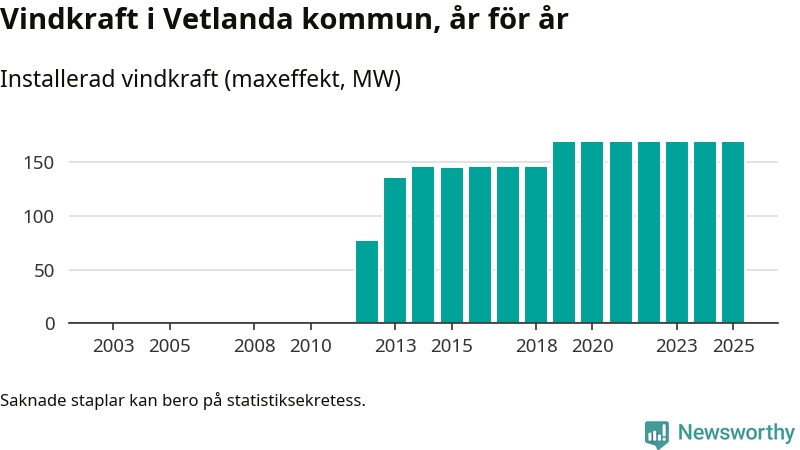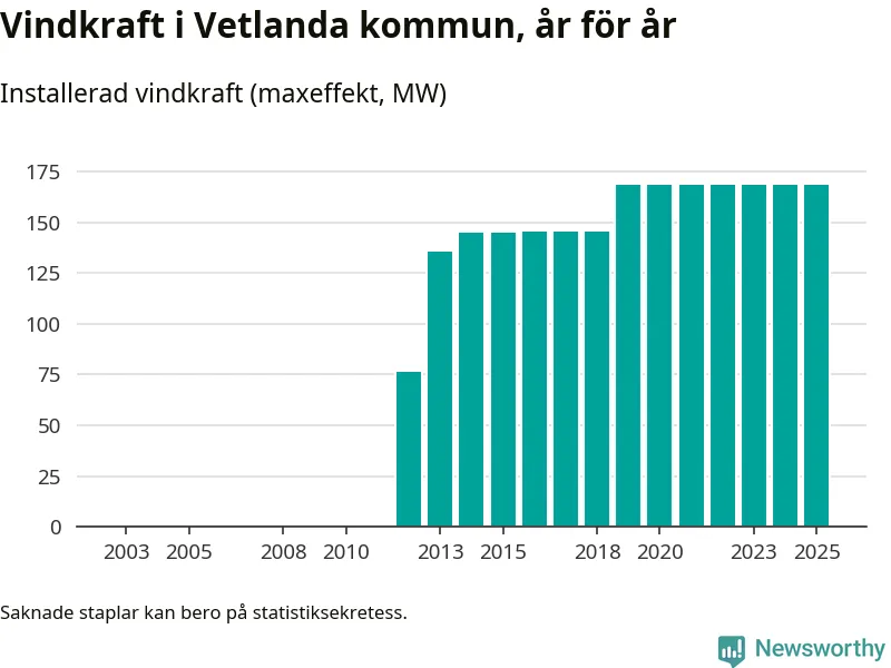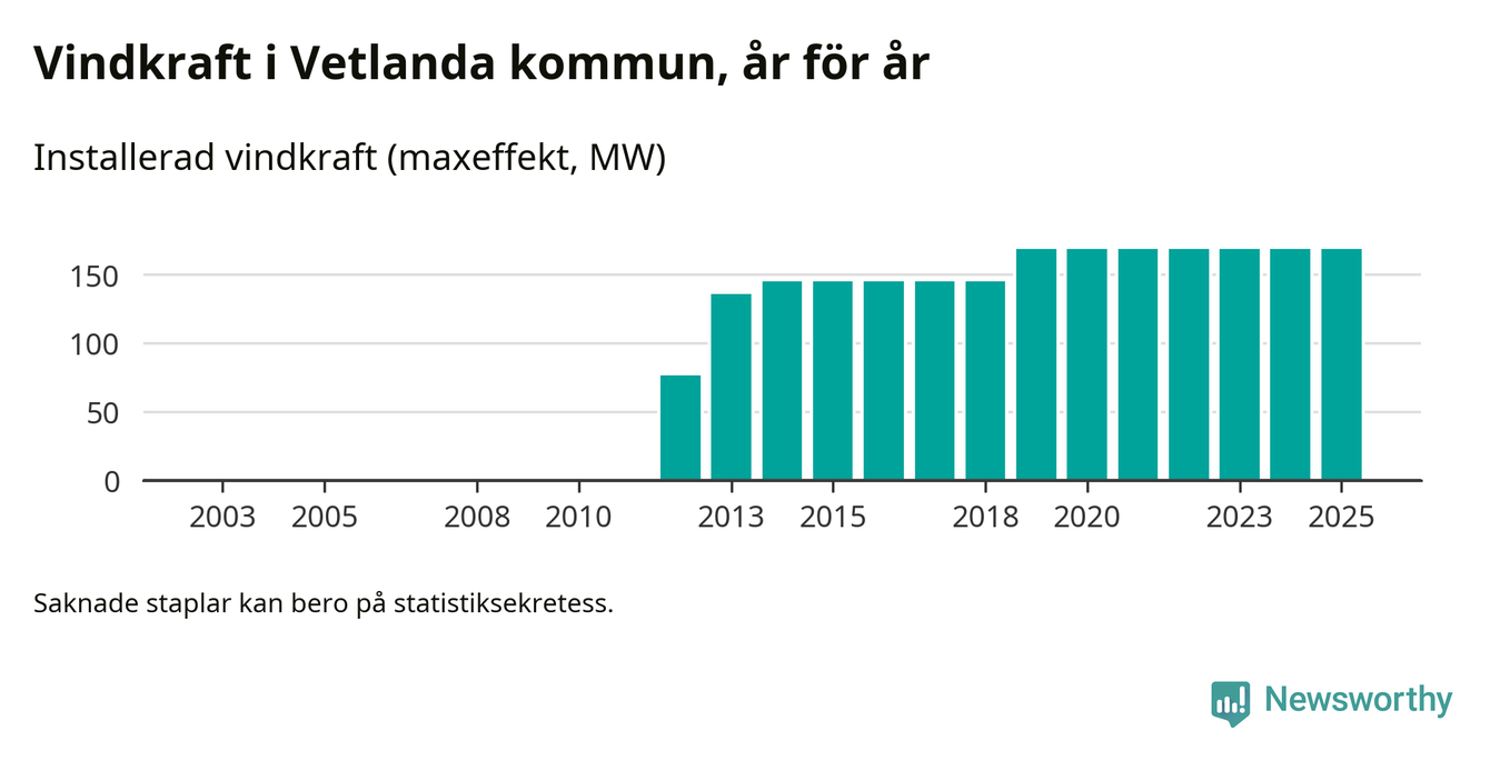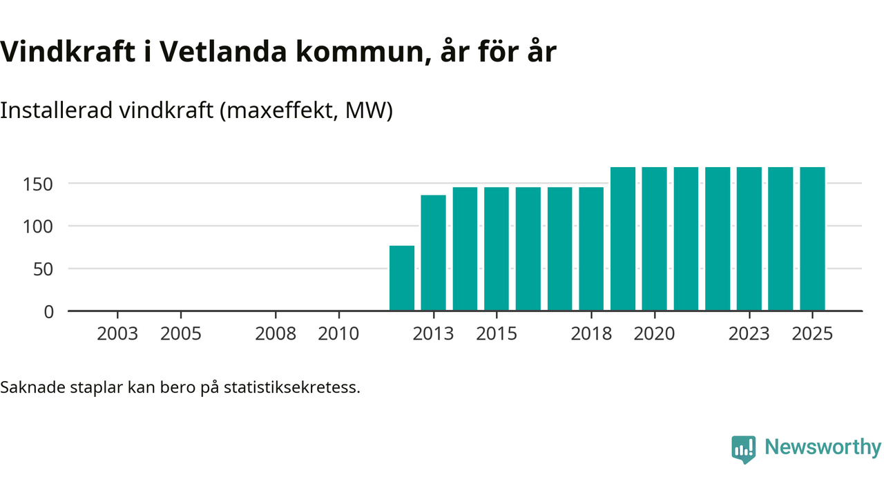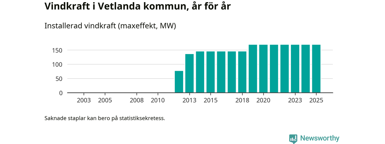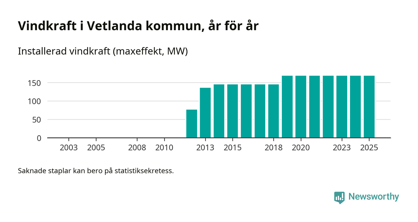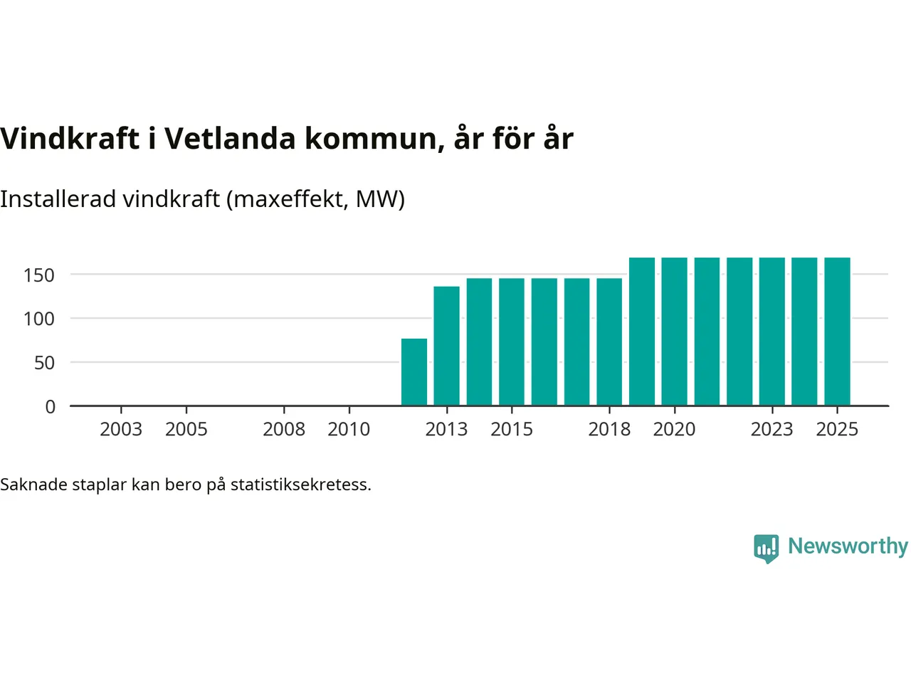 Totalt fanns i slutet av förra året 62 vindkraftverk i Vetlanda kommun, med en sammanlagd maxeffekt på 169 megawatt. Det är, för sjätte året i rad, oförändrade siffror jämfört med året innan. Det visar nya siffror från Energimyndigheten.