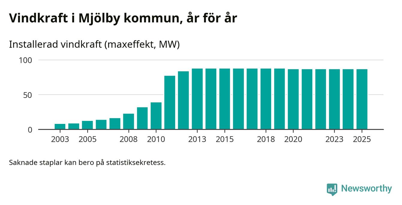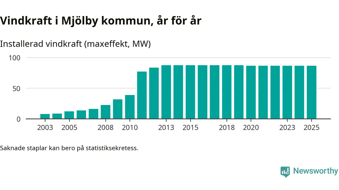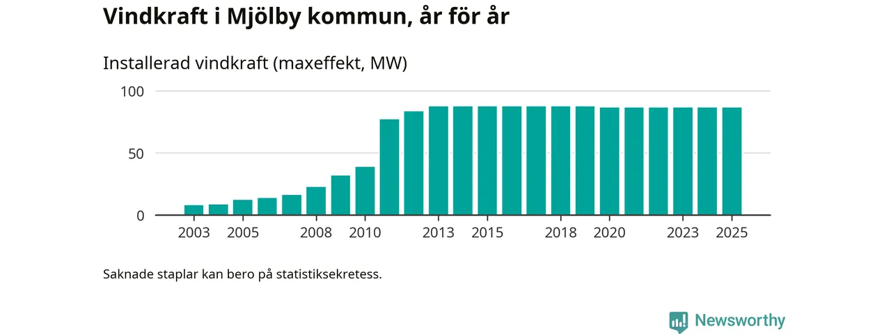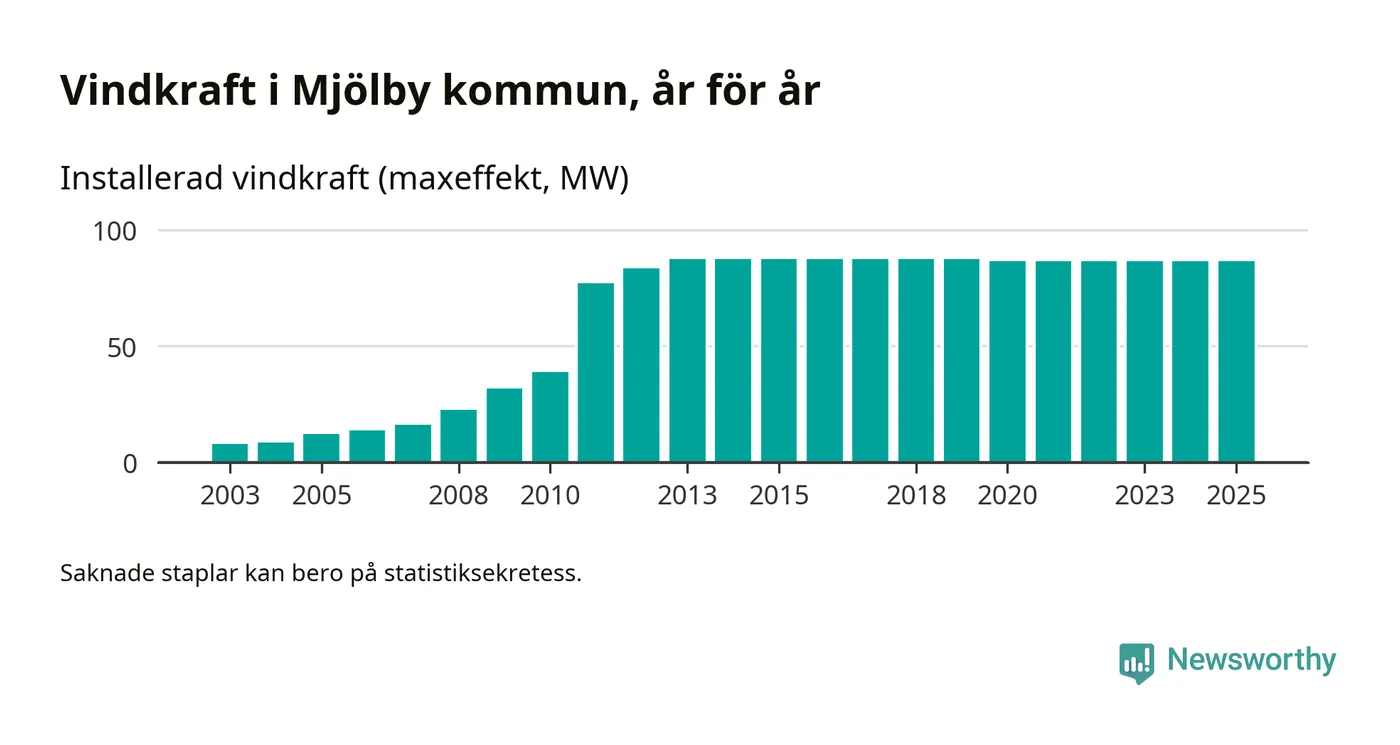 Totalt fanns i slutet av förra året 64 vindkraftverk i Mjölby kommun, med en sammanlagd maxeffekt på 87 megawatt. Det är, för femte året i rad, oförändrade siffror jämfört med året innan. Det visar nya siffror från Energimyndigheten.