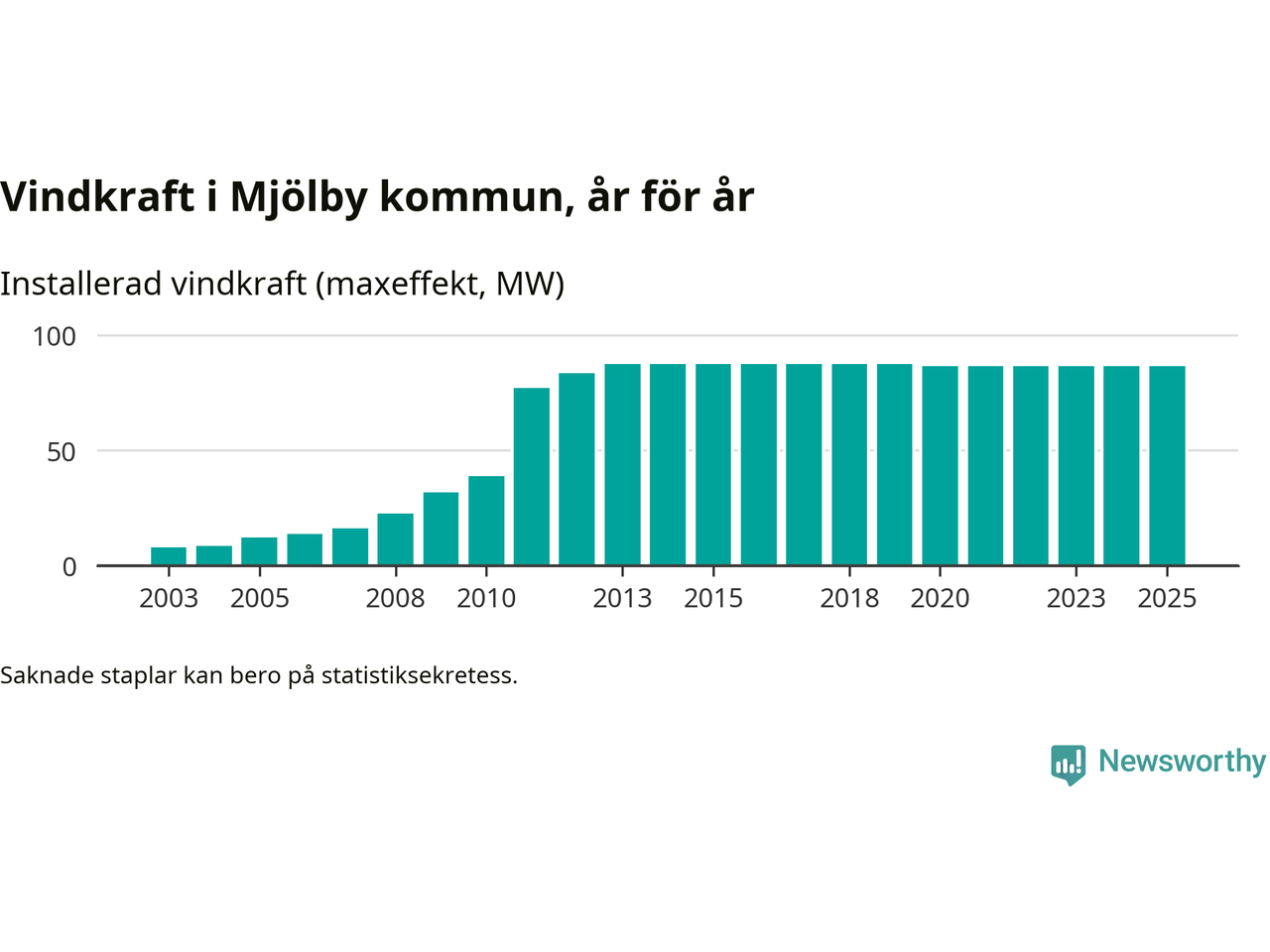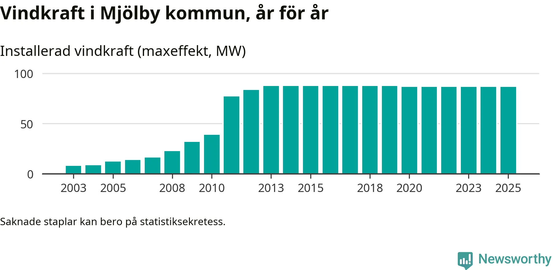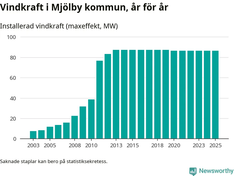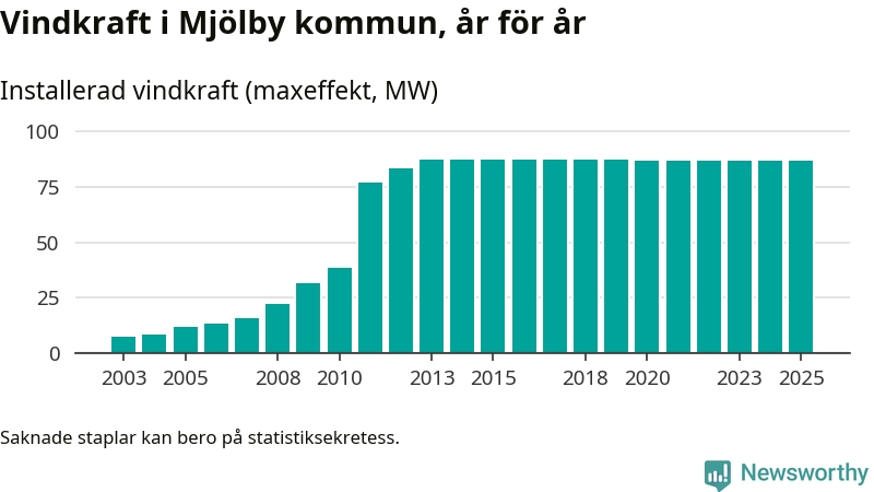 Totalt fanns i slutet av förra året 64 vindkraftverk i Mjölby kommun, med en sammanlagd maxeffekt på 87 megawatt. Det är, för femte året i rad, oförändrade siffror jämfört med året innan. Det visar nya siffror från Energimyndigheten.