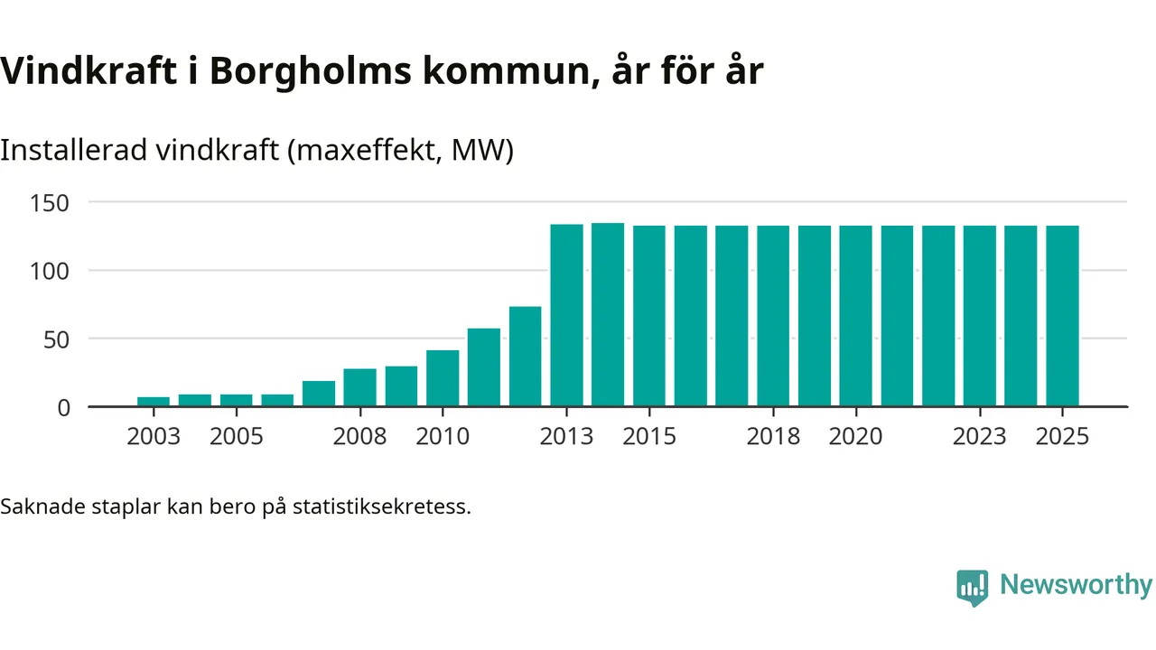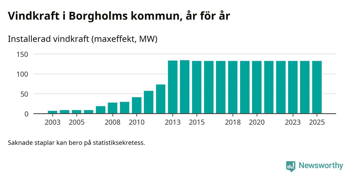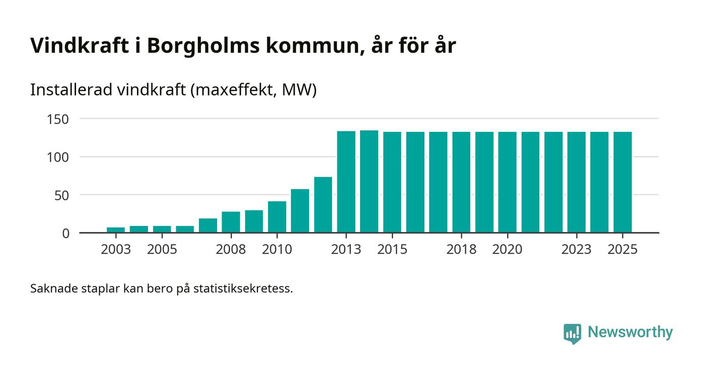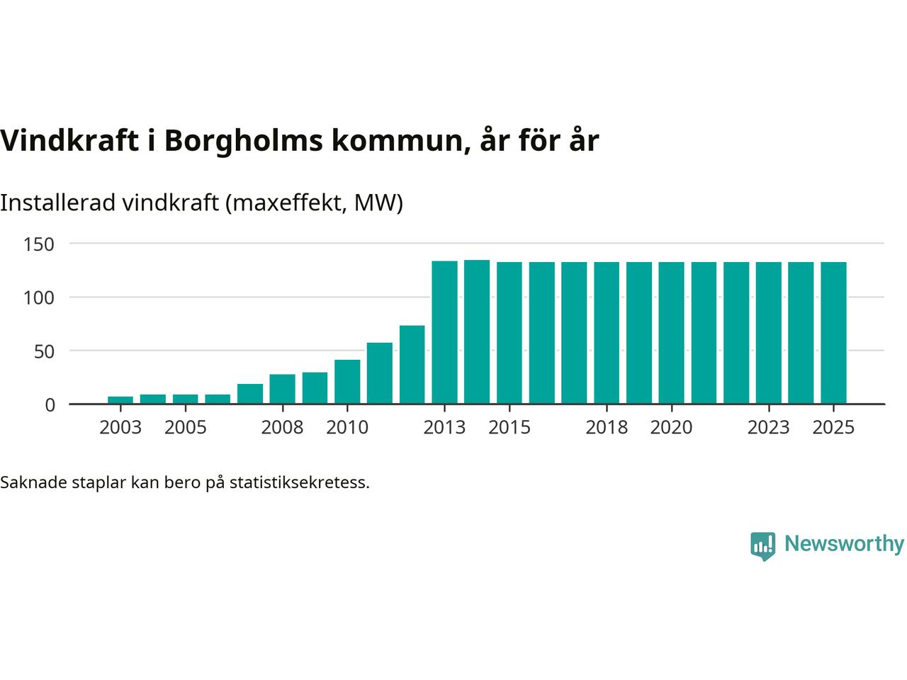 Totalt fanns i slutet av förra året 69 vindkraftverk i Borgholms kommun, med en sammanlagd maxeffekt på 132 megawatt. Det är, för tredje året i rad, oförändrade siffror jämfört med året innan. Det visar nya siffror från Energimyndigheten.