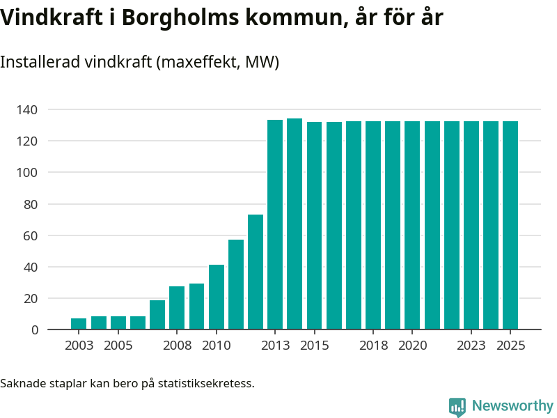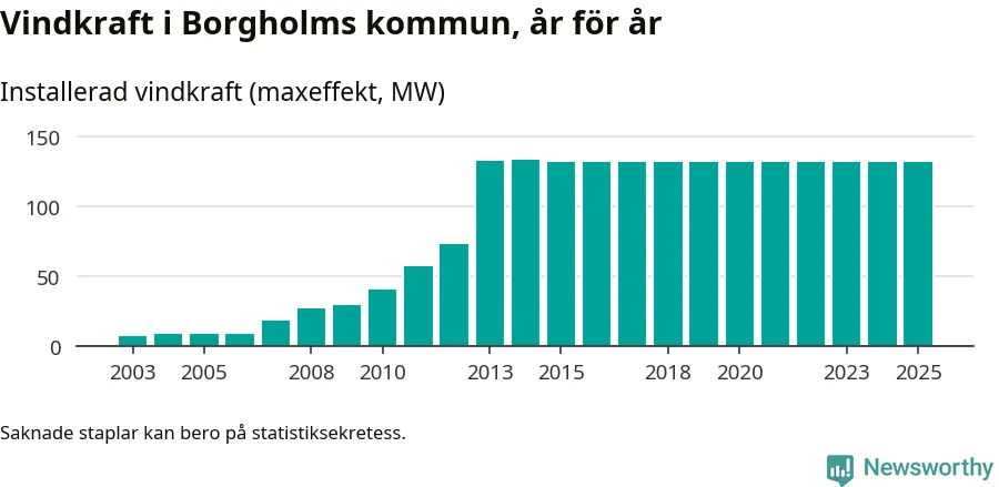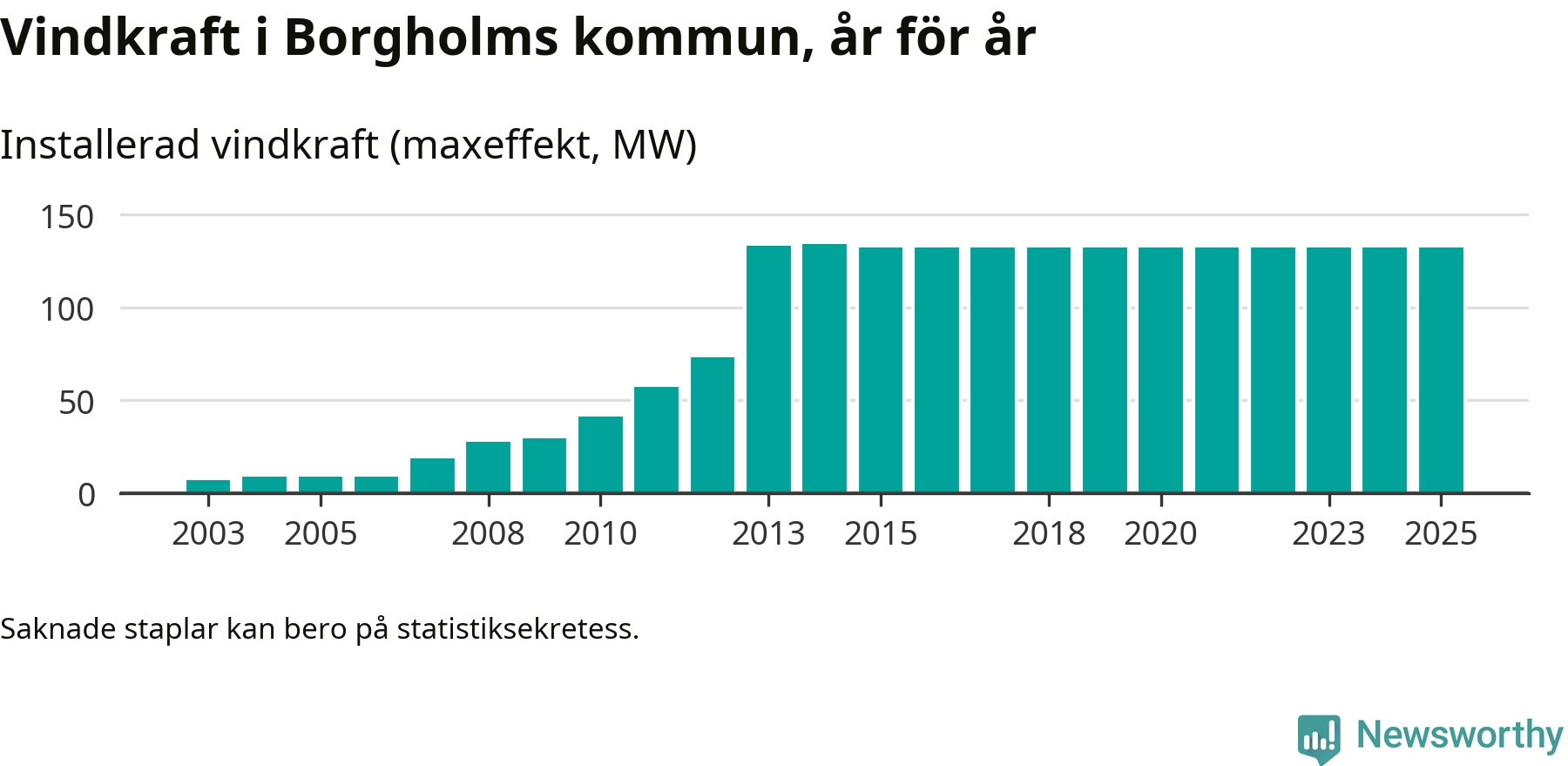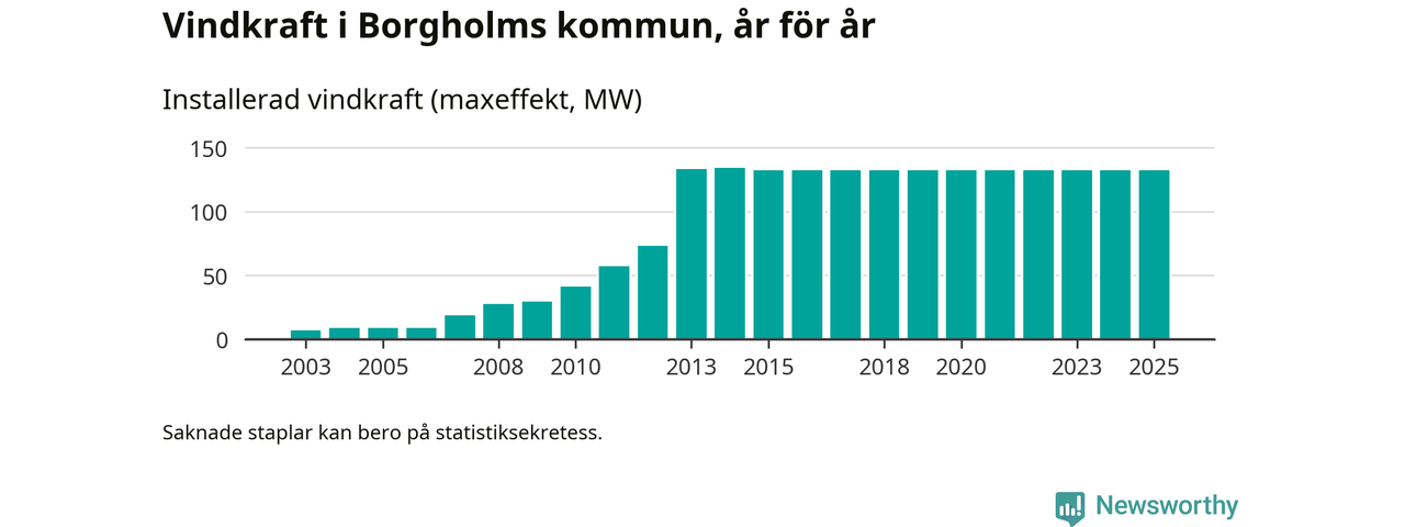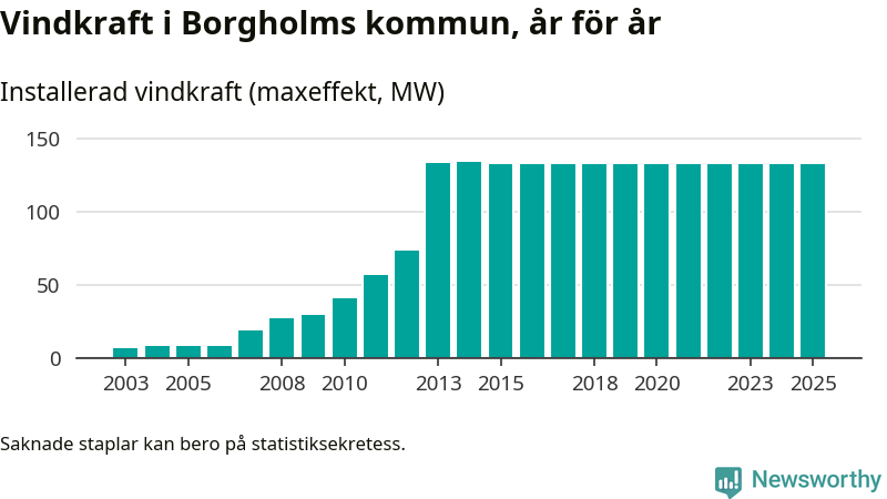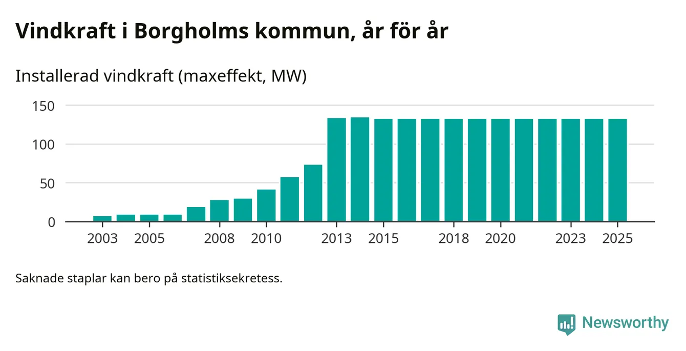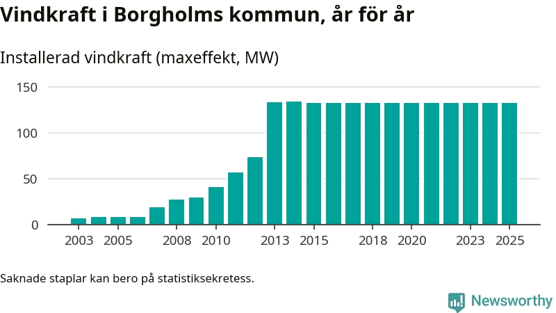 Totalt fanns i slutet av förra året 69 vindkraftverk i Borgholms kommun, med en sammanlagd maxeffekt på 132 megawatt. Det är, för tredje året i rad, oförändrade siffror jämfört med året innan. Det visar nya siffror från Energimyndigheten.