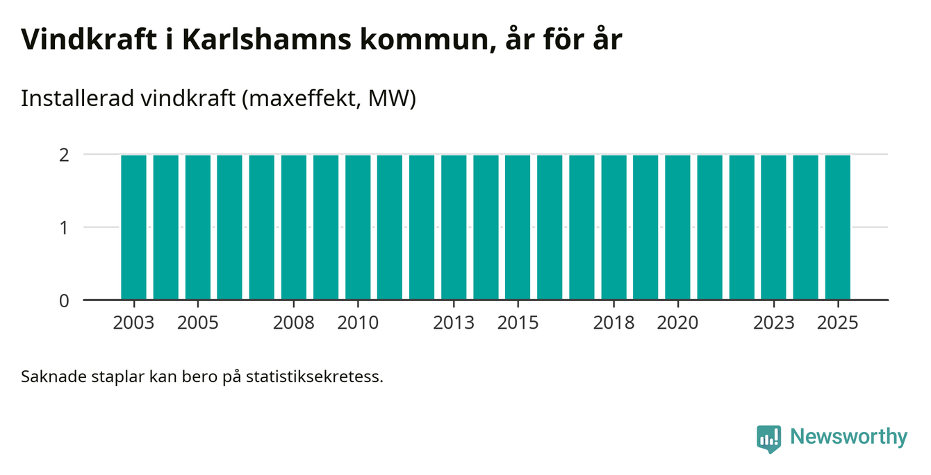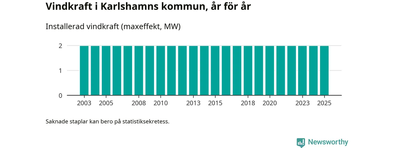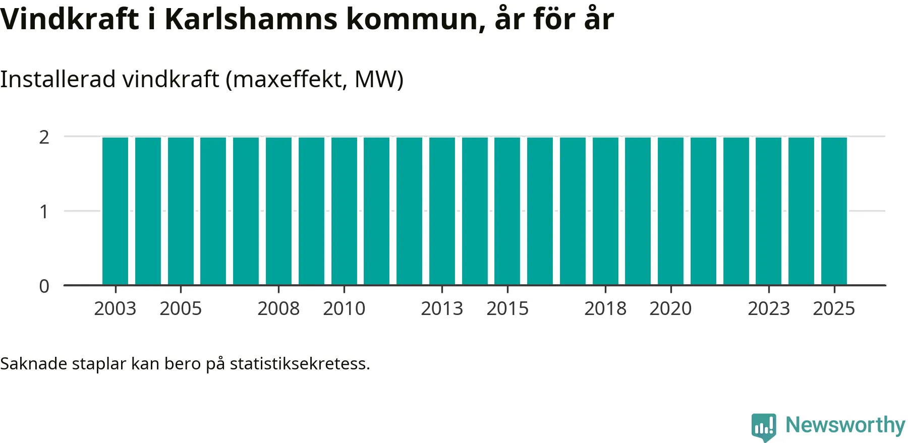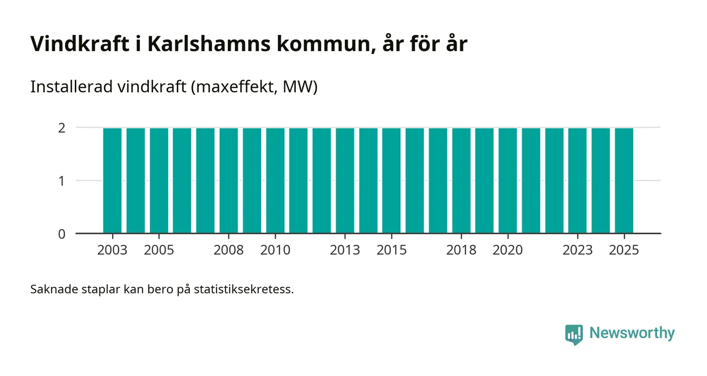 Totalt fanns i slutet av förra året tre vindkraftverk i Karlshamns kommun, med en sammanlagd maxeffekt på 2 megawatt. Det är, för 21:a året i rad, oförändrade siffror jämfört med året innan. Det visar nya siffror från Energimyndigheten.