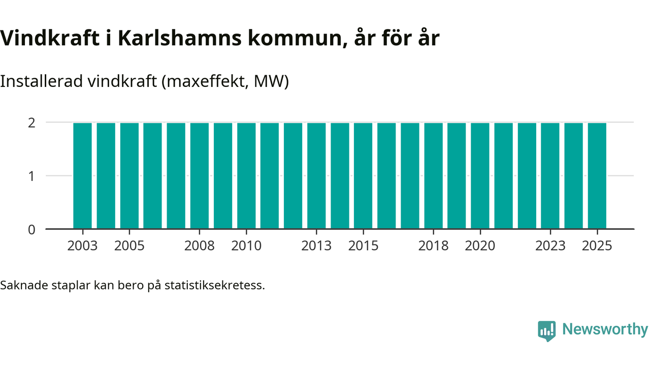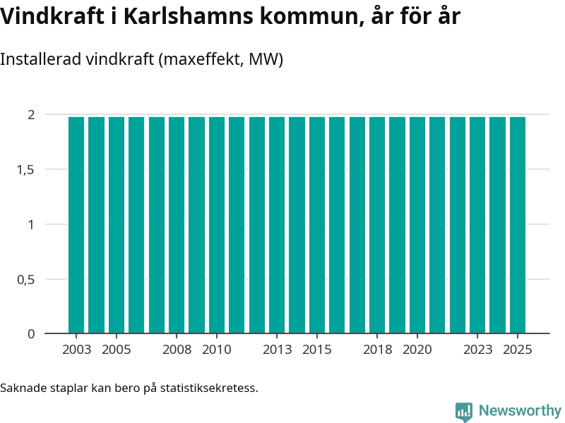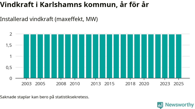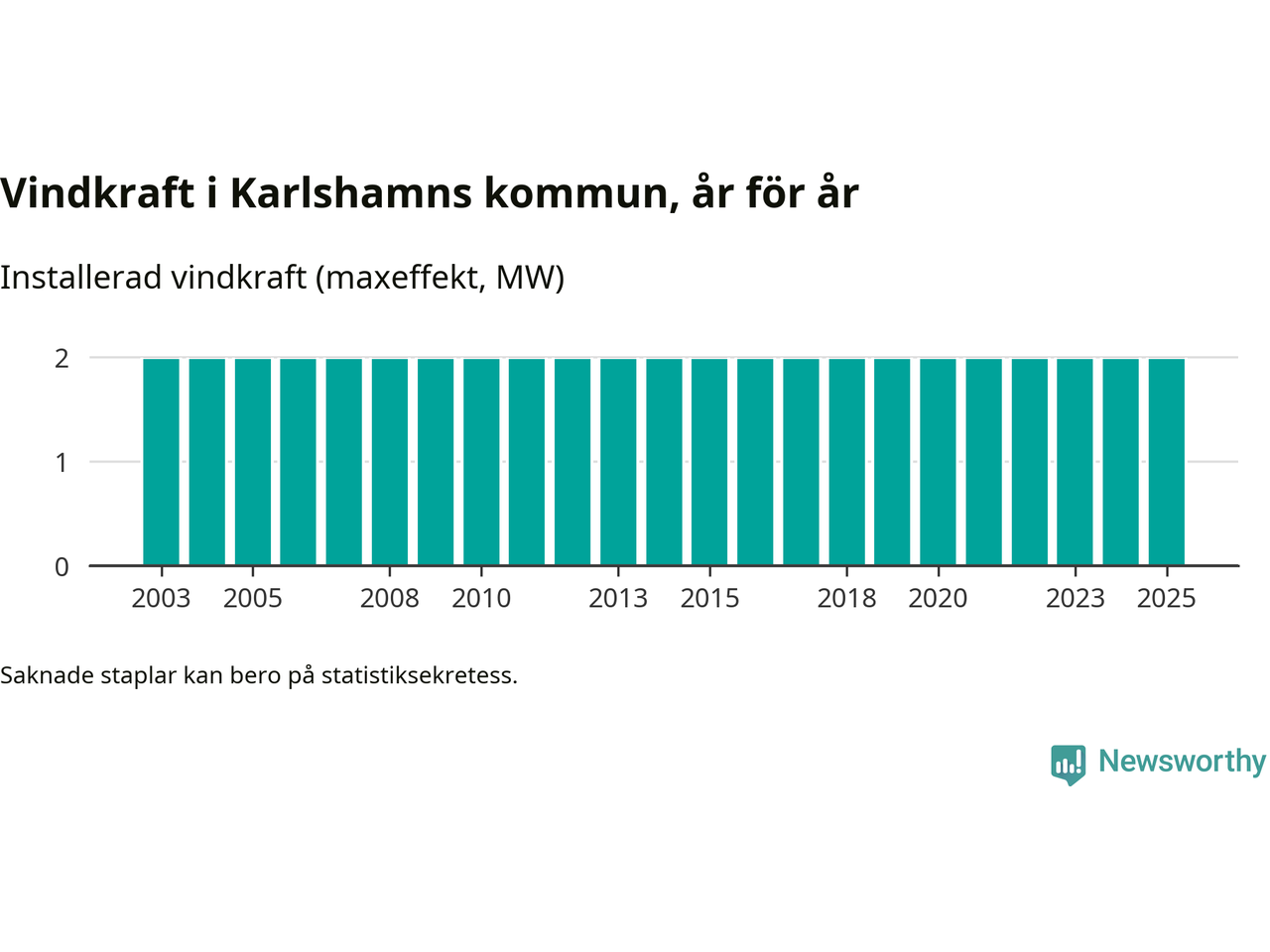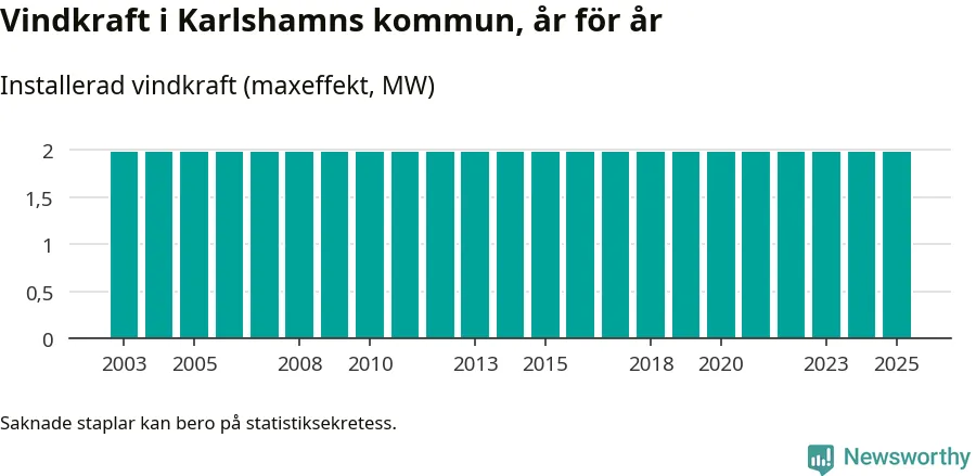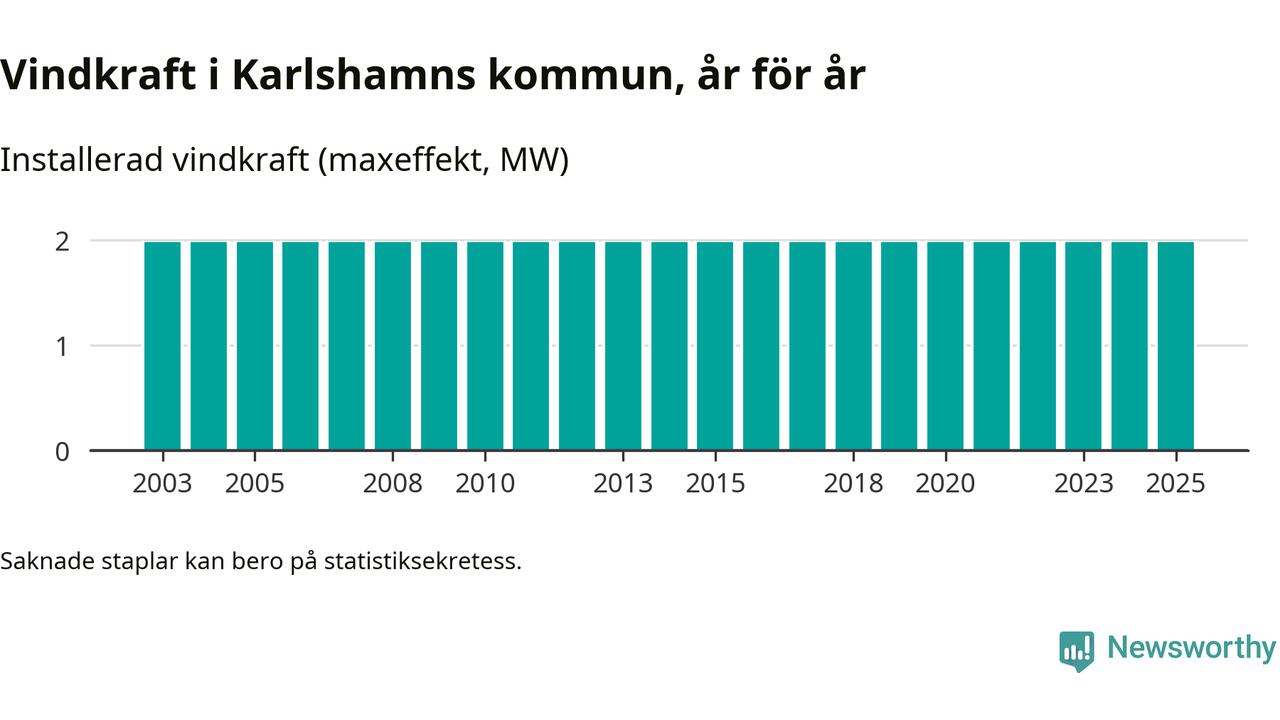 Totalt fanns i slutet av förra året tre vindkraftverk i Karlshamns kommun, med en sammanlagd maxeffekt på 2 megawatt. Det är, för 21:a året i rad, oförändrade siffror jämfört med året innan. Det visar nya siffror från Energimyndigheten.