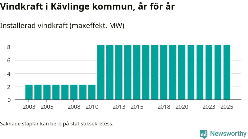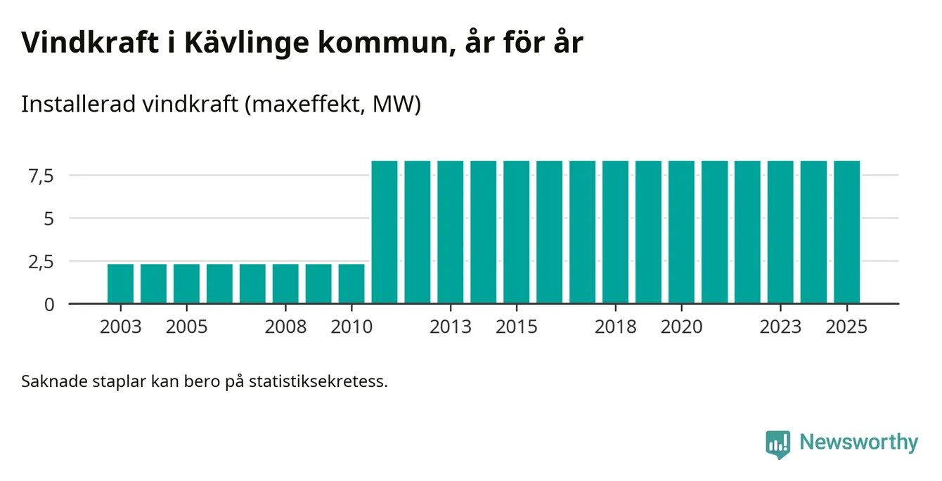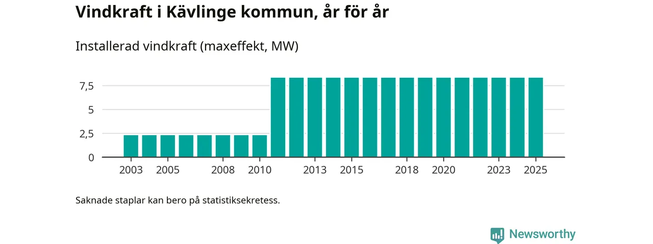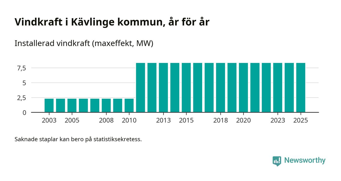 Totalt fanns i slutet av förra året sju vindkraftverk i Kävlinge kommun, med en sammanlagd maxeffekt på 8 megawatt. Det är, för 14:e året i rad, oförändrade siffror jämfört med året innan. Det visar nya siffror från Energimyndigheten.