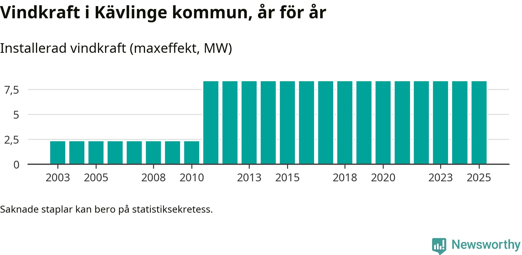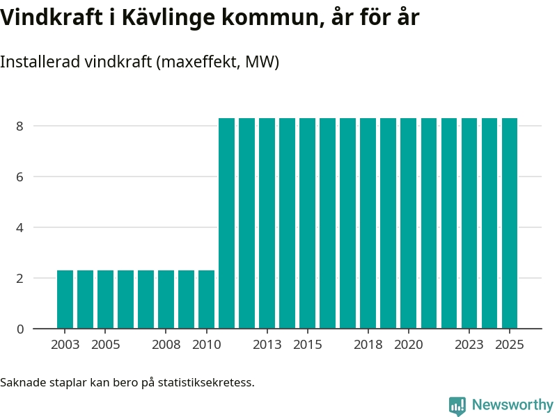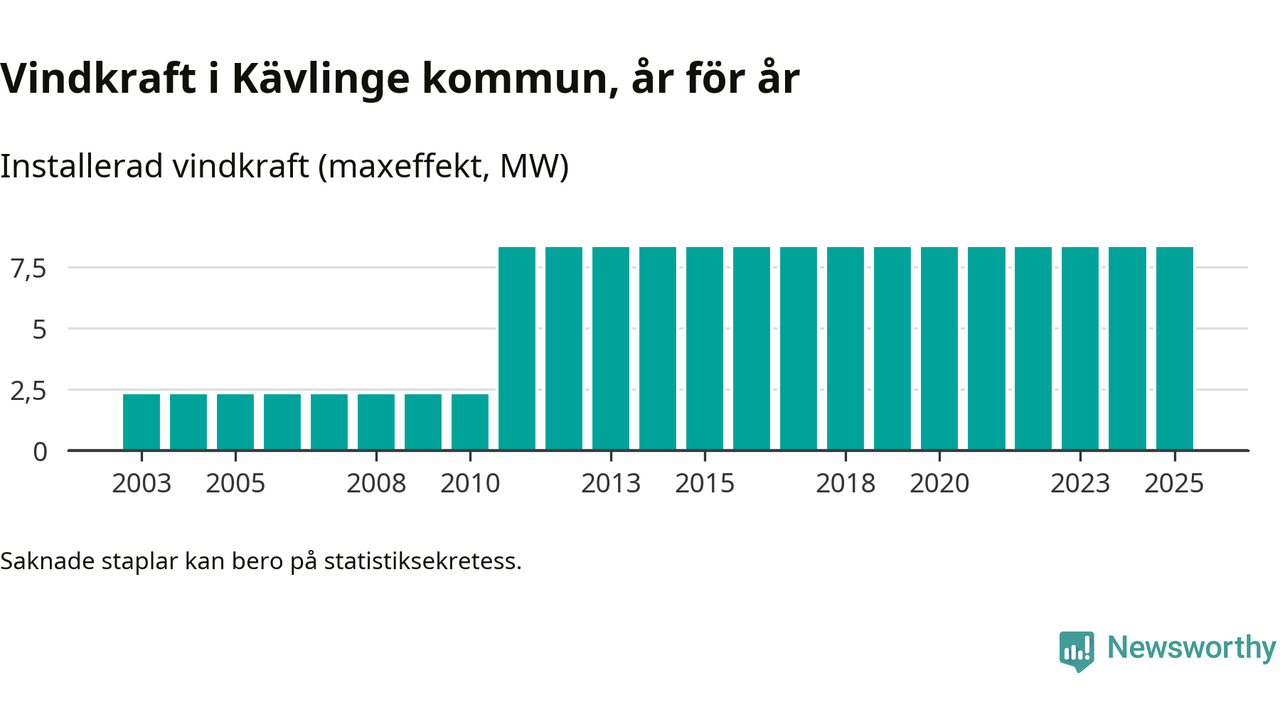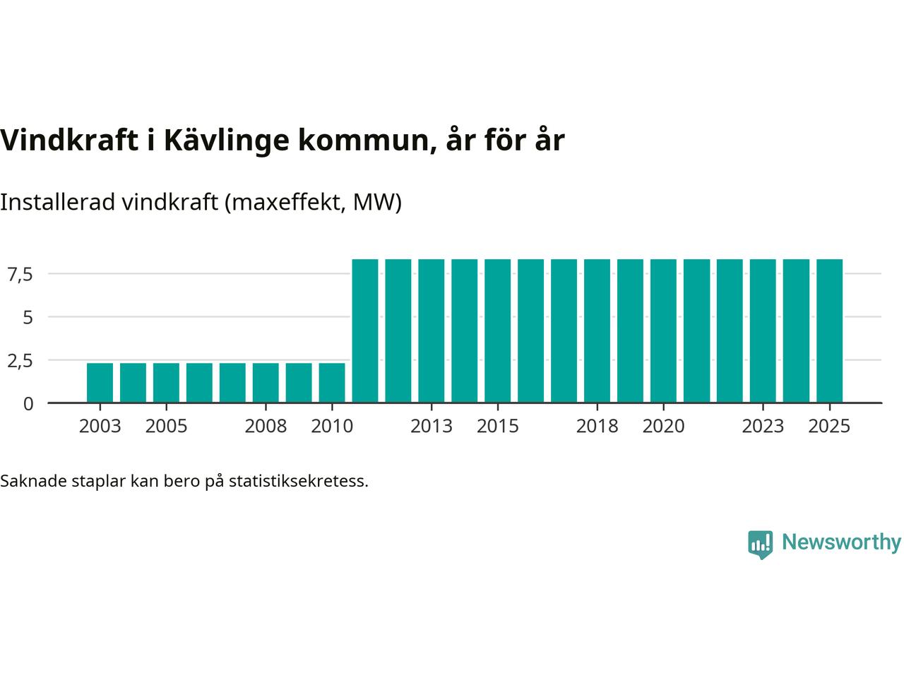 Totalt fanns i slutet av förra året sju vindkraftverk i Kävlinge kommun, med en sammanlagd maxeffekt på 8 megawatt. Det är, för 14:e året i rad, oförändrade siffror jämfört med året innan. Det visar nya siffror från Energimyndigheten.