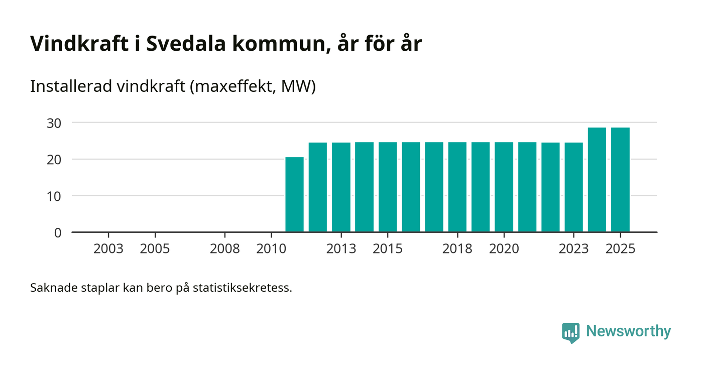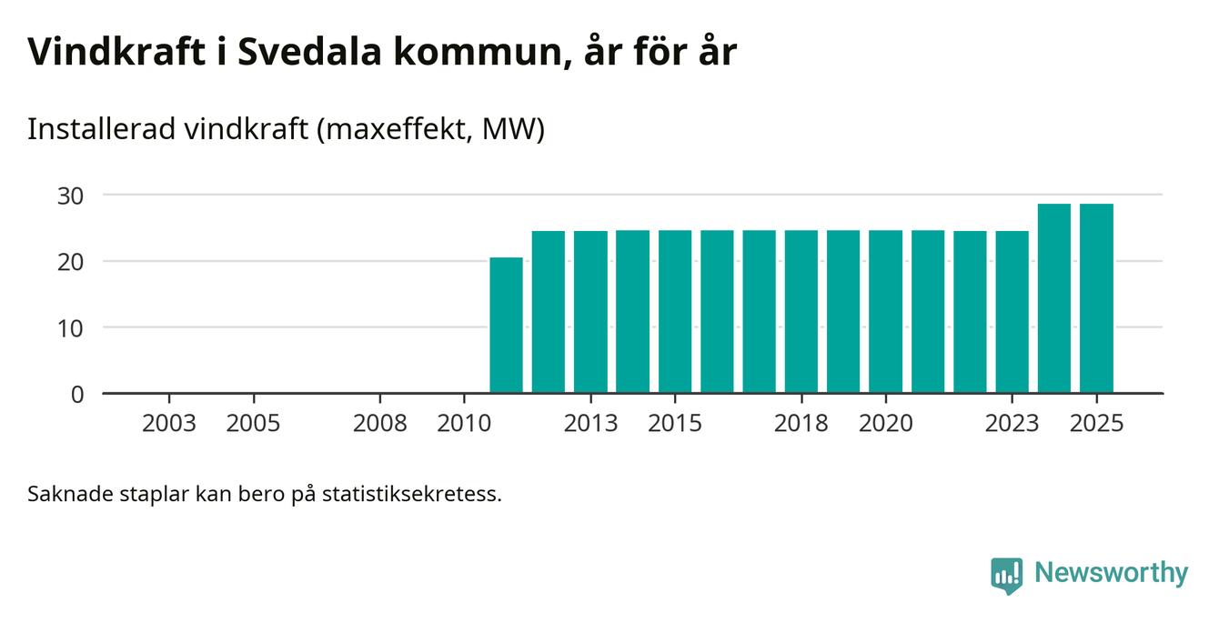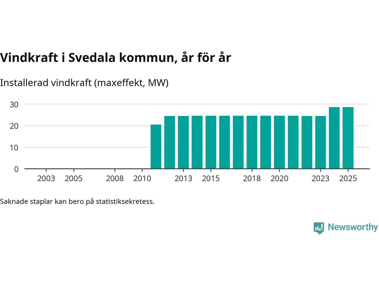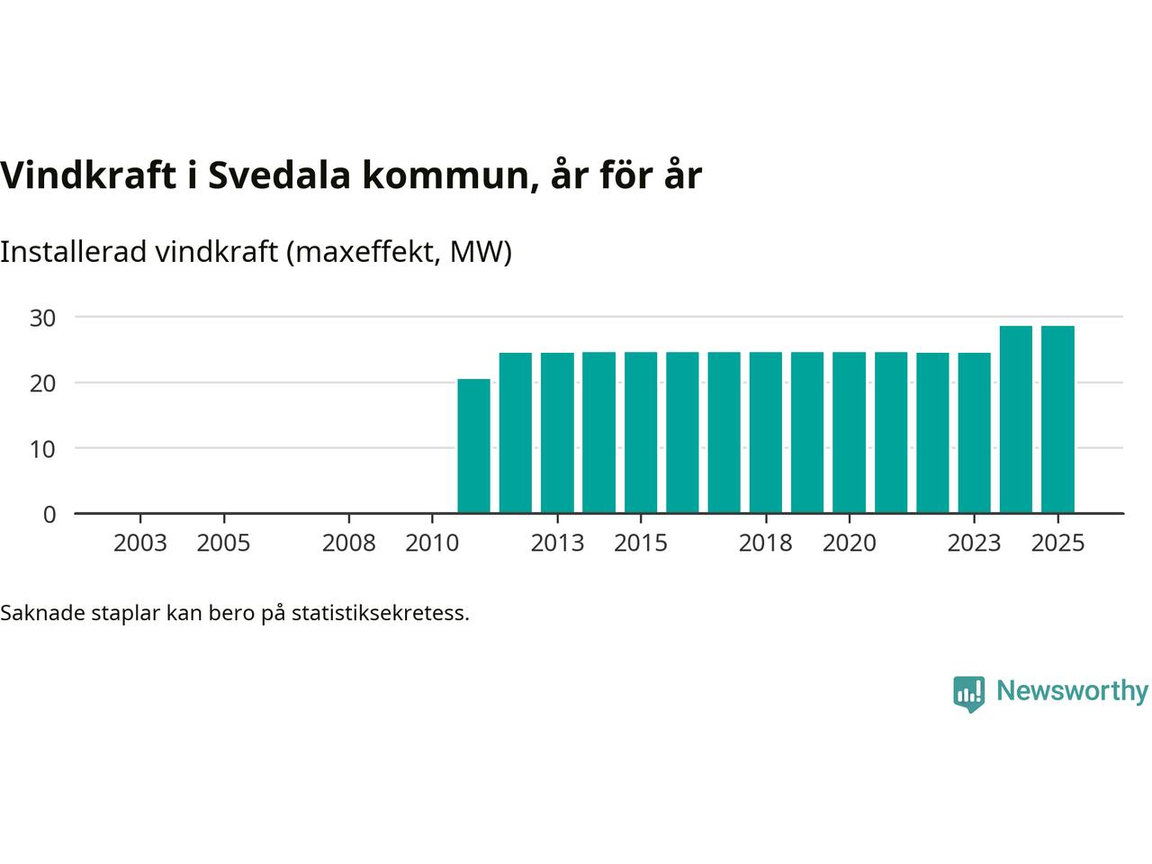 Totalt fanns i slutet av förra året 14 vindkraftverk i Svedala kommun, med en sammanlagd maxeffekt på 29 megawatt. Det är oförändrade siffror jämfört med året innan. Det visar nya siffror från Energimyndigheten.
