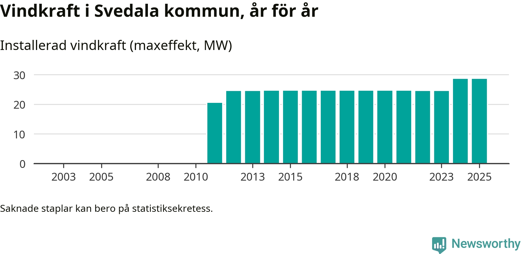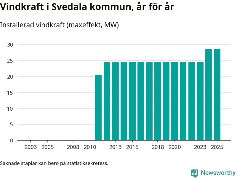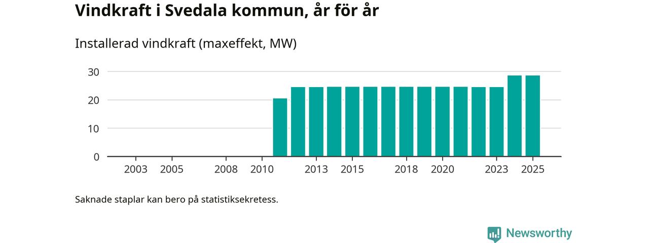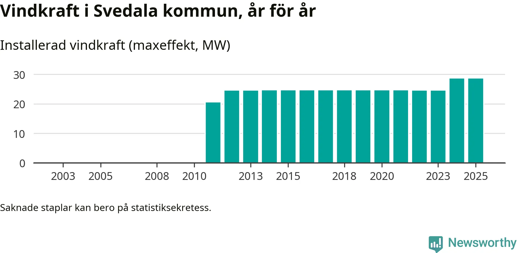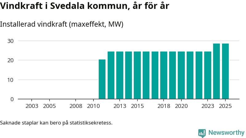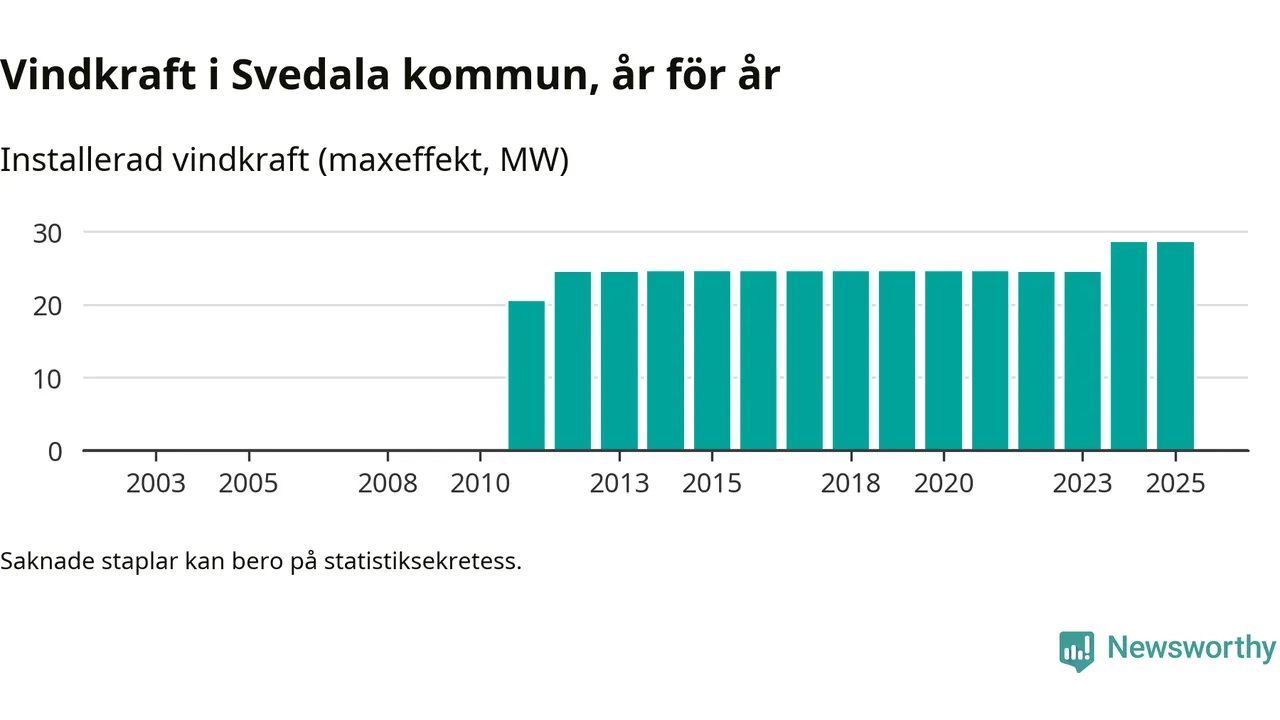 Totalt fanns i slutet av förra året 14 vindkraftverk i Svedala kommun, med en sammanlagd maxeffekt på 29 megawatt. Det är oförändrade siffror jämfört med året innan. Det visar nya siffror från Energimyndigheten.
