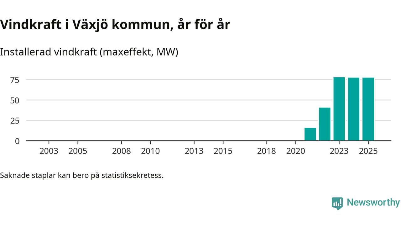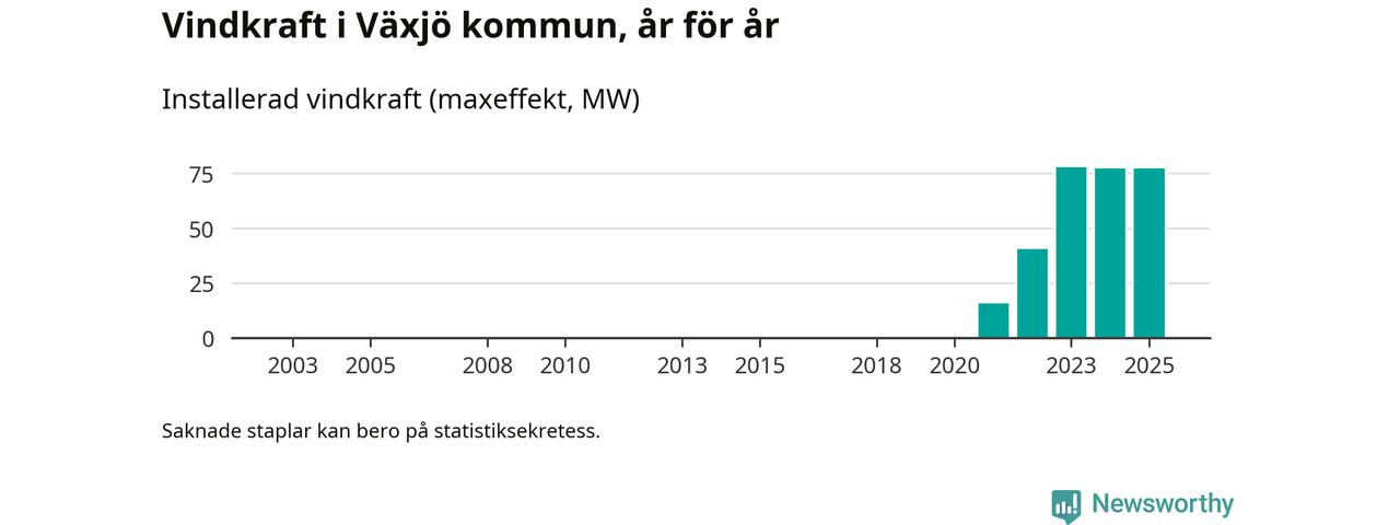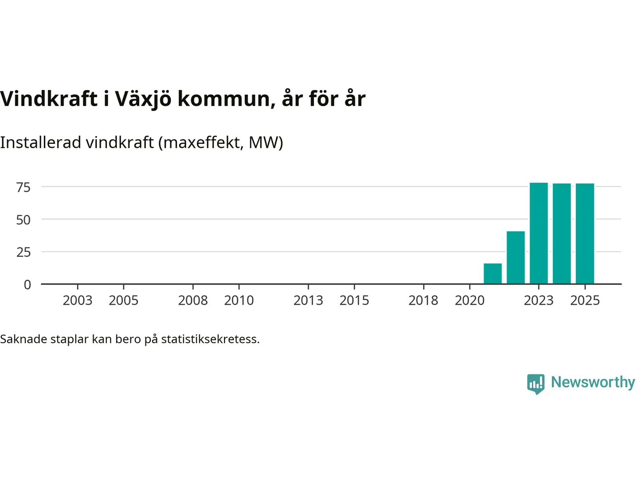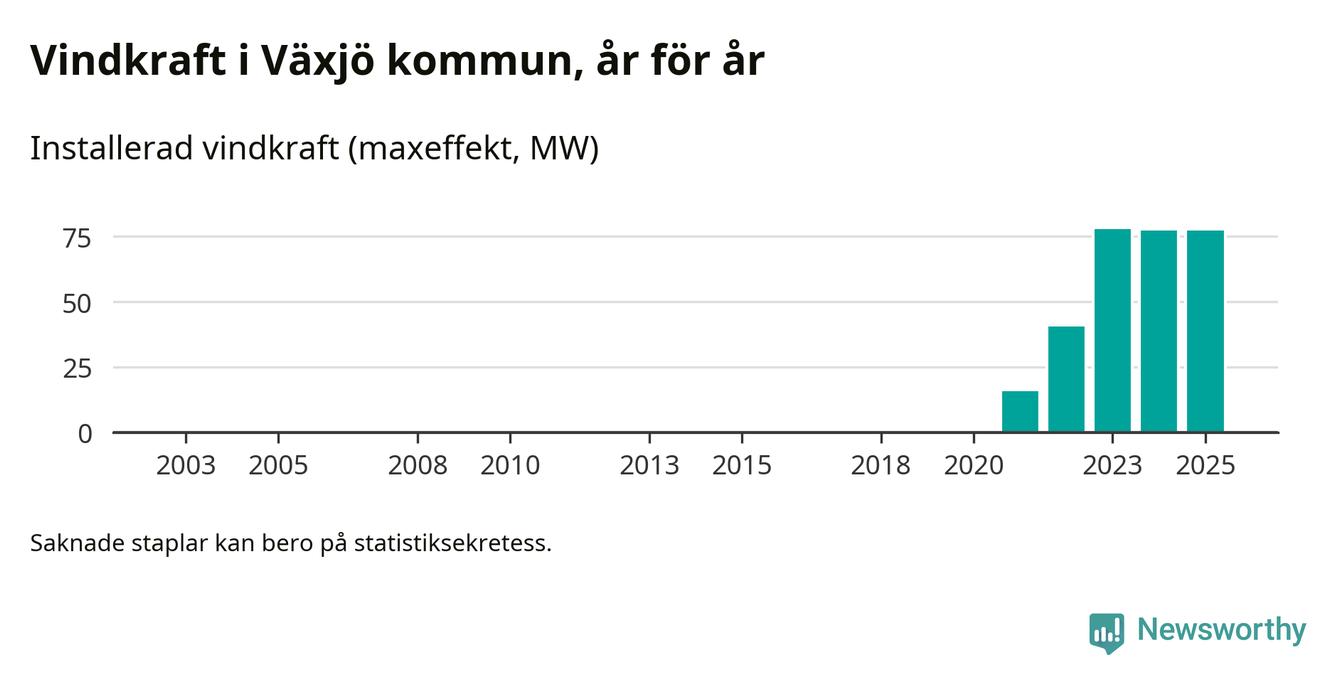 Totalt fanns i slutet av förra året 14 vindkraftverk i Växjö kommun, med en sammanlagd maxeffekt på 77 megawatt. Det är oförändrade siffror jämfört med året innan. Det visar nya siffror från Energimyndigheten.