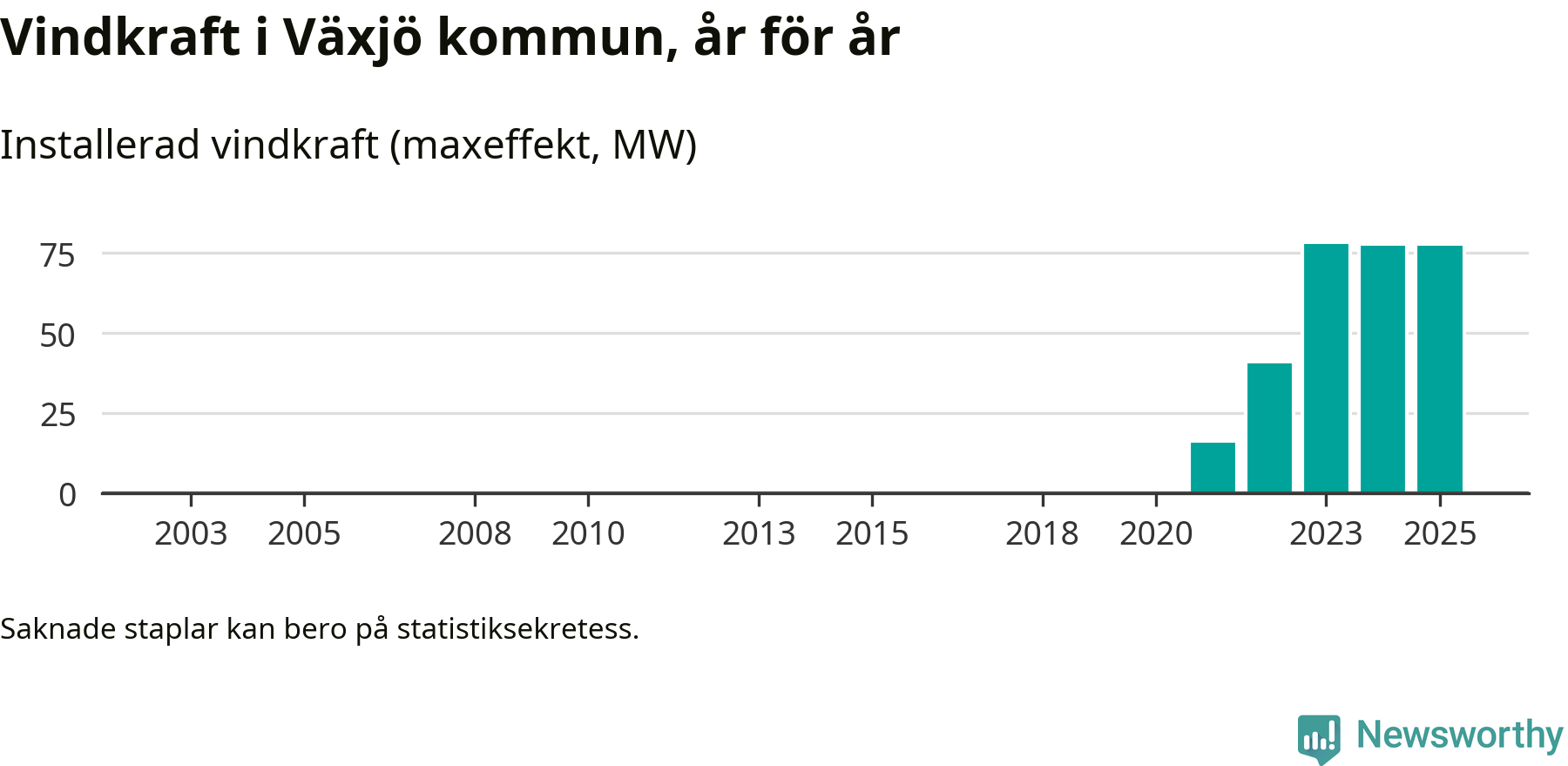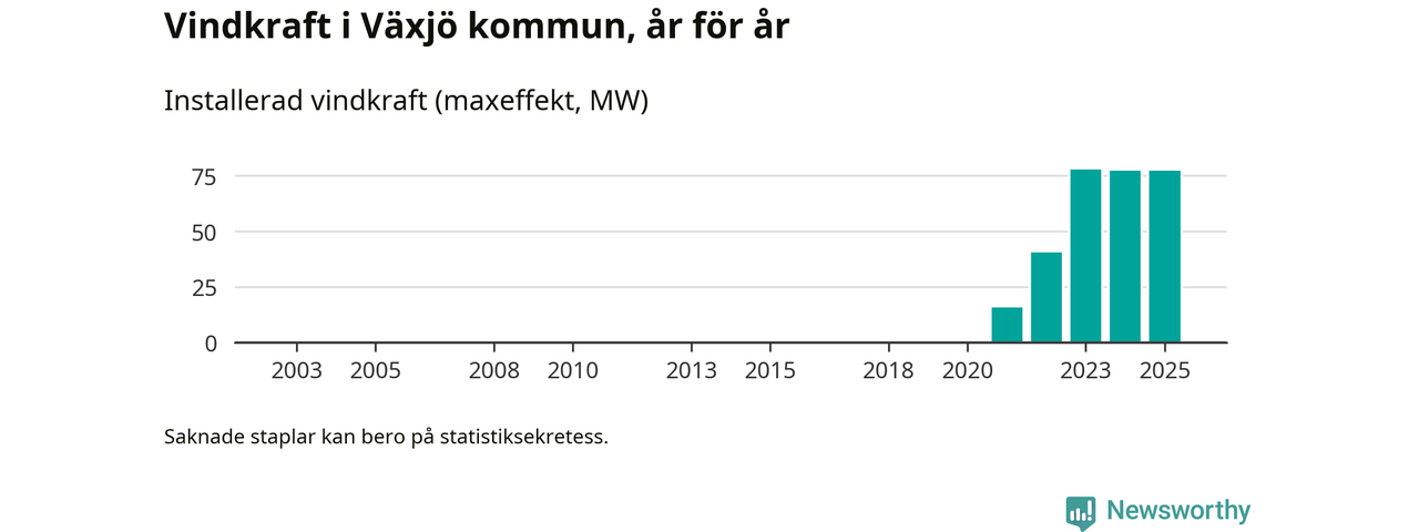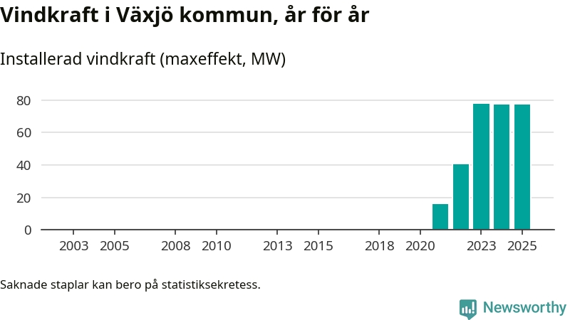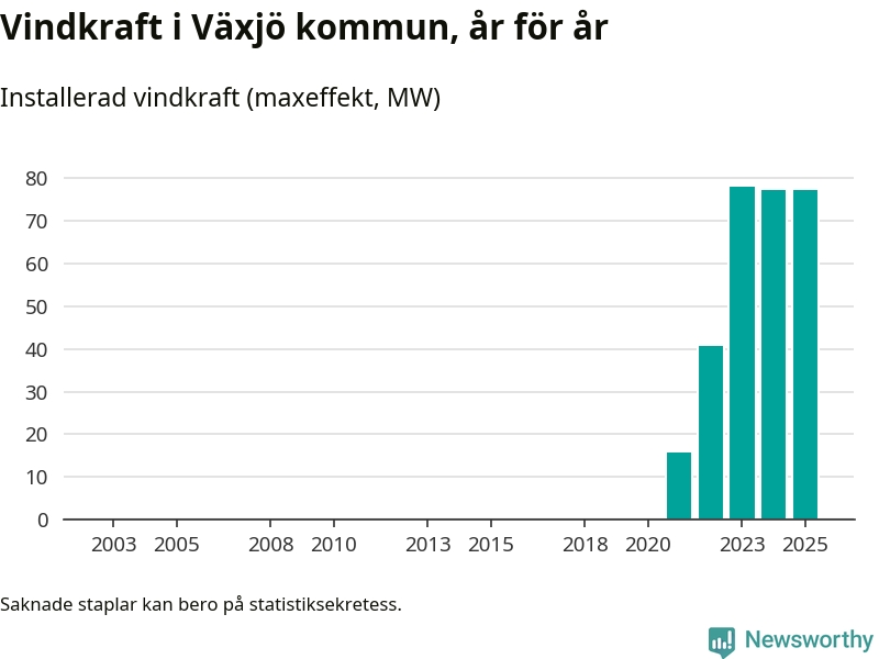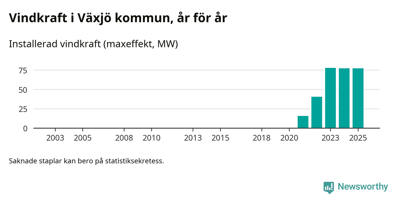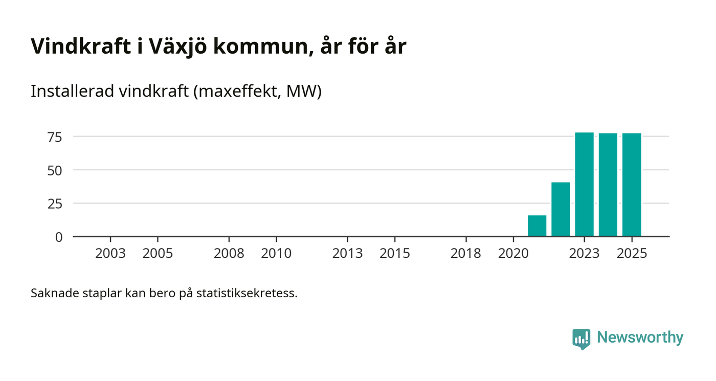 Totalt fanns i slutet av förra året 14 vindkraftverk i Växjö kommun, med en sammanlagd maxeffekt på 77 megawatt. Det är oförändrade siffror jämfört med året innan. Det visar nya siffror från Energimyndigheten.