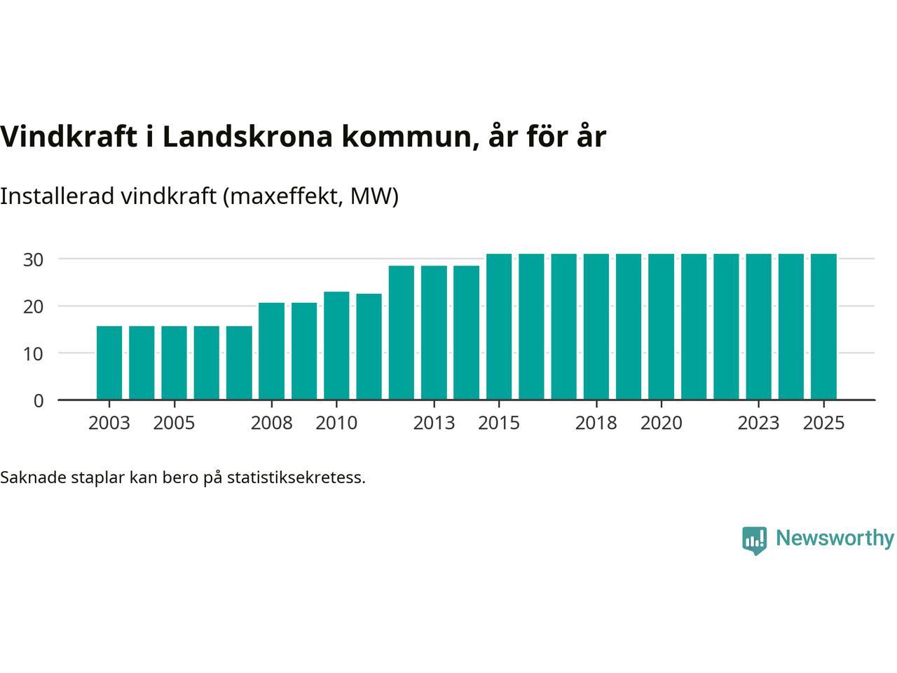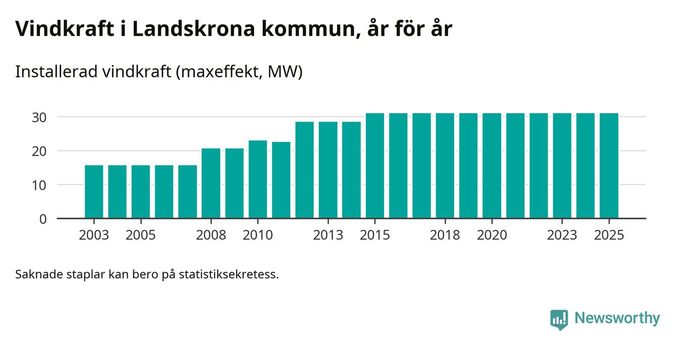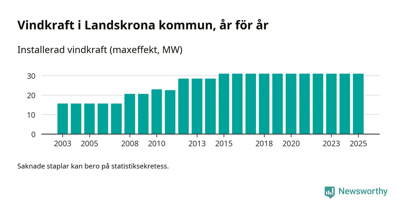 Totalt fanns i slutet av förra året 25 vindkraftverk i Landskrona kommun, med en sammanlagd maxeffekt på 31 megawatt. Det är, för tionde året i rad, oförändrade siffror jämfört med året innan. Det visar nya siffror från Energimyndigheten.