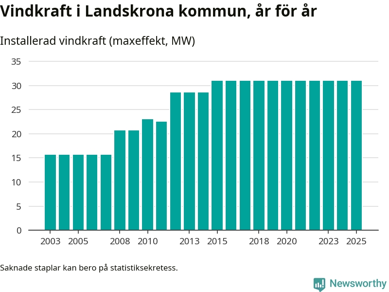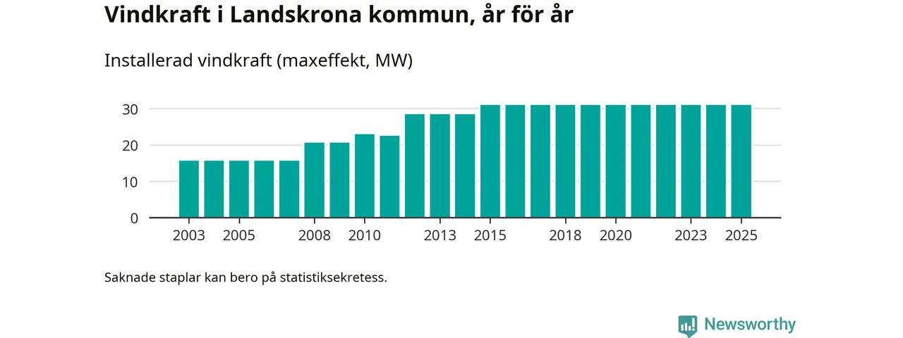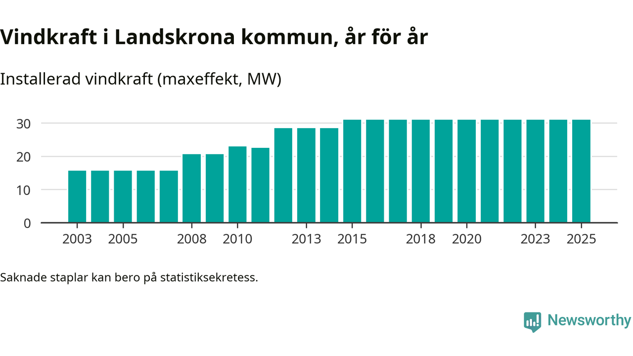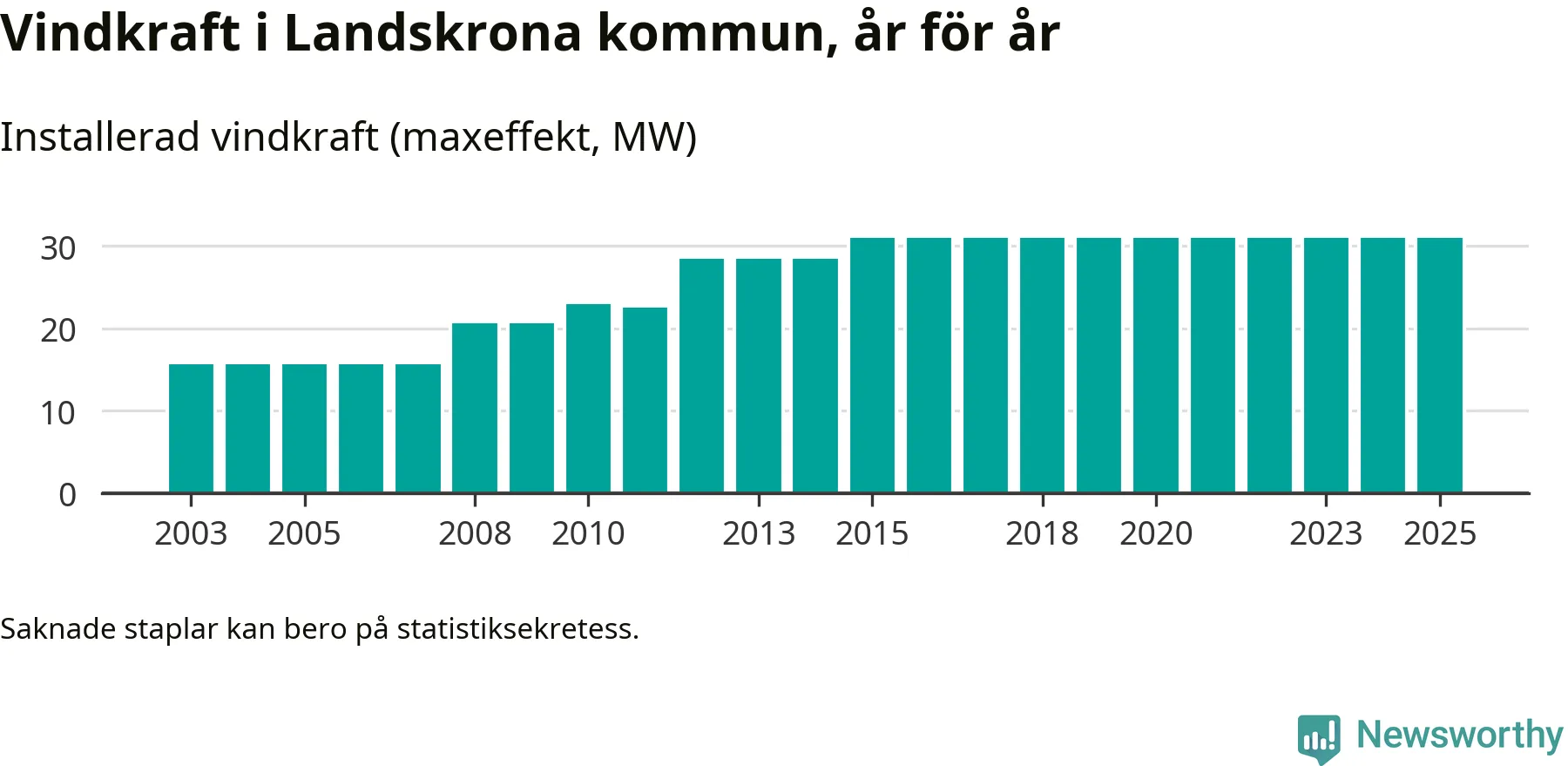 Totalt fanns i slutet av förra året 25 vindkraftverk i Landskrona kommun, med en sammanlagd maxeffekt på 31 megawatt. Det är, för tionde året i rad, oförändrade siffror jämfört med året innan. Det visar nya siffror från Energimyndigheten.