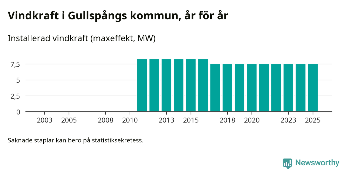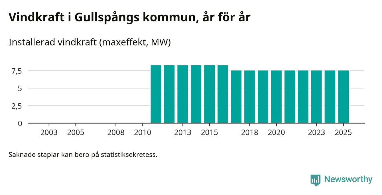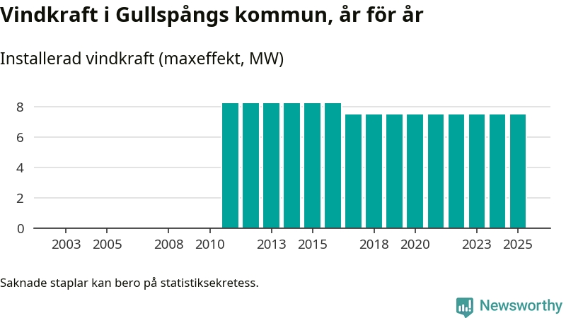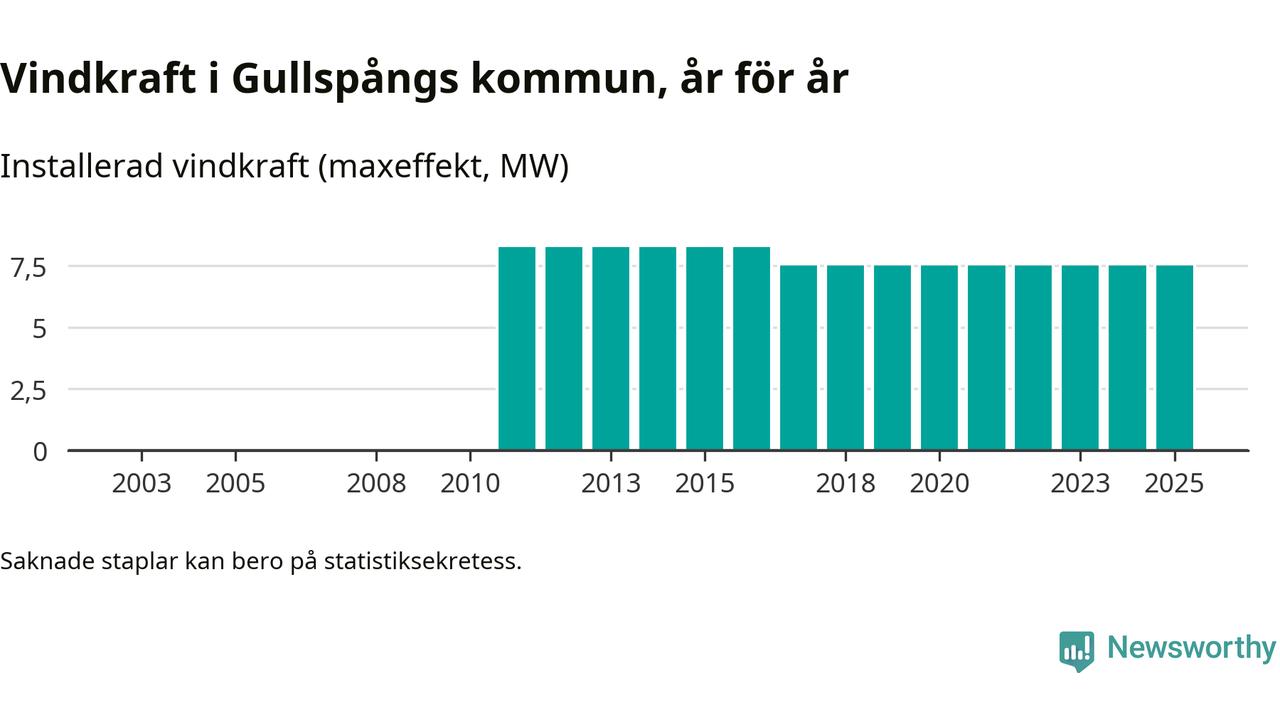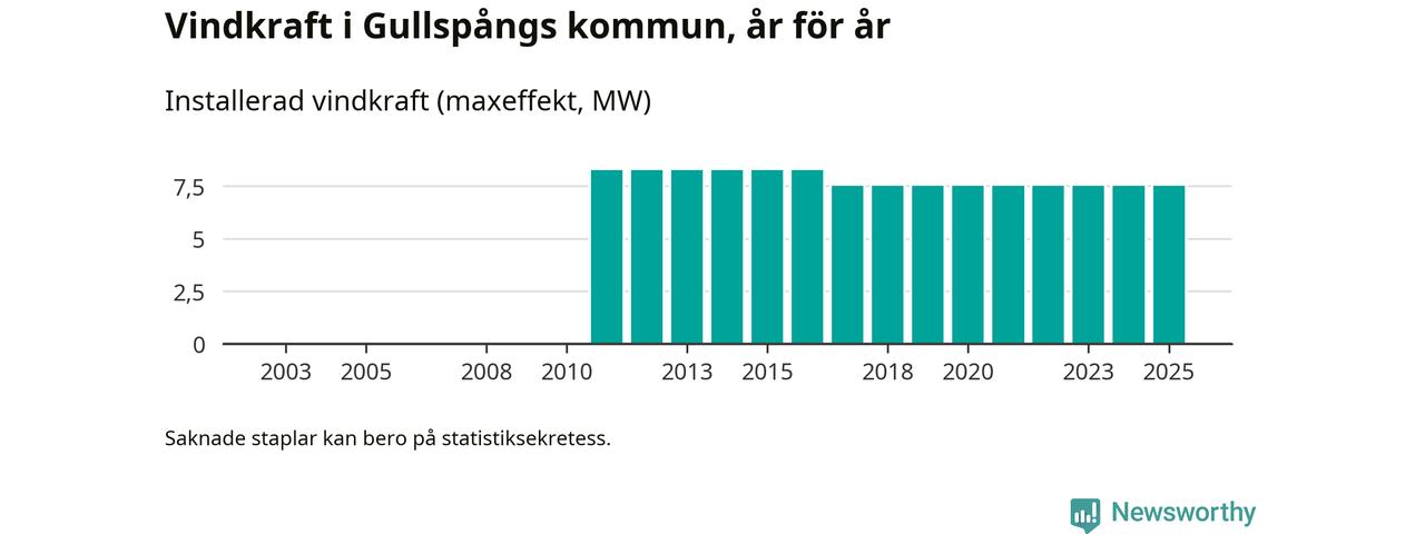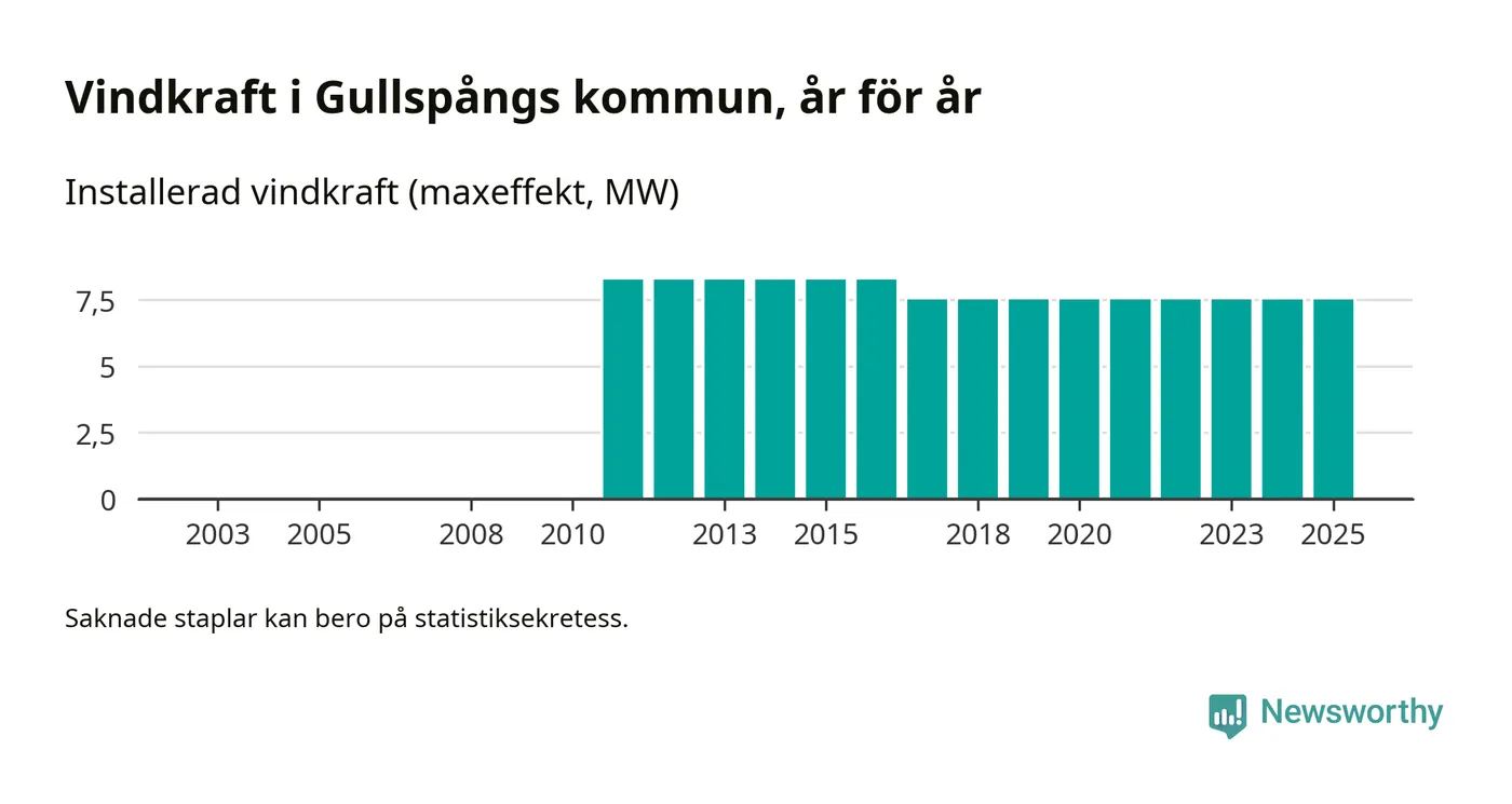 Totalt fanns i slutet av förra året tre vindkraftverk i Gullspångs kommun, med en sammanlagd maxeffekt på 8 megawatt. Det är, för åttonde året i rad, oförändrade siffror jämfört med året innan. Det visar nya siffror från Energimyndigheten.