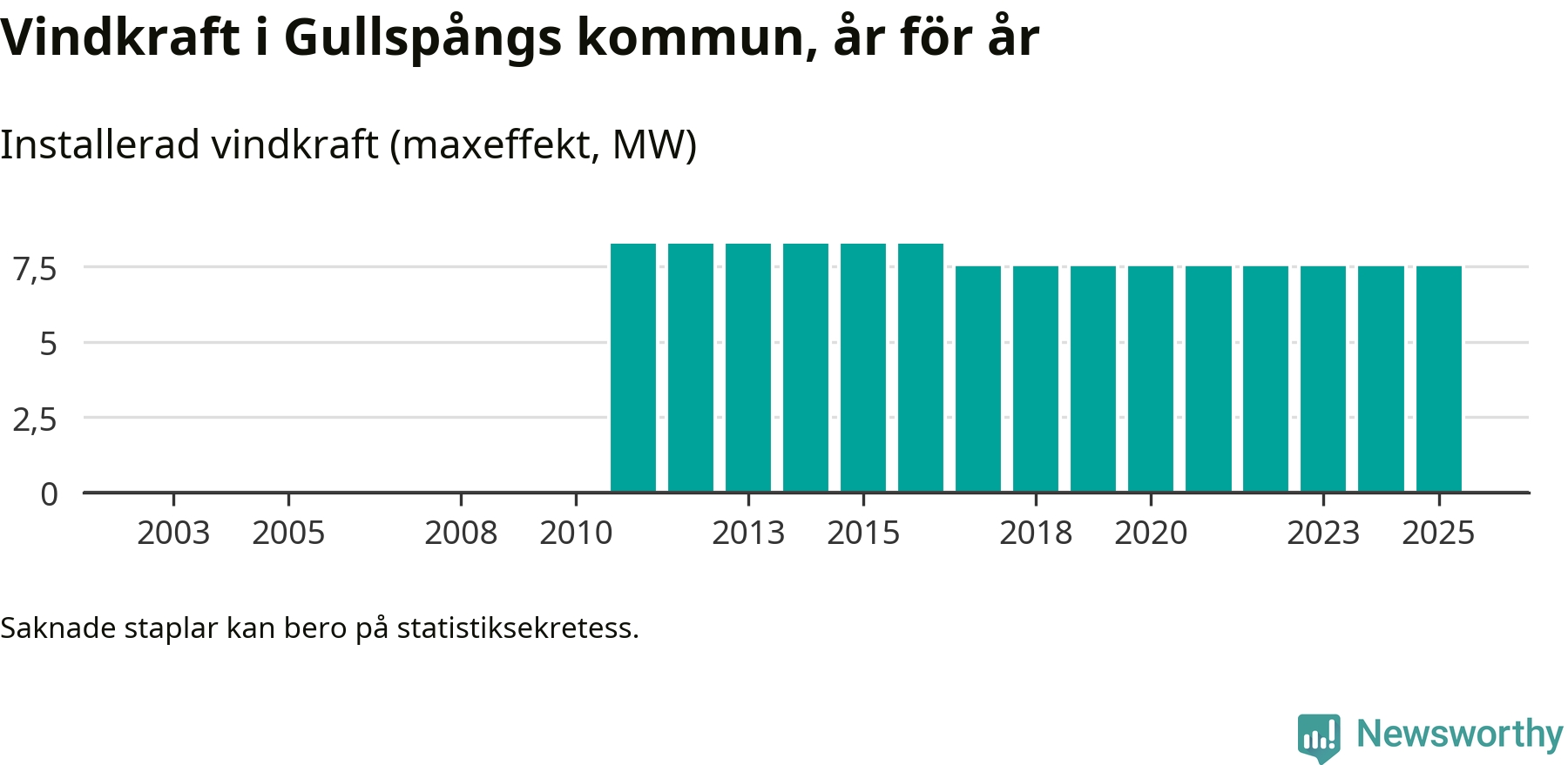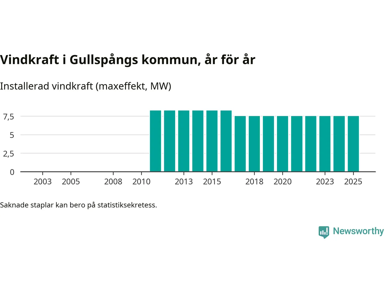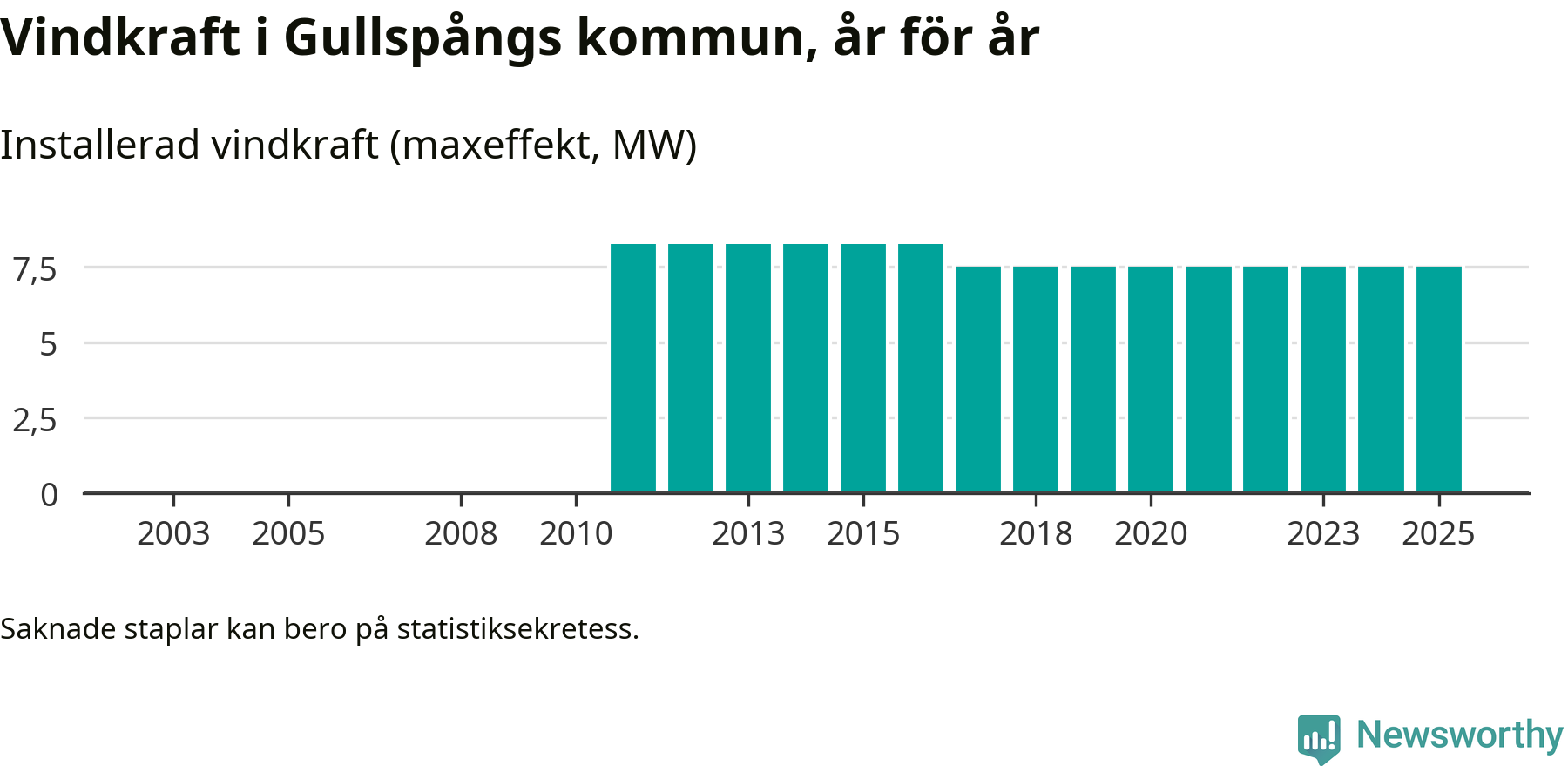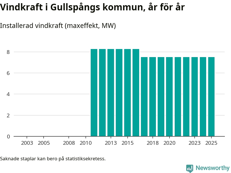 Totalt fanns i slutet av förra året tre vindkraftverk i Gullspångs kommun, med en sammanlagd maxeffekt på 8 megawatt. Det är, för åttonde året i rad, oförändrade siffror jämfört med året innan. Det visar nya siffror från Energimyndigheten.