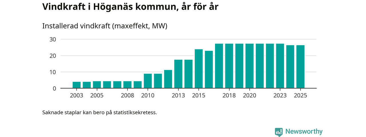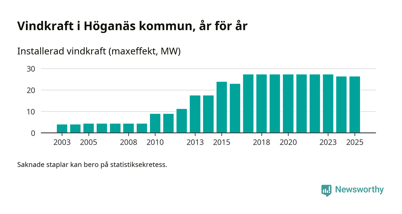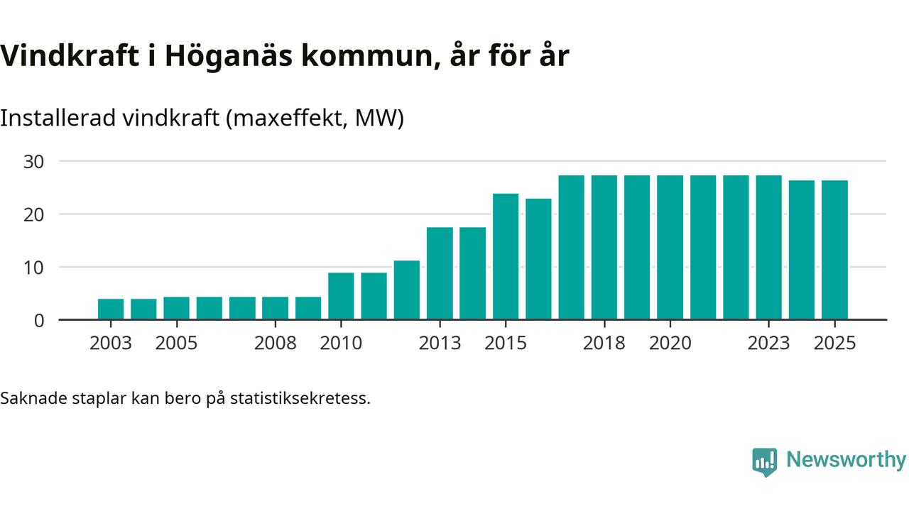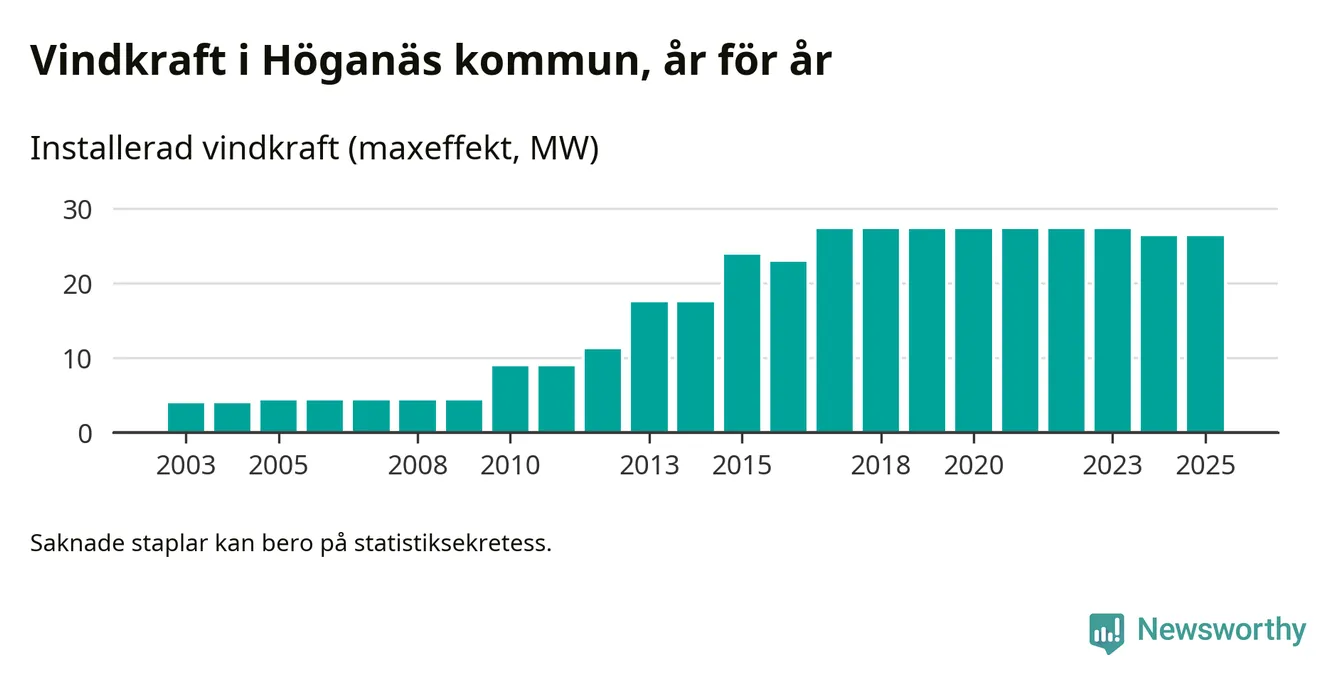 Totalt fanns i slutet av förra året 14 vindkraftverk i Höganäs kommun, med en sammanlagd maxeffekt på 26 megawatt. Det är oförändrade siffror jämfört med året innan. Det visar nya siffror från Energimyndigheten.