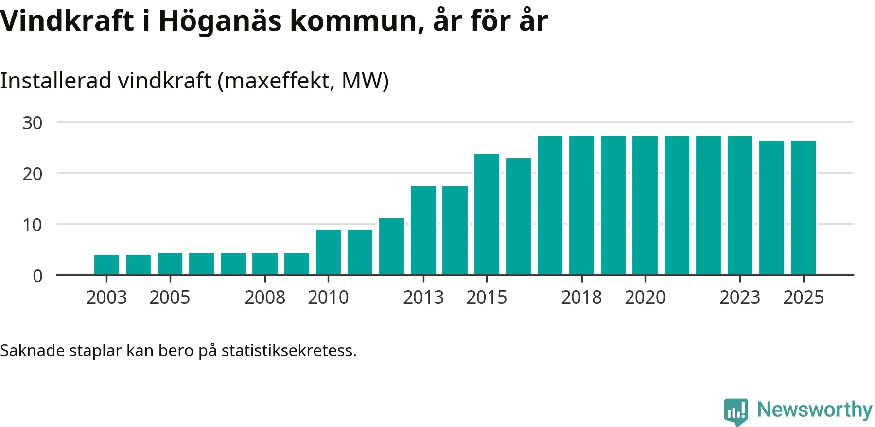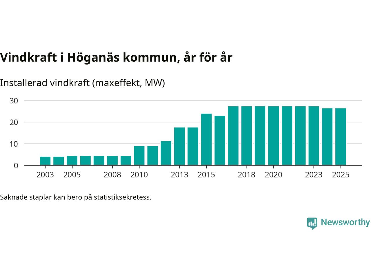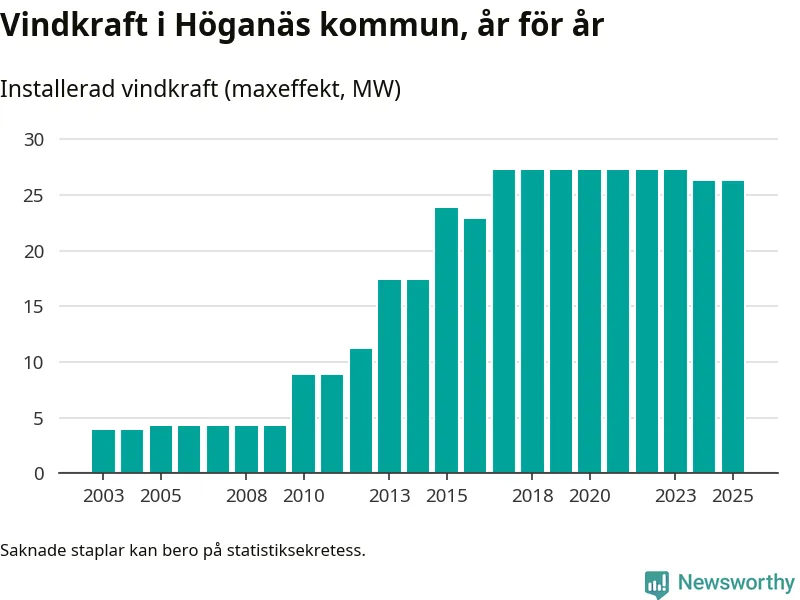Totalt fanns i slutet av förra året 14 vindkraftverk i Höganäs kommun, med en sammanlagd maxeffekt på 26 megawatt. Det är oförändrade siffror jämfört med året innan. Det visar nya siffror från Energimyndigheten.