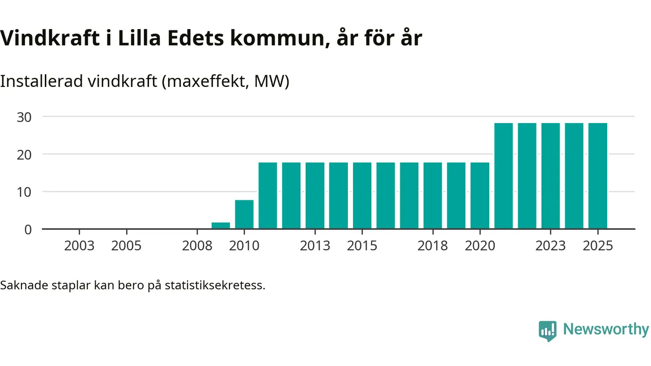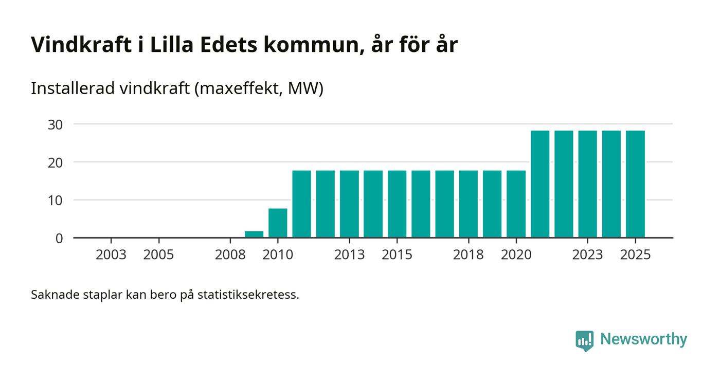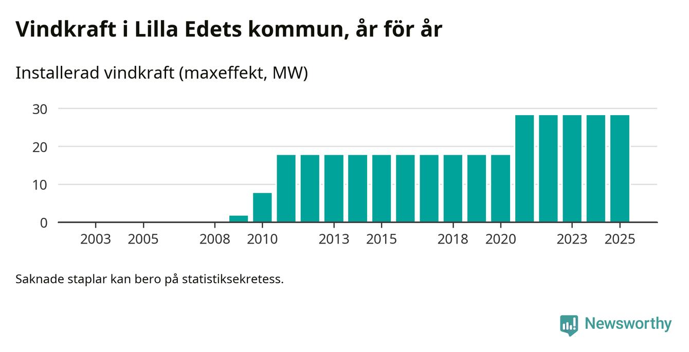 Totalt fanns i slutet av förra året 14 vindkraftverk i Lilla Edets kommun, med en sammanlagd maxeffekt på 28 megawatt. Det är, för fjärde året i rad, oförändrade siffror jämfört med året innan. Det visar nya siffror från Energimyndigheten.