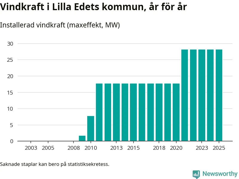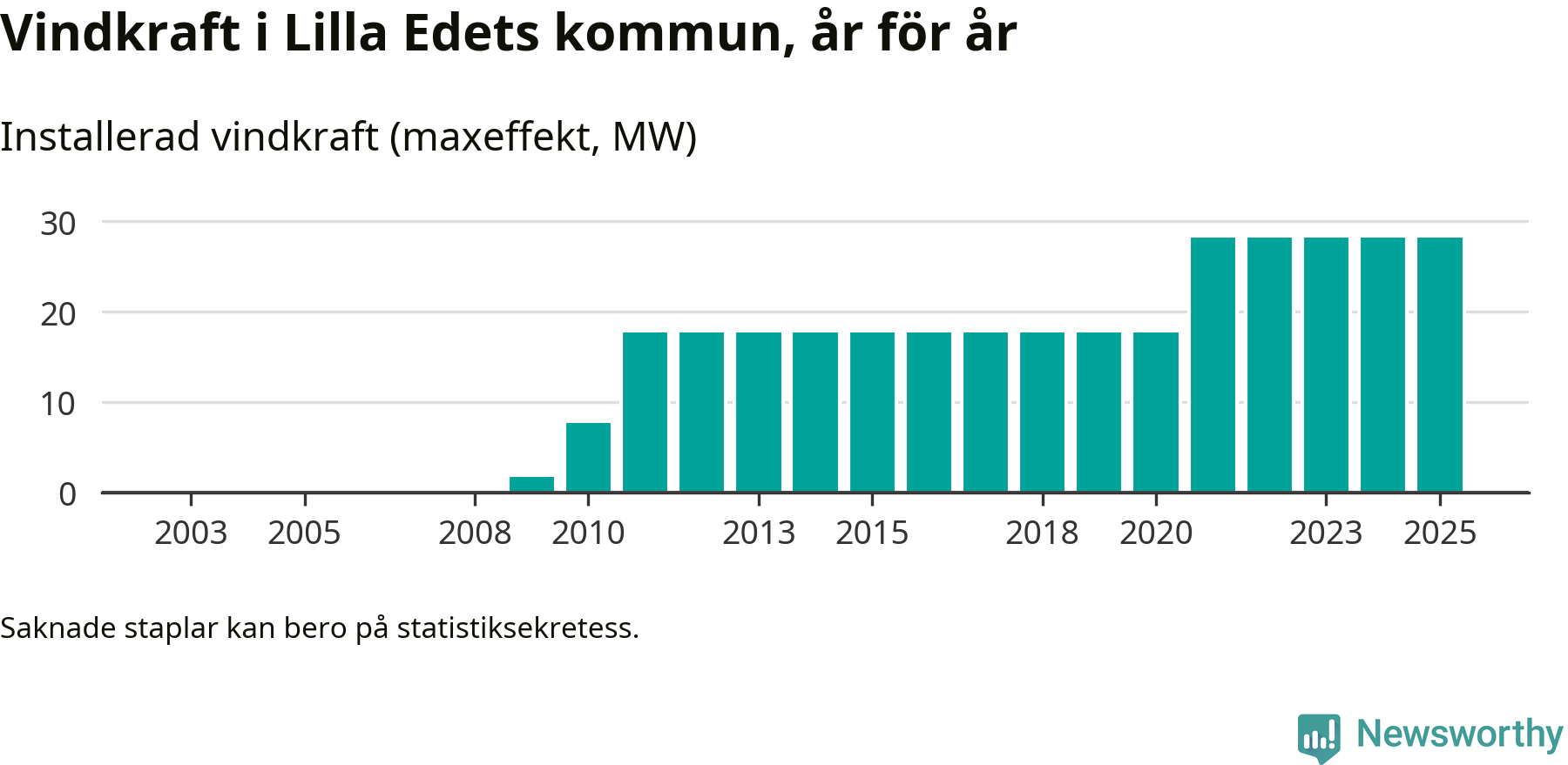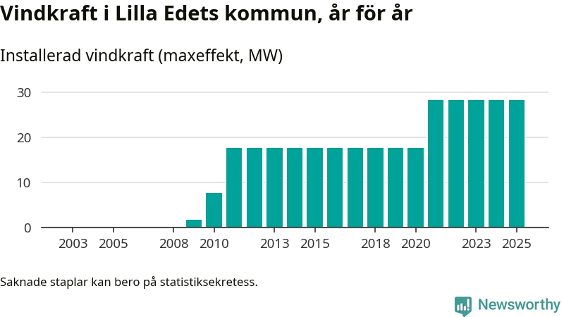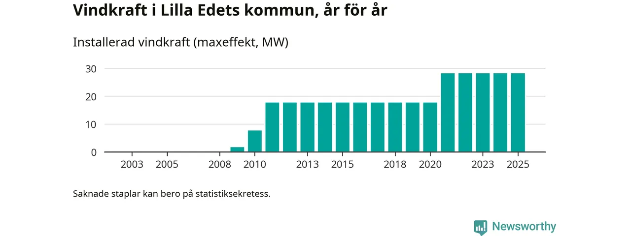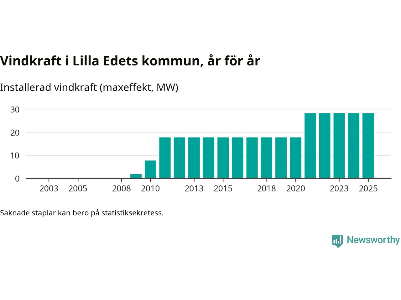 Totalt fanns i slutet av förra året 14 vindkraftverk i Lilla Edets kommun, med en sammanlagd maxeffekt på 28 megawatt. Det är, för fjärde året i rad, oförändrade siffror jämfört med året innan. Det visar nya siffror från Energimyndigheten.
