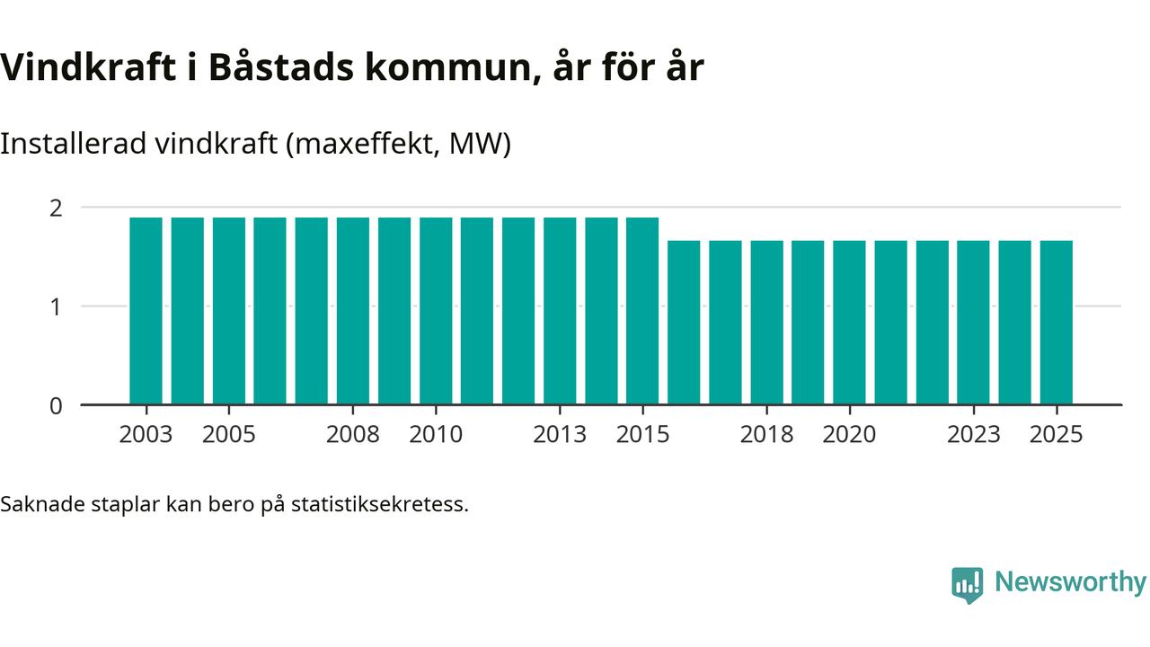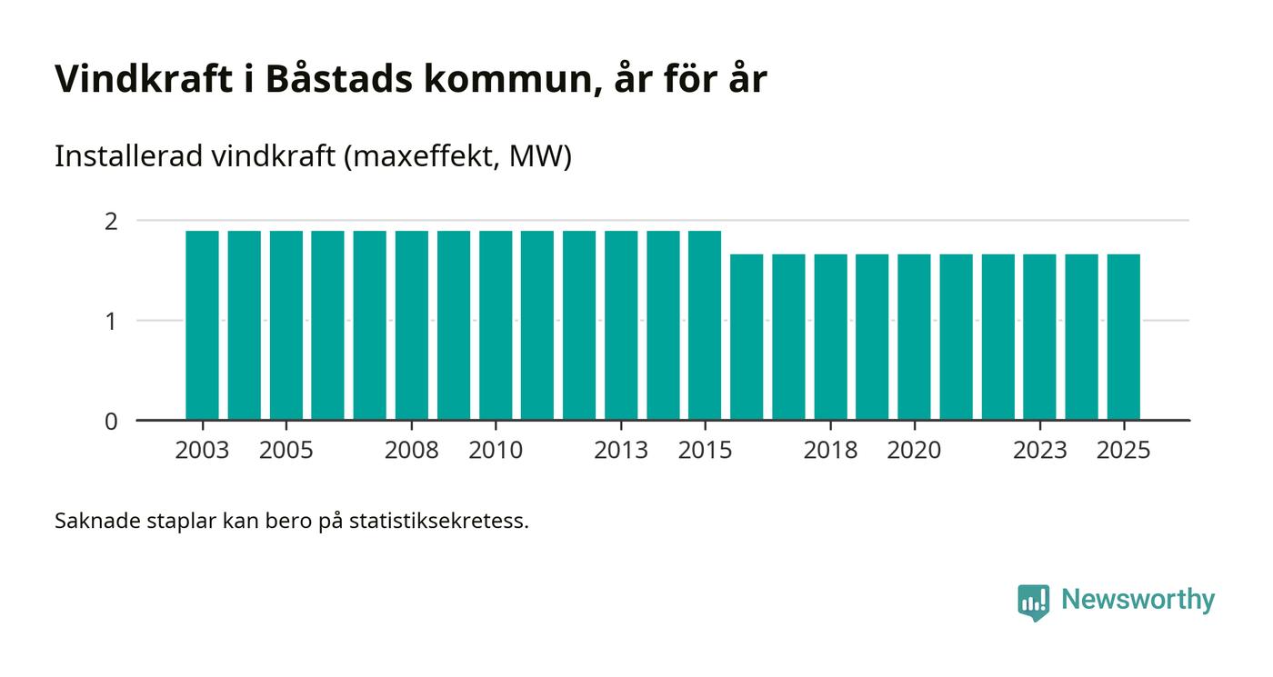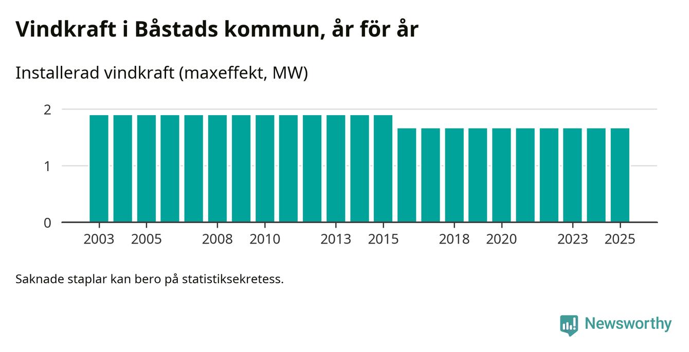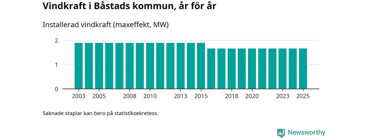Totalt fanns i slutet av förra året tre vindkraftverk i Båstads kommun, med en sammanlagd maxeffekt på 2 megawatt. Det är, för nionde året i rad, oförändrade siffror jämfört med året innan. Det visar nya siffror från Energimyndigheten.
