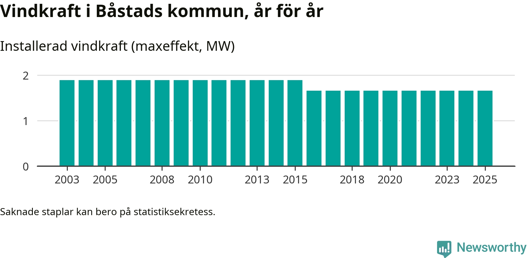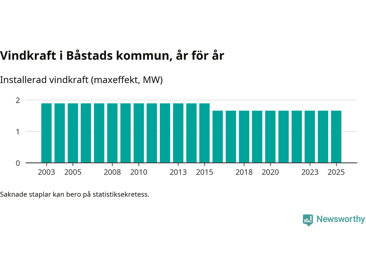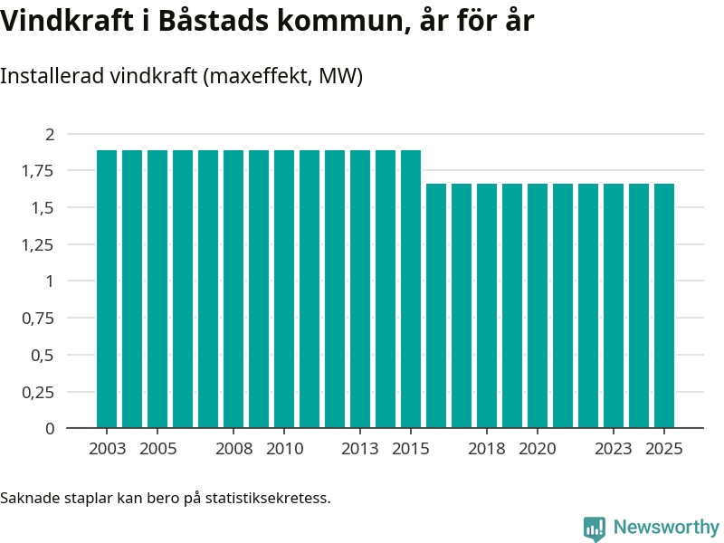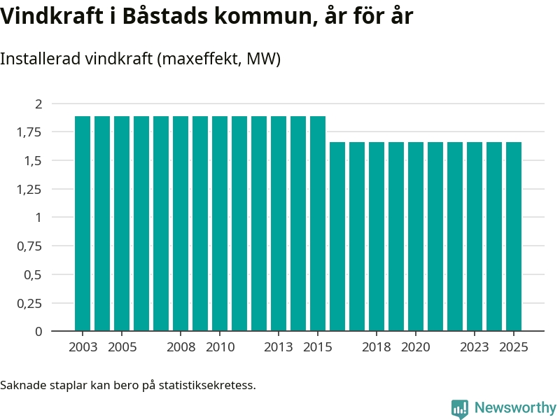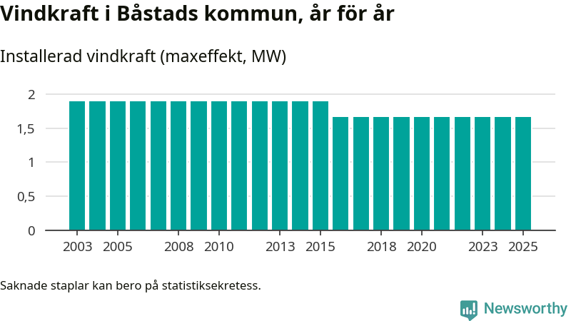 Totalt fanns i slutet av förra året tre vindkraftverk i Båstads kommun, med en sammanlagd maxeffekt på 2 megawatt. Det är, för nionde året i rad, oförändrade siffror jämfört med året innan. Det visar nya siffror från Energimyndigheten.