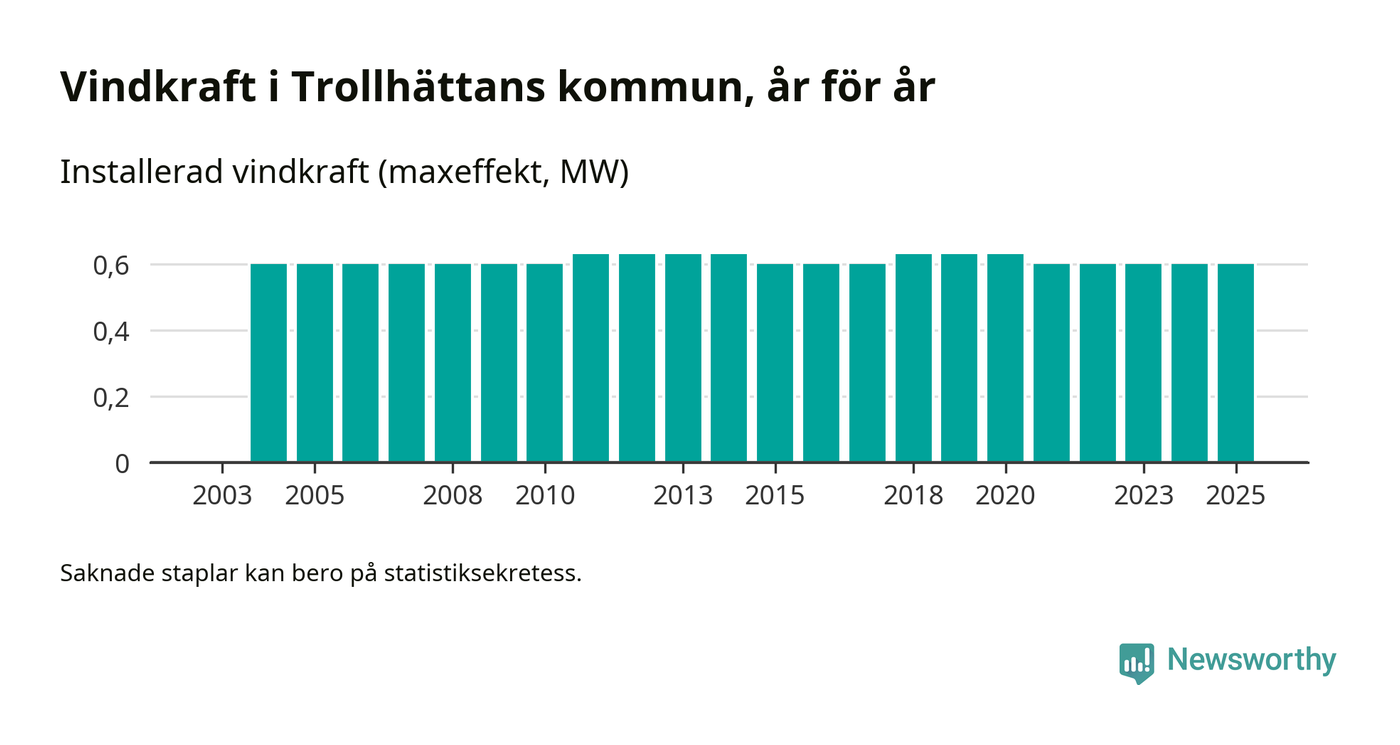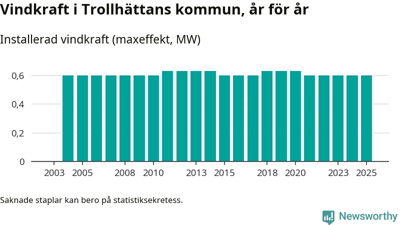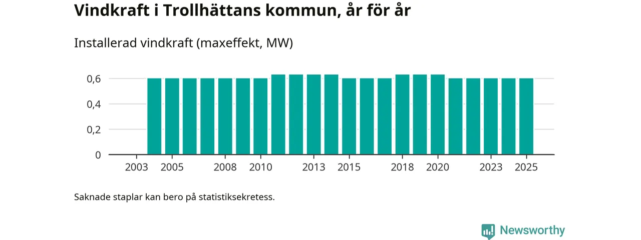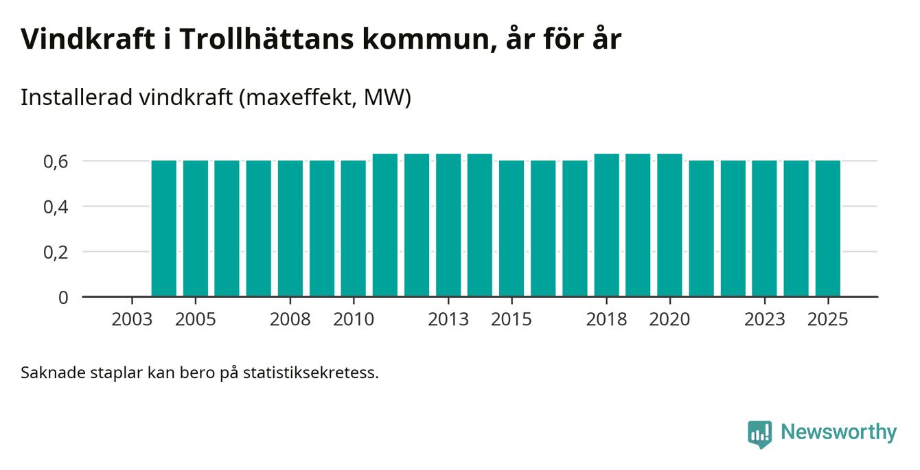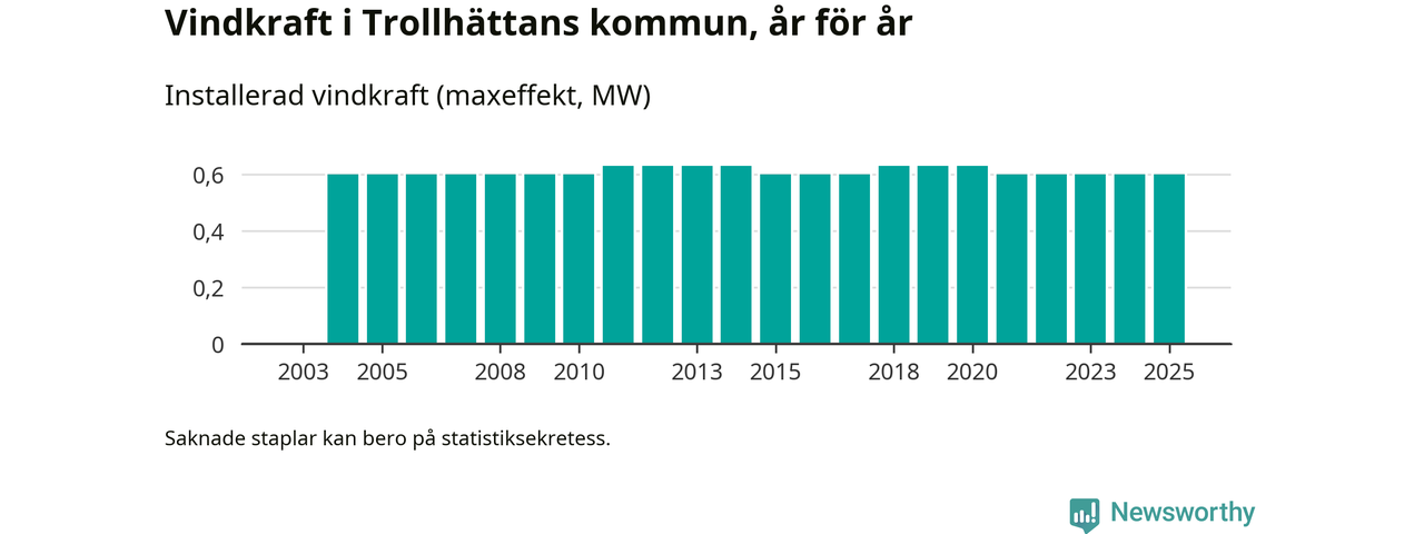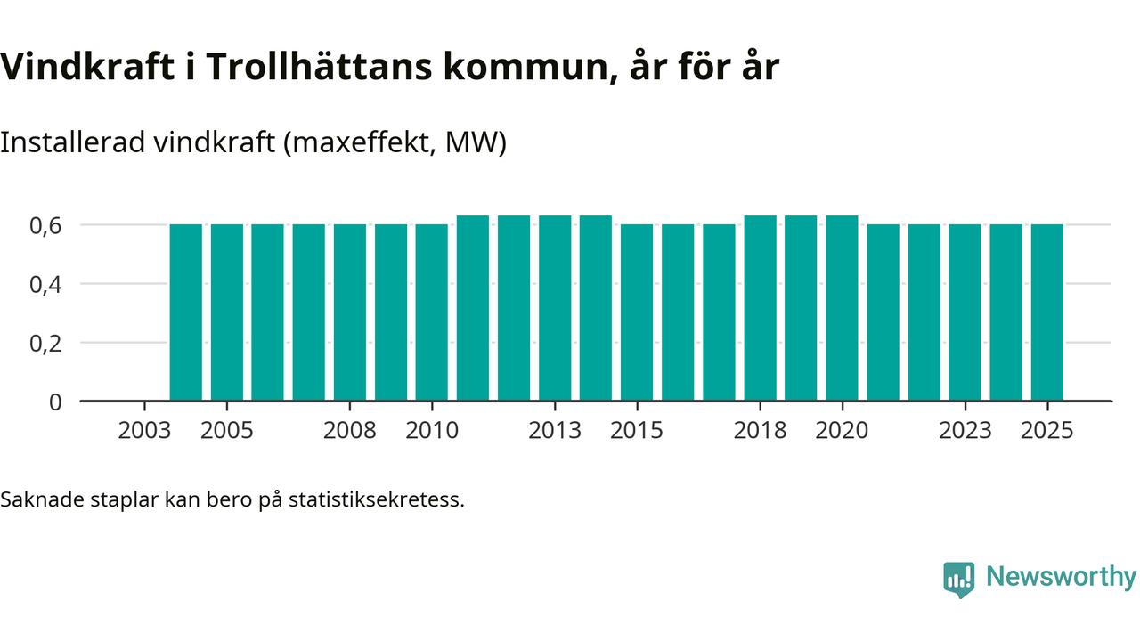 Totalt fanns i slutet av förra året tre vindkraftverk i Trollhättans kommun, med en sammanlagd maxeffekt på 1 megawatt. Det är, för fjärde året i rad, oförändrade siffror jämfört med året innan. Det visar nya siffror från Energimyndigheten.
