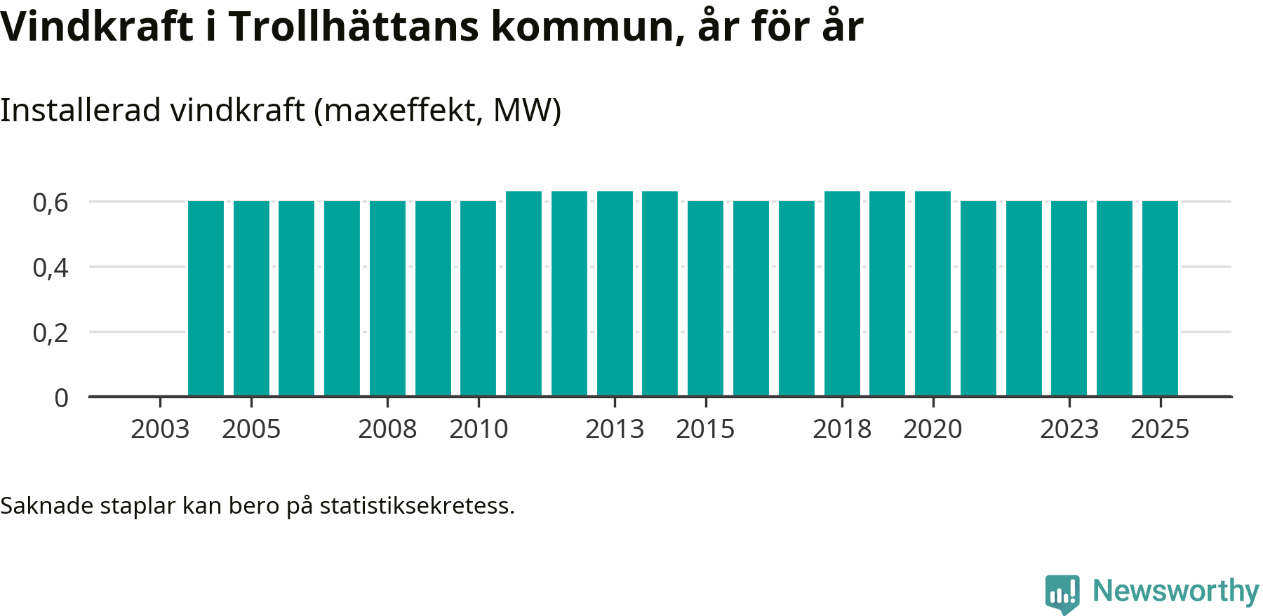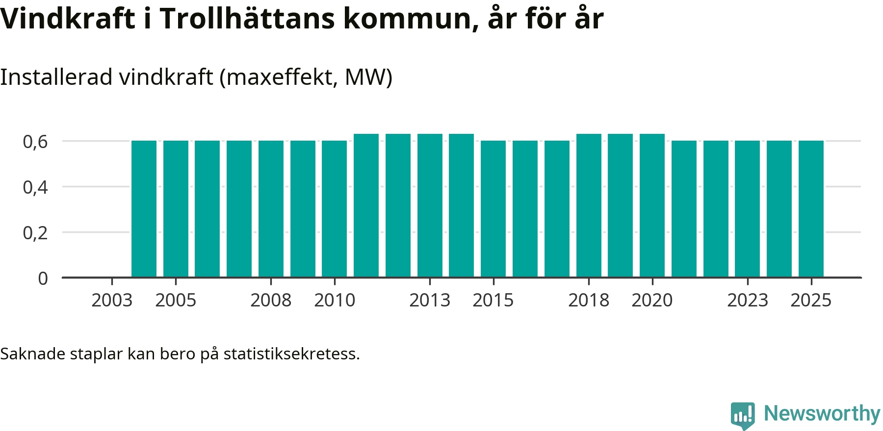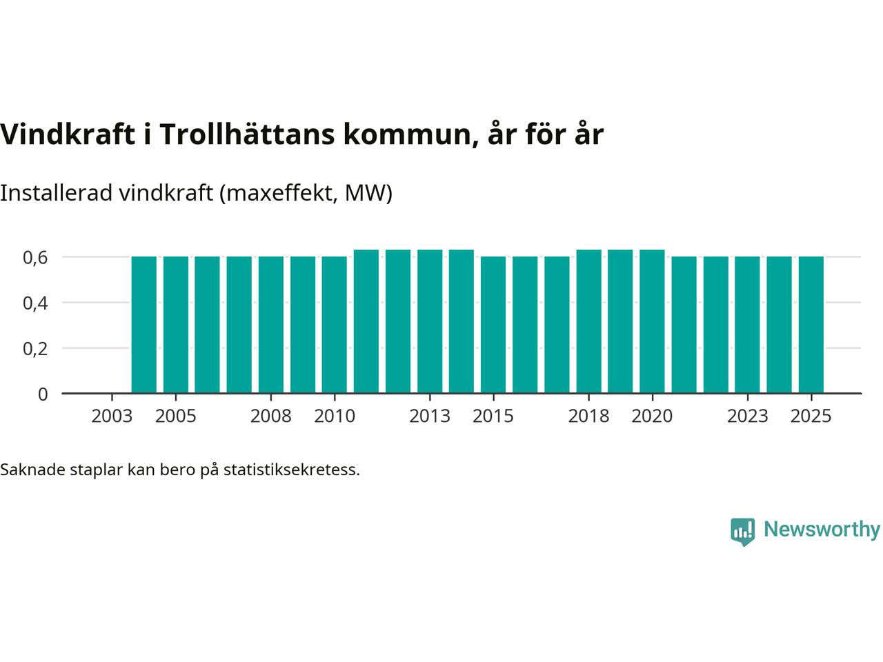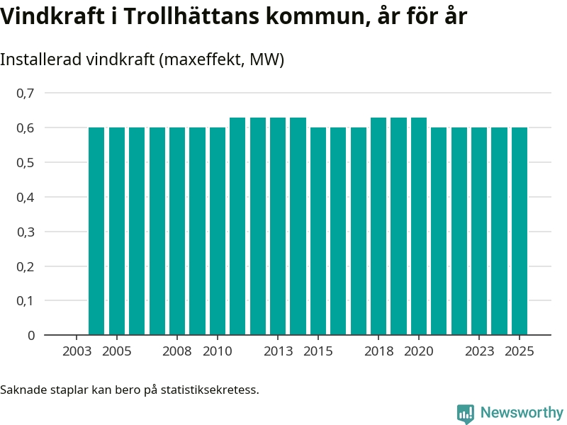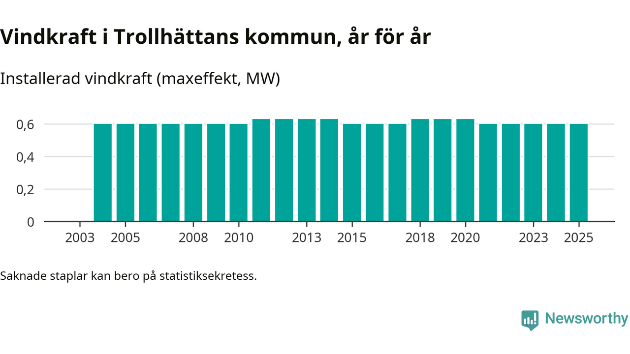 Totalt fanns i slutet av förra året tre vindkraftverk i Trollhättans kommun, med en sammanlagd maxeffekt på 1 megawatt. Det är, för fjärde året i rad, oförändrade siffror jämfört med året innan. Det visar nya siffror från Energimyndigheten.