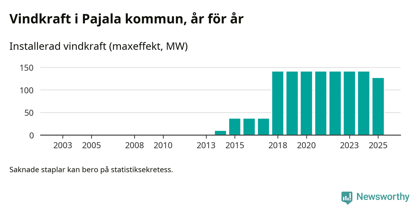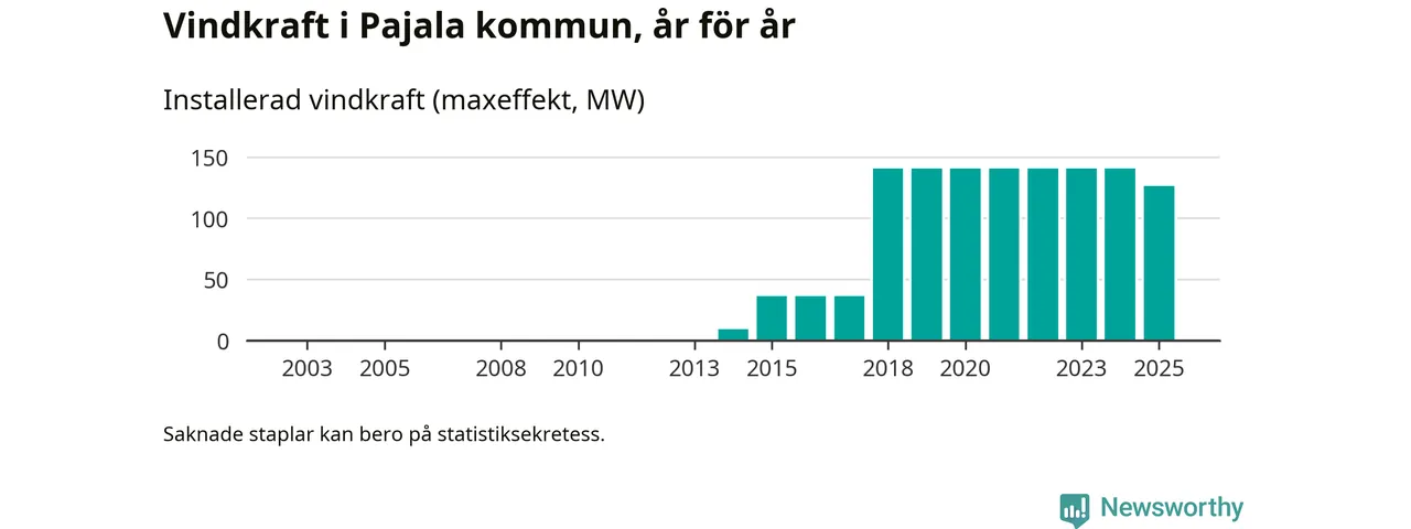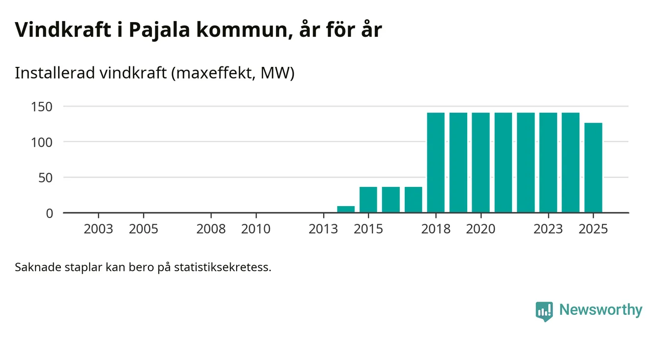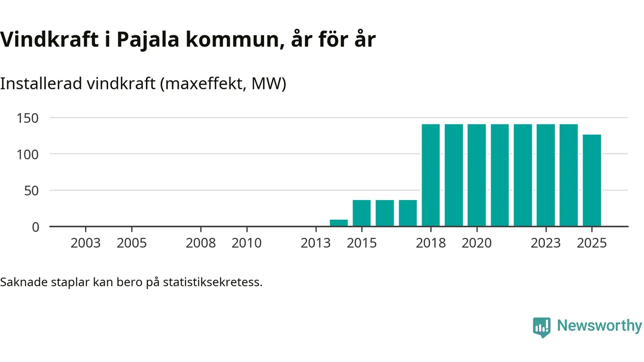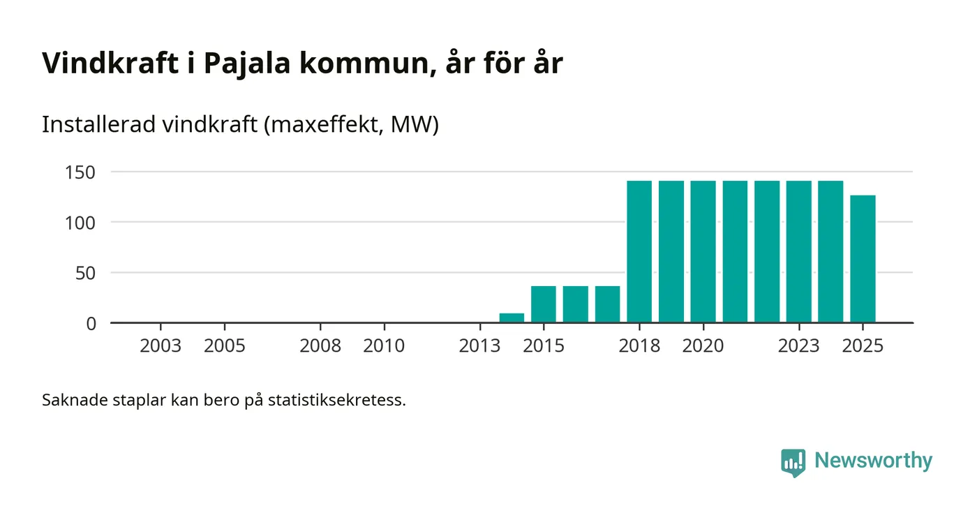 Totalt fanns i slutet av förra året 37 vindkraftverk i Pajala kommun, med en sammanlagd maxeffekt på 126 megawatt. Det är en minskning med 14,4 megawatt 1, jämfört med året innan. Det visar nya siffror från Energimyndigheten.