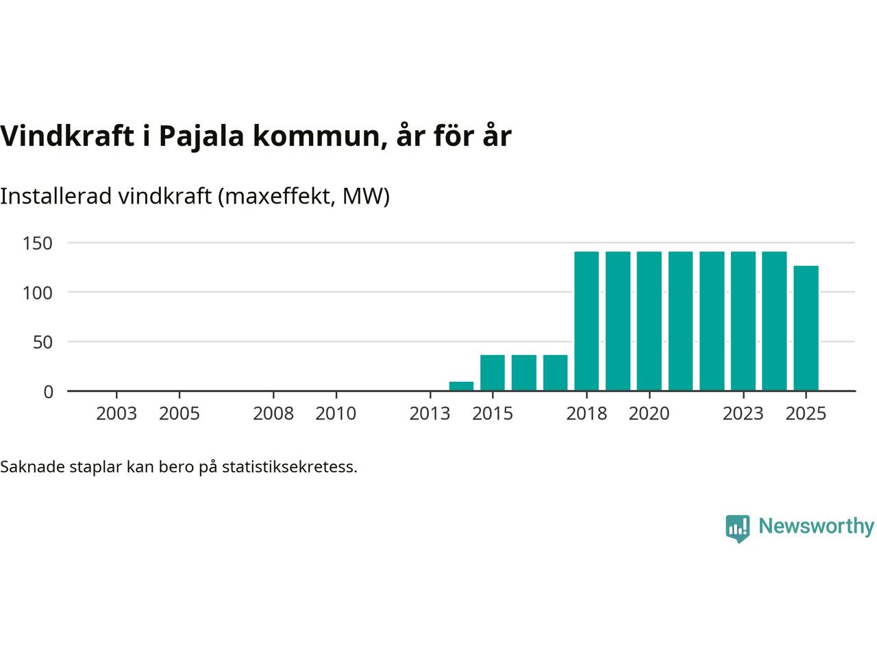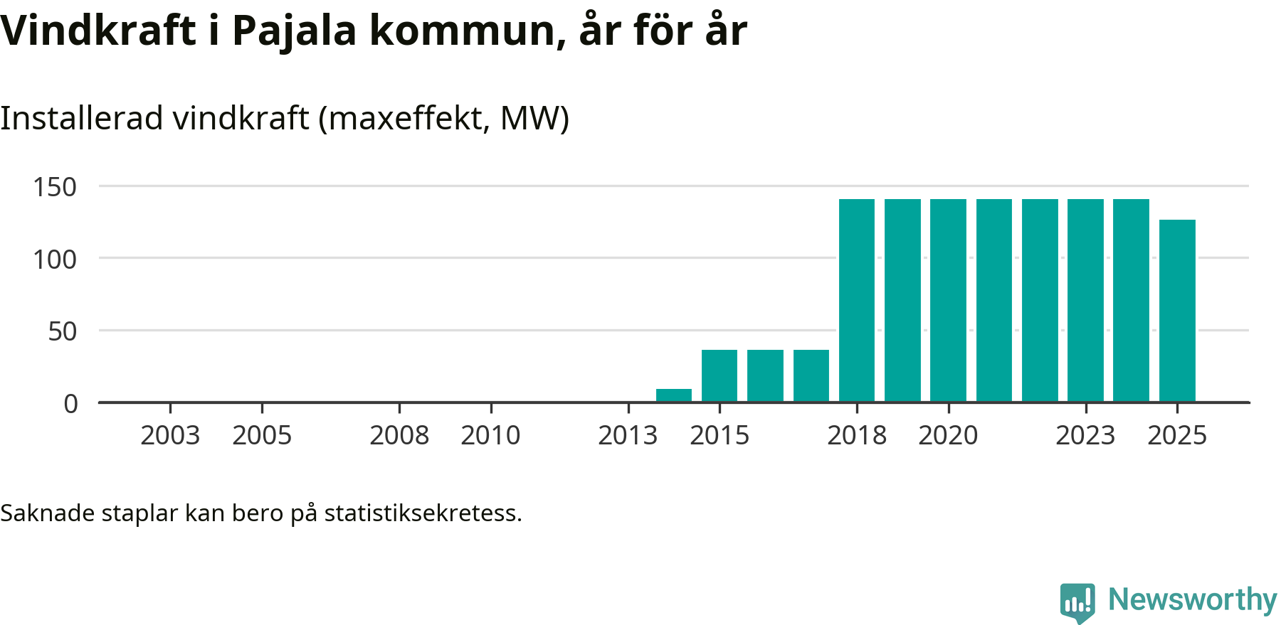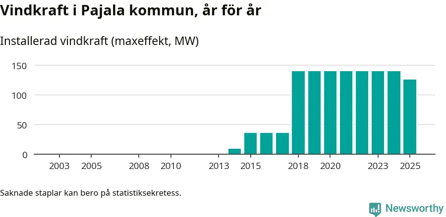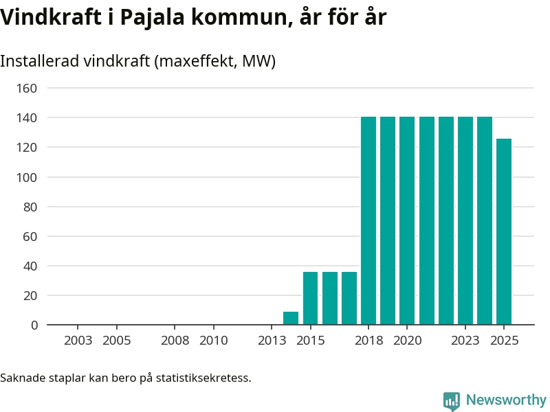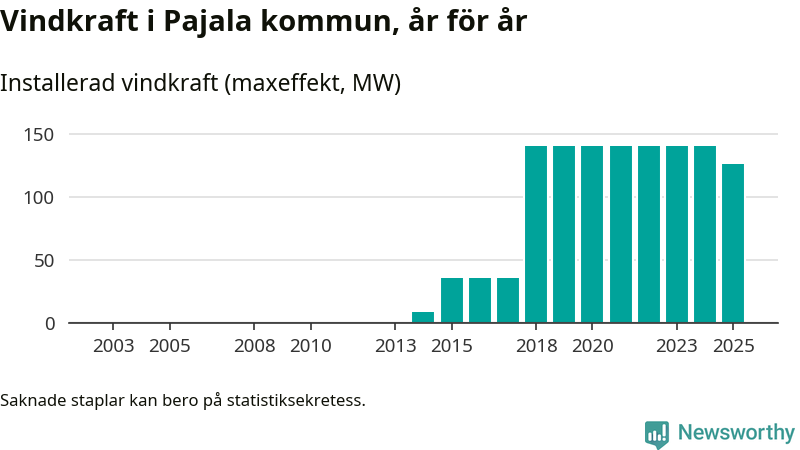 Totalt fanns i slutet av förra året 37 vindkraftverk i Pajala kommun, med en sammanlagd maxeffekt på 126 megawatt. Det är en minskning med 14,4 megawatt 1, jämfört med året innan. Det visar nya siffror från Energimyndigheten.