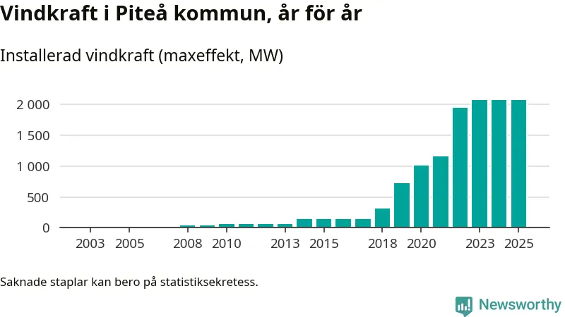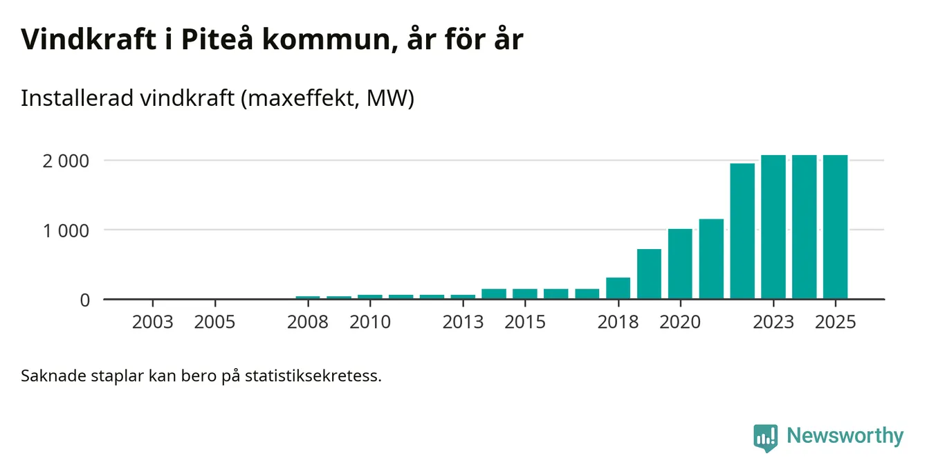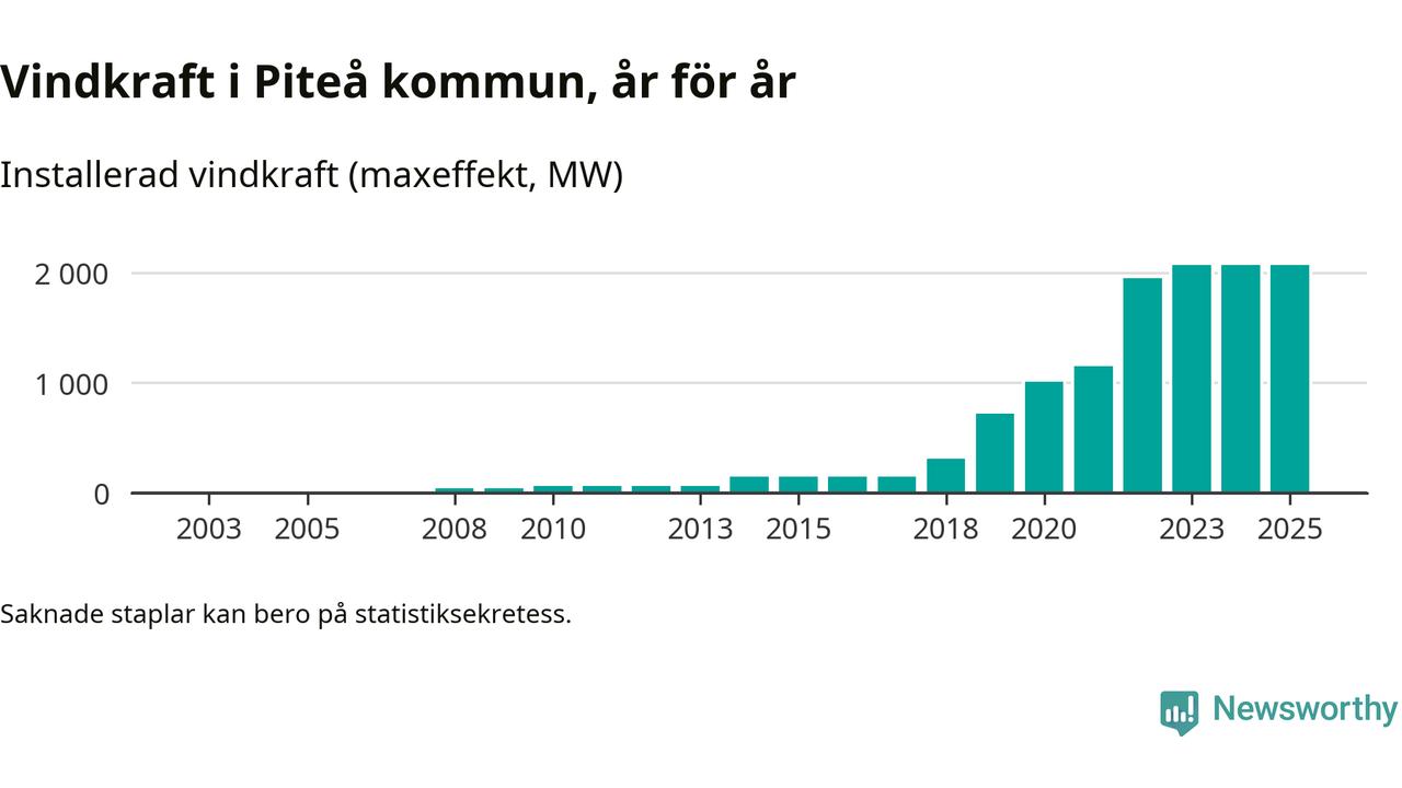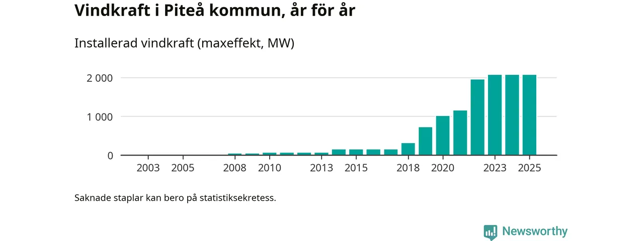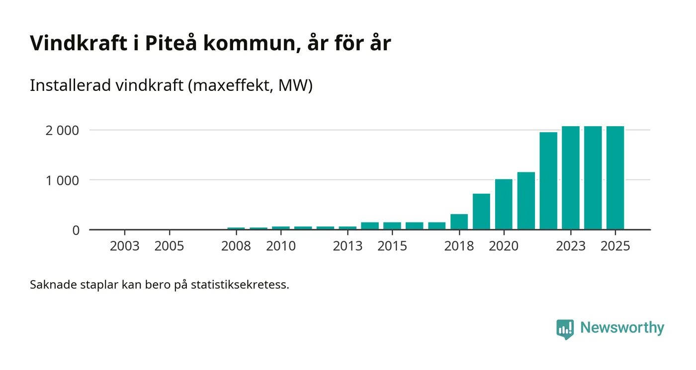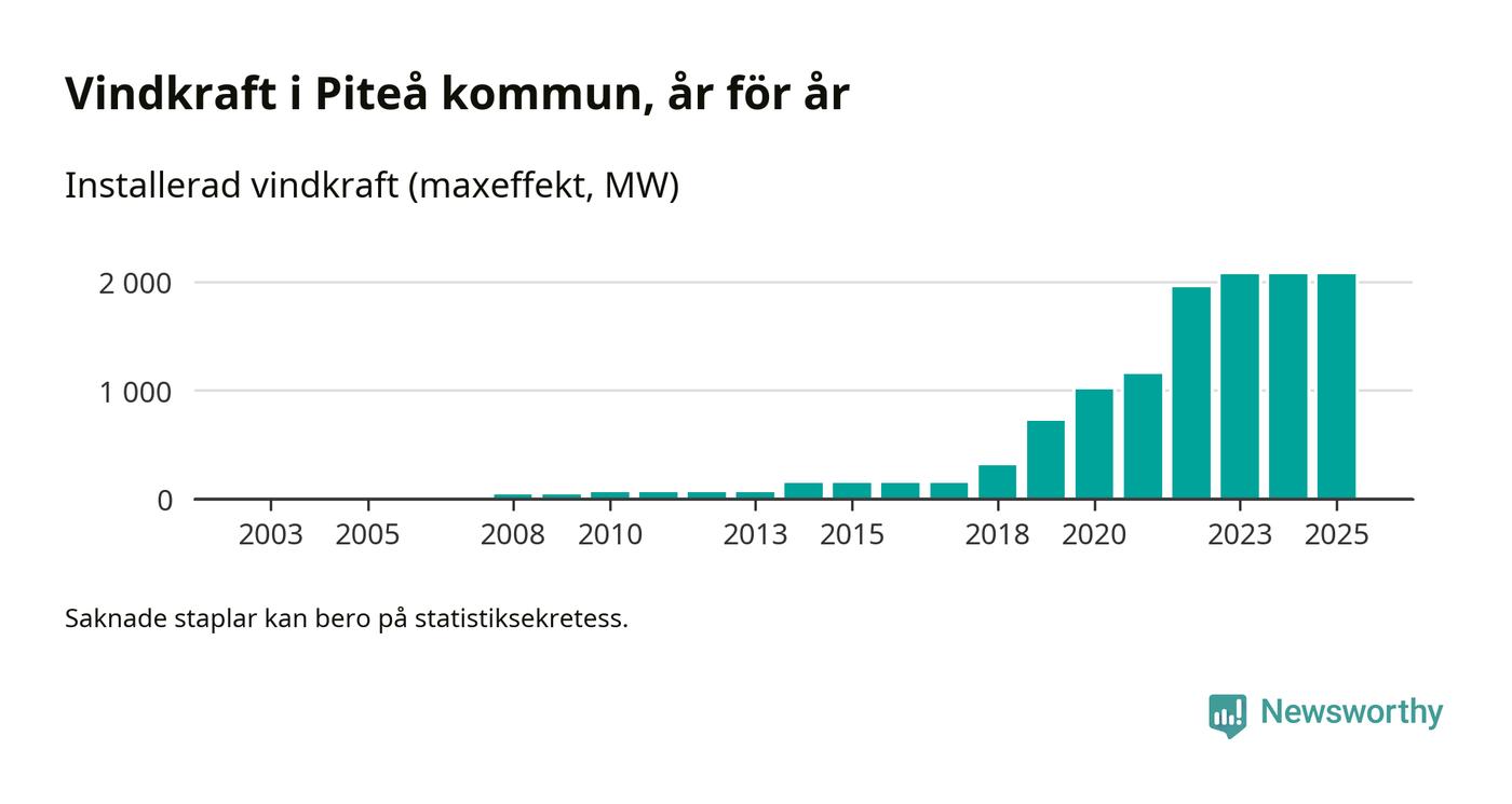 Totalt fanns i slutet av förra året 513 vindkraftverk i Piteå kommun, med en sammanlagd maxeffekt på 2 069 megawatt. Det är, för andra året i rad, oförändrade siffror jämfört med året innan. Det visar nya siffror från Energimyndigheten. I kommunen ligger Sveriges största vindkraftspark, Markbygden.