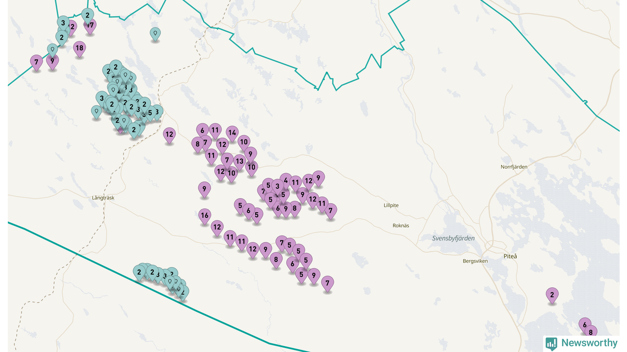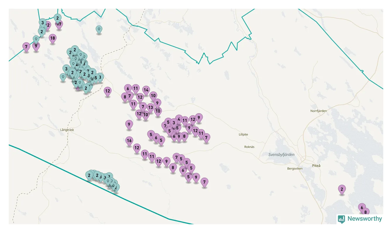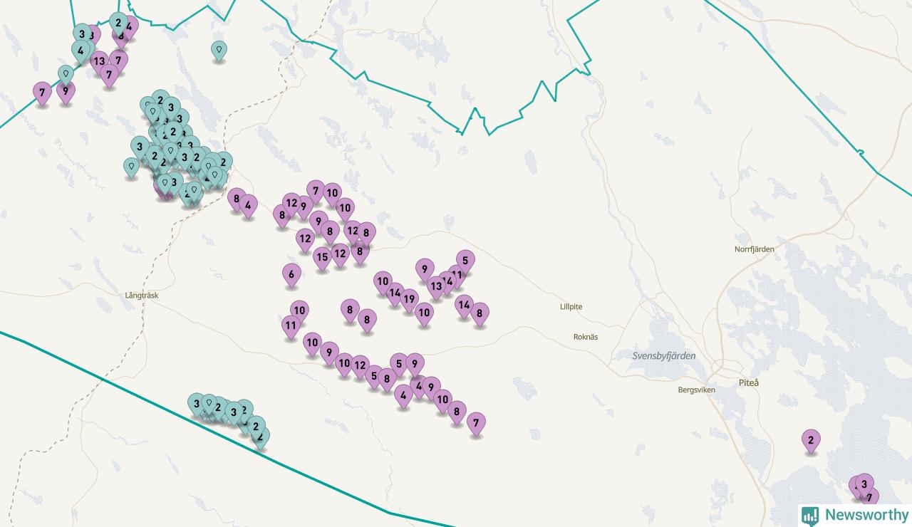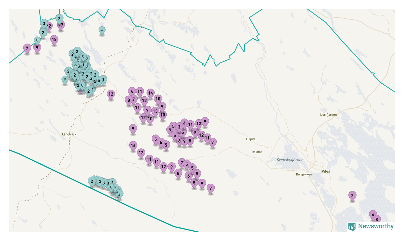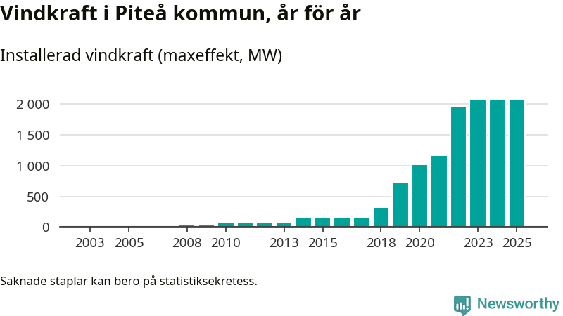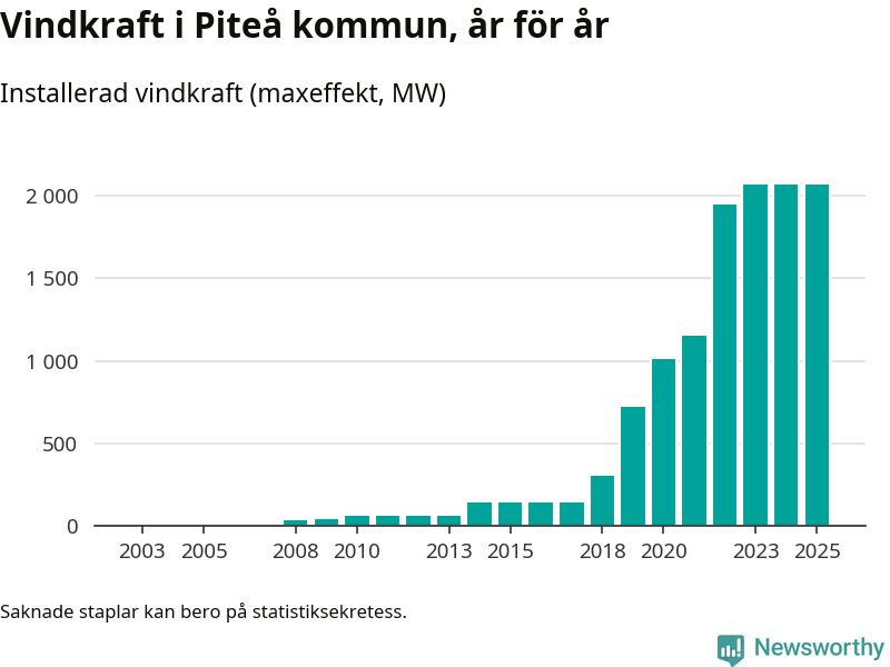 Totalt fanns i slutet av förra året 513 vindkraftverk i Piteå kommun, med en sammanlagd maxeffekt på 2 069 megawatt. Det är, för andra året i rad, oförändrade siffror jämfört med året innan. Det visar nya siffror från Energimyndigheten. I kommunen ligger Sveriges största vindkraftspark, Markbygden.